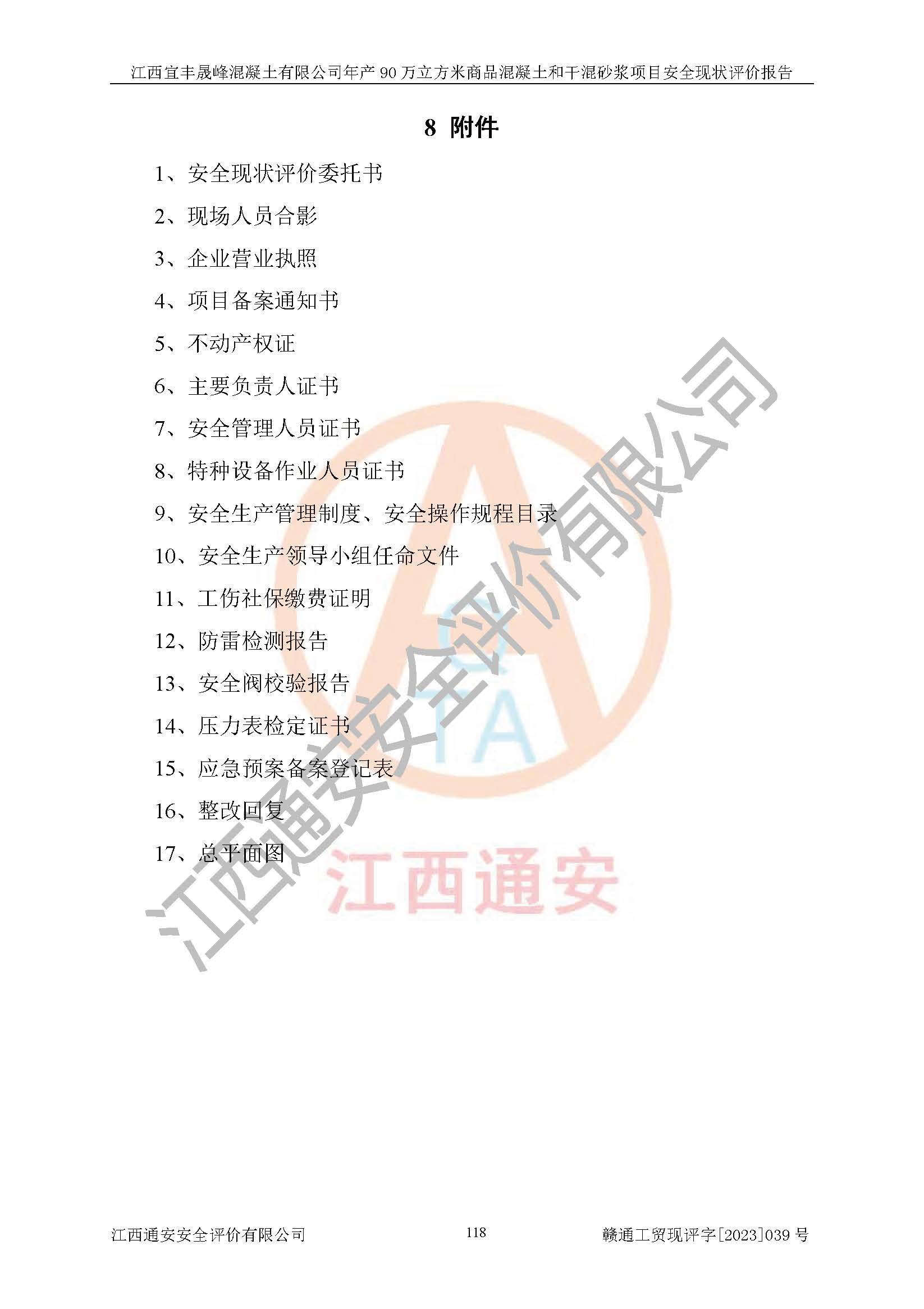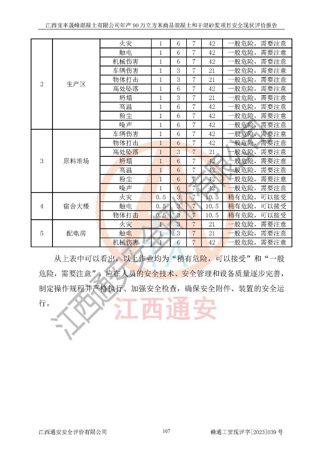 项目名称 | 江西宜丰晟峰混凝土有限公司年产90万立方米商品混凝土和干混砂浆项目安全现状评价报告 | ||||