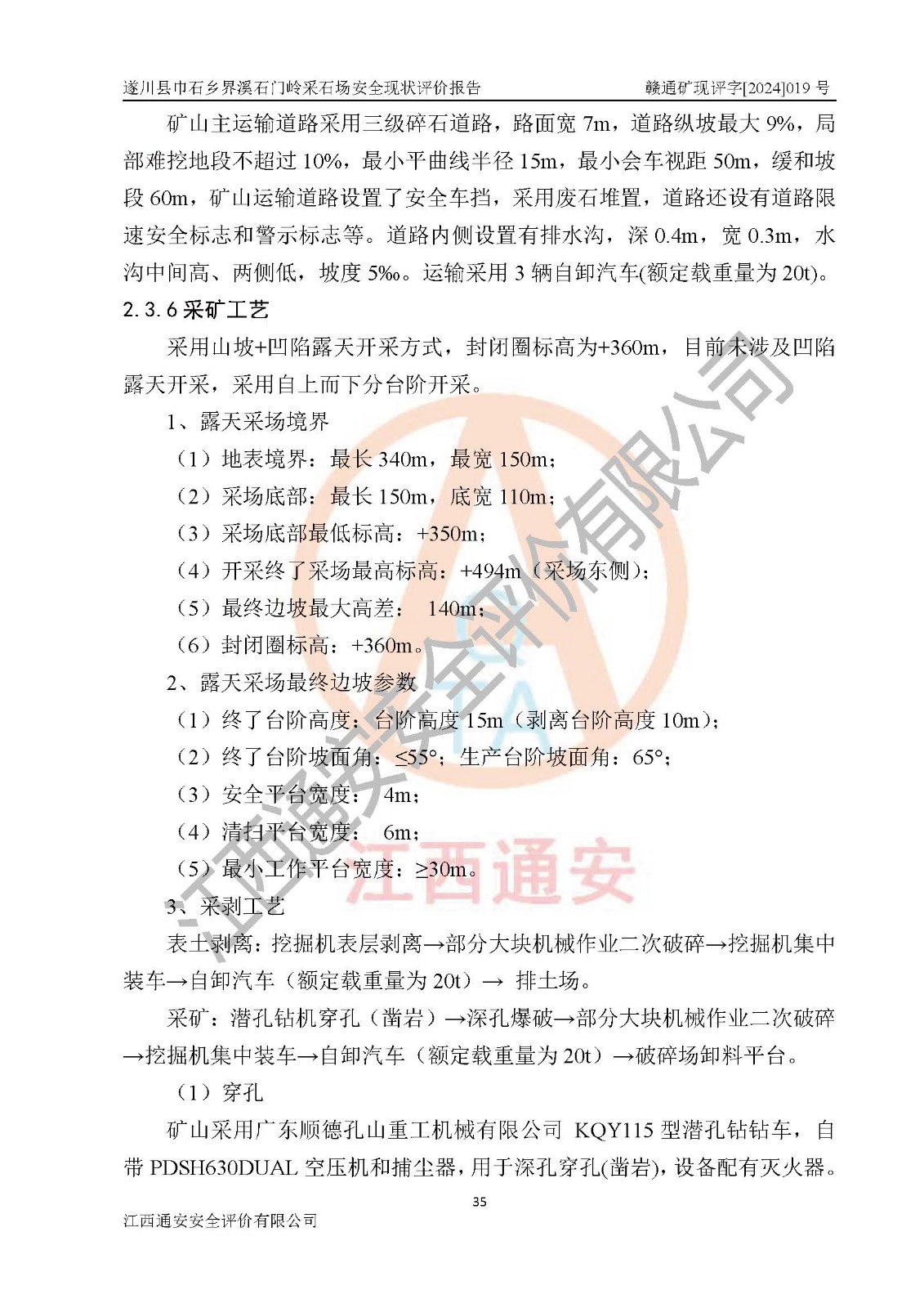 项目简介 | 遂川县巾石乡界溪石门岭采石场位于遂川县县城165º方位直距约15**处,行政区划隶属遂川县巾石乡管辖。矿区位置地理坐标:东经114°37′07″~114°37′21″,北纬26°15′22″~26°15′38″。矿区中心位置地理坐标:东经114°37′14″,北纬26°15′30″。矿区西距105国道直线约0.6km,并有矿区水泥公路与之相连,交通较便利。 矿山采用开拓公路汽车运输,矿山上山公路从矿区办公室往东南侧进入卸料平台向采场约100m三级碎石道路至采场+395m以下各台阶;矿山经过多年的开采,自上而形成了+490m、+480m、+470m、+455m、+440m、+425m共6个台阶已到设计*终边坡,其中:矿区东侧采场+490m、+480m、+470m为安全平台,平台宽度4m,台阶**10m,台阶坡面角为65°;+455m为清扫平台,平台宽度6m,台阶**15m,台阶坡面角为65°;+440m、+425m为安全平台,平台宽度4m,台阶**15m,台阶坡面角为65°。矿区西侧采场自上而下开采形成:+445m、+435m、+425m共3个台阶均为安全平台,平台宽度4m,台阶**10m,台阶坡面角为65°;+410m台阶矿区东侧采场和矿区西侧采场合并为一个采场开采的台阶,+410m为清扫平台,平台宽度6m,台阶**15m,台阶坡面角为65°。 2022年3月,矿山取得吉安市应急管理局颁发的安全生产标准化三级企业(非煤矿山)证书,证书编号:(吉)AQBKⅢ20220004,**期至2025年3月。 | ||||