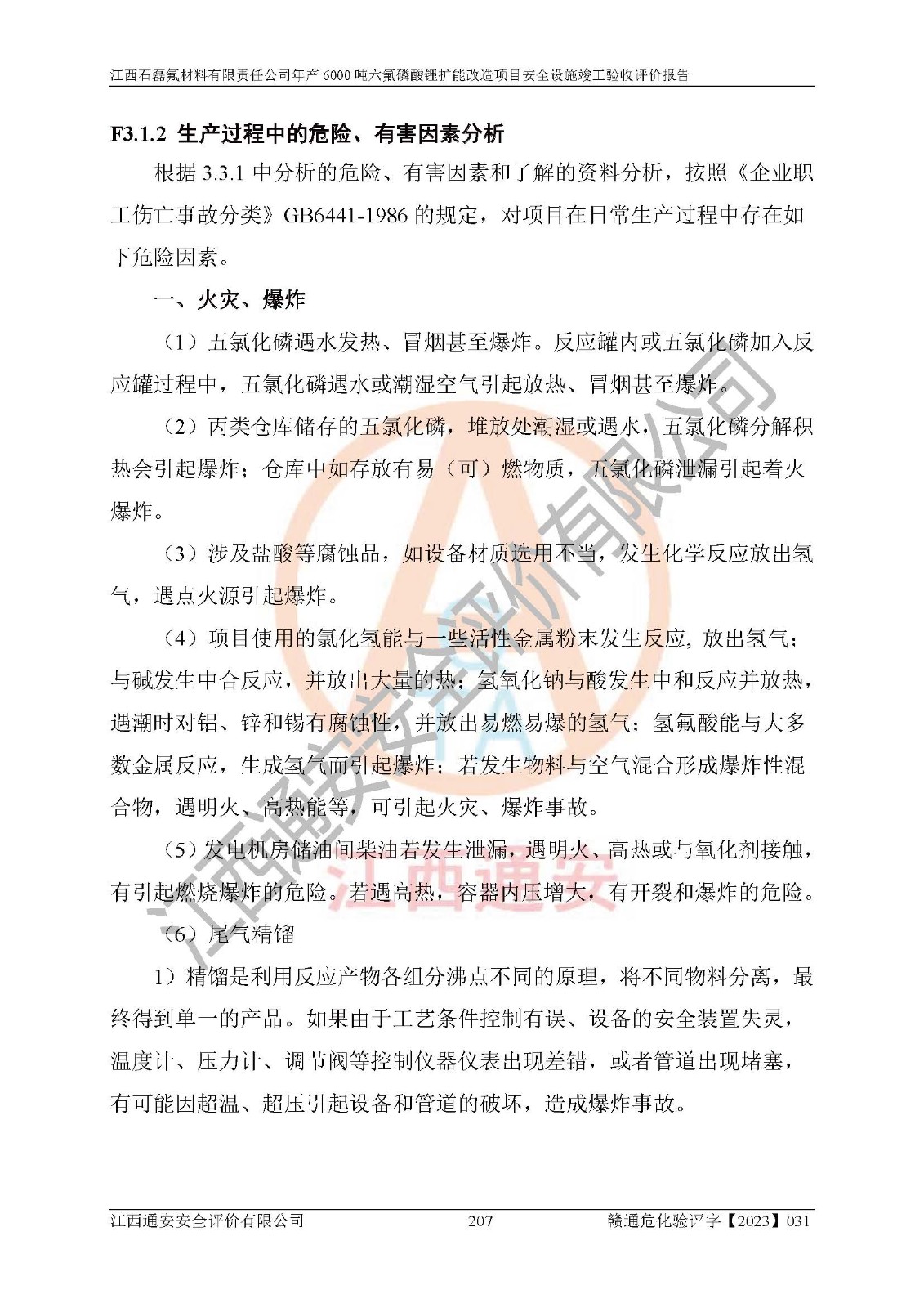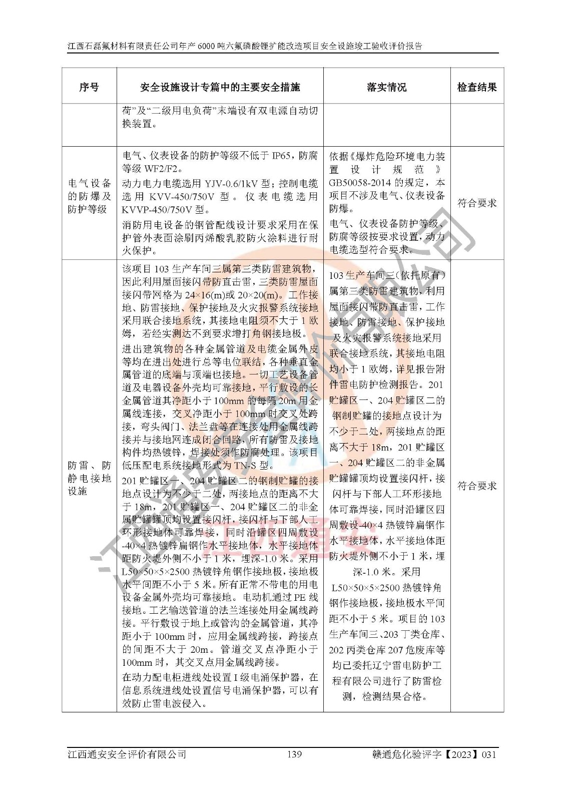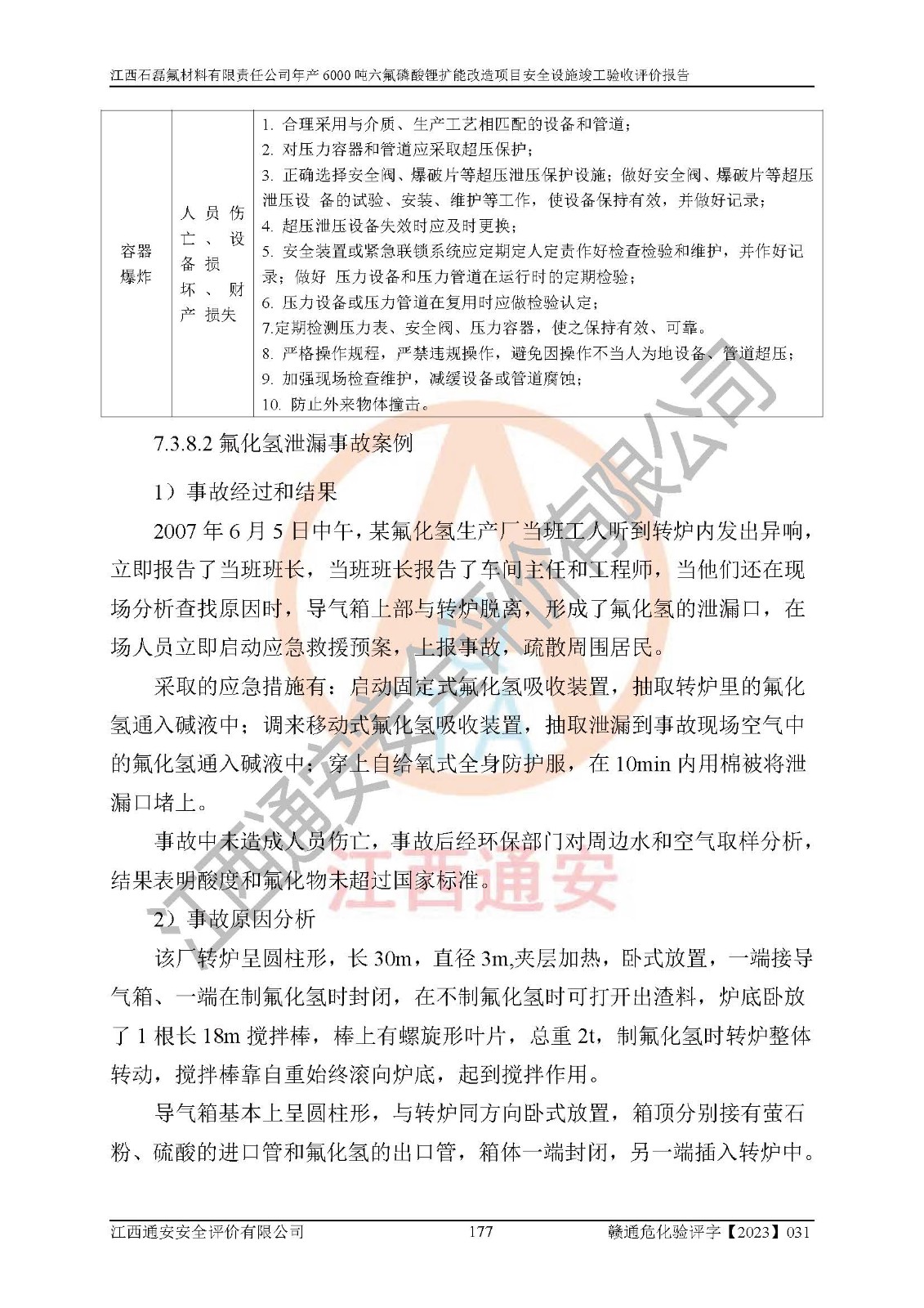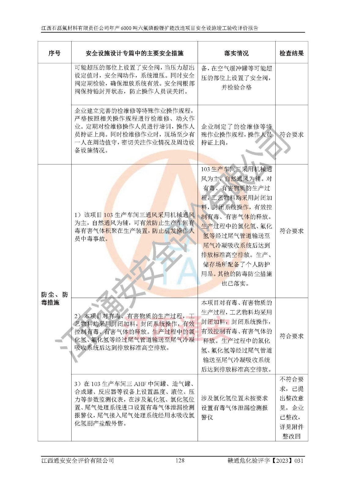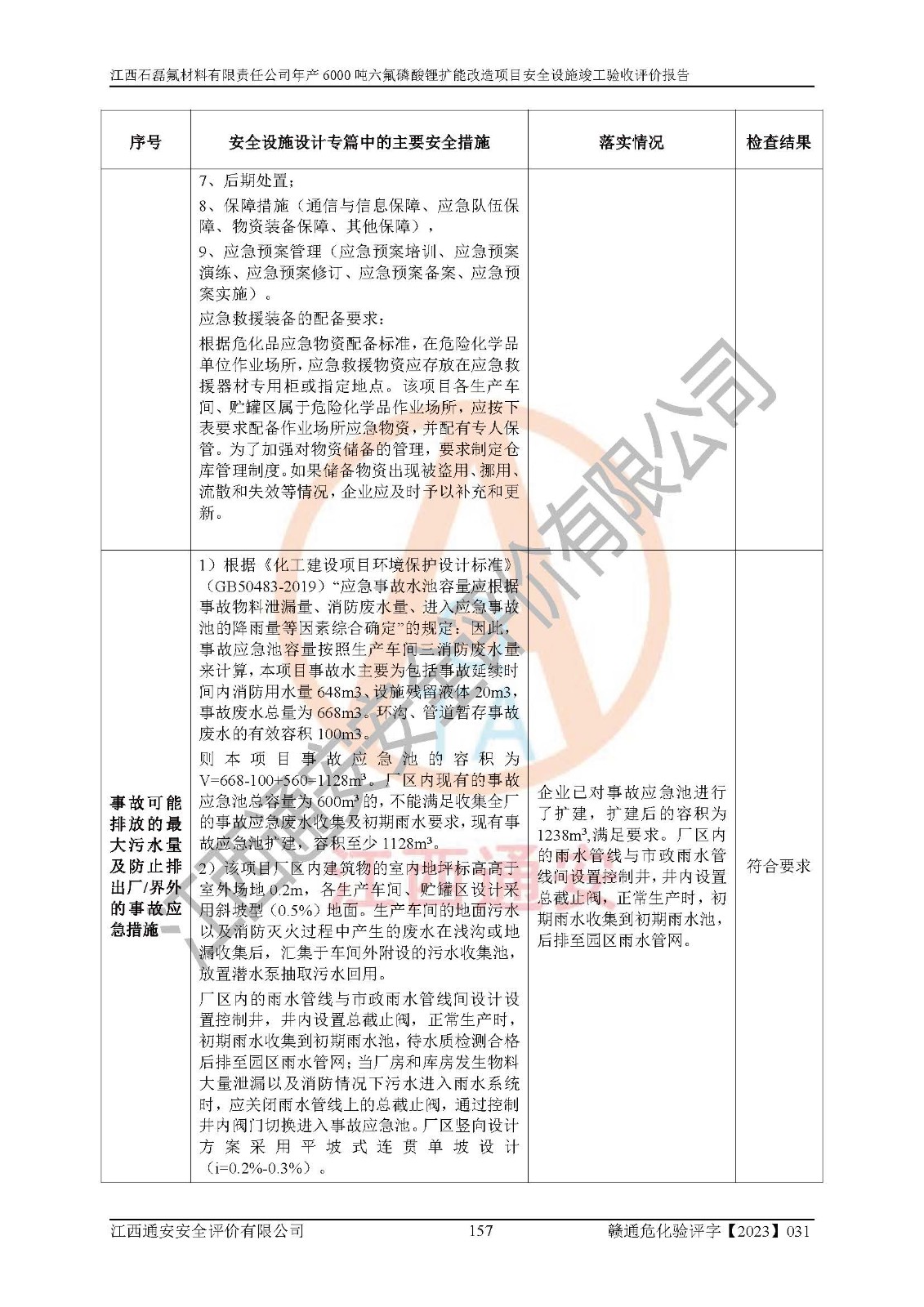 一、建设项目所在地的安全条件和与周边的安全防护距离 (1)该项目位于江西省赣州市会昌县氟盐化工产业基地,属于认定的化工园区,厂址选择合理,该项目与周边环境的防火间距符合规范的要求。 (2)重大危险源与“八类敏感场所及区域”的距离符合相关法律、法规的规定。 (3)该项目103生产车间三和201罐区一均构成**重大危险源。根据《危险化学品生产装置和储存设施外部安全防护距离确定方法》(GB/T 37243-2019)和《危险化学品生产装置和储存设施风险基准》(GB 36894-2018),该项目高敏感防护目标、重要防护目标、一般防护目标中的一类防护目标(<3×10-7)的外部安全防护距离包络线距离厂界*大值为76.36m,个人风险等值线范围内未出现该类防护目标;一般防护目标中的二类防护目标(<3×10-6)的外部安全防护距离包络线距离厂界*大值为51.62m,个人风险等值线范围内未涉及相应的防护目标;一般防护目标中的三类防护目标(<1×10-5)外部安全防护距离的包络线未出厂界。项目外部安全防护距离内无相应的防护目标,该项目不存在社会风险。 (4)该项目投产后在正常生产情况下,对其周边单位的生产、经营活动和居民的生活影响很小。在发生事故的情况下对周边单位的生产、经营活动和居民的生活存在影响。该项目周边单位的生产、经营活动和居民的生活对该项目投产后的正常生产影响很小。该项目所在地自然条件(不包括地震等破坏力**的自然灾害)的变化对该项目投产后的正常生产没有影响。 二、建设项目安全设施设计的采纳情况和已采用(取)的安全设施水平 该项目采用的主要安全设施包括了以下方面:检测、报警设施,设备安全防护设施,作业场所防护设施,安全警示标志,泄压和止逆设施,紧急处理设施,防止火灾蔓延设施,灭火设施,紧急个人处置设施,应急救援设施,劳动防护用品和装备等。 该项目在建设过程中采纳了《安全设施设计专篇》中的有关安全措施建议及要求,针对性的采取了相应的预防和控制措施,建设中未落实的安全措施,在试生产中已进行了整改。试生产表明该项目所采取的安全控制措施安全**,主要生产装置、设备运行平稳,安全可靠,安全水平较高,能够满足安全生产条件。 三、建设项目试生产(使用)后具备**现行有关安全生产法律、法规和部门规章及标准规定和要求的安全生产条件 1)法律法规等方面的符合性:该项目按照建设项目“三同时”要求,项目进行了备案、通过了安全条件审查、安全设施设计审查、试生产方案审查,立项审批手续齐全,安全设施设计、建设施工、施工监理均由有资质的单位承担,项目建设符合法律、法规规定的审批、施工、监理手续。项目建设期间,公司结合生产需要,增设了部分辅助设施和工艺管线,属于一般变更,试生产期间公司已委托河北英科石化工程有限公司进行了设计变更,作为已经审查通过的安全设施设计专篇的补充文件。 2)该项目与周边建构筑物的防火距离符合《精细化工企业工程设计防火标准》《建筑设计防火规范》的要求。根据《危险化学品生产装置和储存设施风险基准》GB36894-2018确定危险化学品单位周边重要目标和敏感场所承受的可容许个人风险和社会风险的定量风险评价。项目的个人风险计算结果表明,项目外部安全防护距离的包络线内无相应的防护目标。该软件未计算出社会风险。因此项目可容许个人风险和社会风险均在可接受范围内。 3)平面布置及常规防护设施措施的合理性:该项目生产场所、办公场所之间的间距满足安全要求,建筑结构、防火分区、防雷设施、安全出口的设置等满足安全生产的要求。消防道路的净宽度、净**、转弯半径均满足运输**及消防**通行。设置的常规防护设施、防止机械伤害、防急性中毒窒息的设施和措施符合要求。 4)设施、设备、装置及工艺方面的安全性:无**明令淘汰的工艺和 设备,该项目不涉及爆炸性危险区域划分。生产工艺操作和设置的安全设施满足安全需要,生产设施的布置能**人员疏散安全及操作方便。设施、设备、装置及工艺方面安全可靠。 5)特种设备、强制检测设备设施监督检验情况:该项目特种设备均进行了检验检测,并取得了检验报告;安全阀、压力表、有毒气体探头也进行了校验,校验结论合格,特种设备及安全附件符合《特种设备安全监察条例》 等相关法律法规、条例的规定。 6)公用工程、辅助设施的配套性:为该项目生产配套的供水、供电、 供气、供热等满足需要。 7)人员管理及安全培训方面充分性:公司现已建立了安全管理机构, 配备了专职安全管理人员。主要负责人王成具备化学工程与工艺专业本科学历,分管生产负责人曾中山具备化学工程与工艺专业本科学历,分管设备和技术负责人刘辉涛具备应用化学专业本科学历。专职安全管理人员共4人,配有一名注册安全工程师,专职安全管理人员均具有大专以上化工及安全专业相关学历。重点监管化工工艺的生产装置、储存设施操作人员具备高中及以上学历或化工类中等及以上职业教育水平。该公司制定了较完善的安全管理制度、岗位责任制、安全操作规程,制度执行情况较好。该公司已为从业职工交纳了工伤**。该公司对操作员工进行相关的培训和教育,经培训合格后上岗。 8)应急救援**性:企业根据自身实际情况,将该项目按照《生产经 营单位生产安全事故