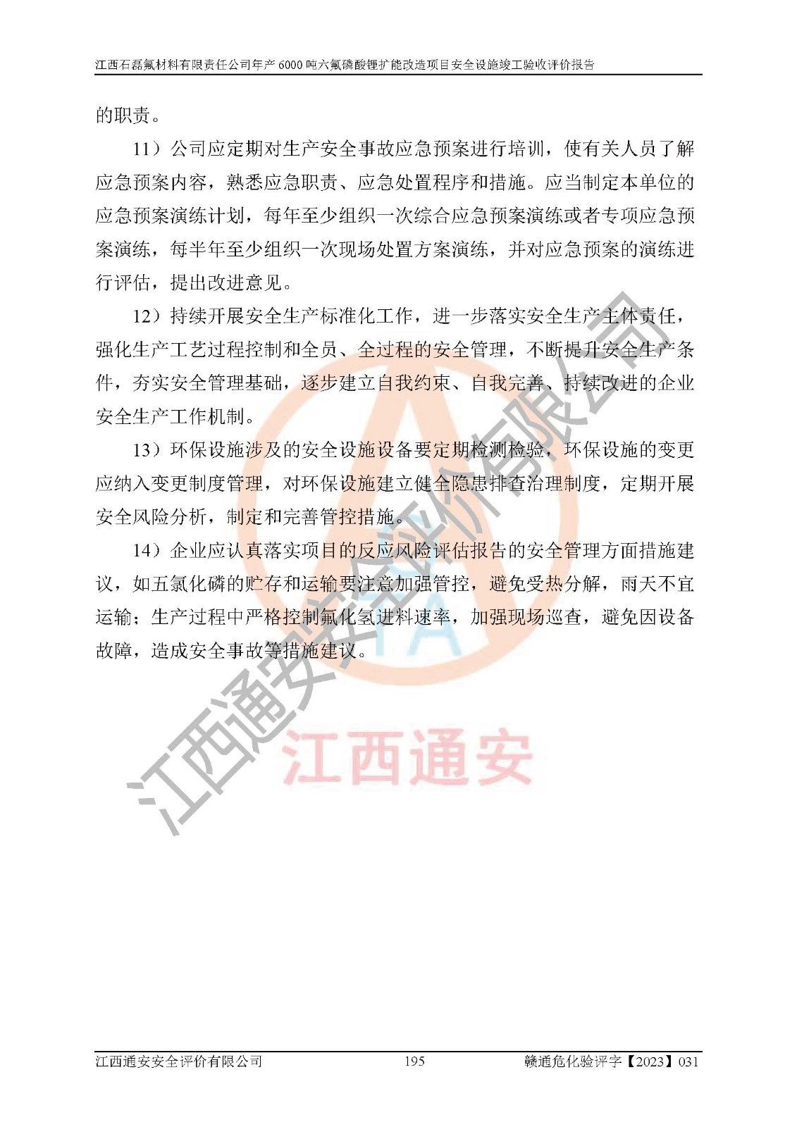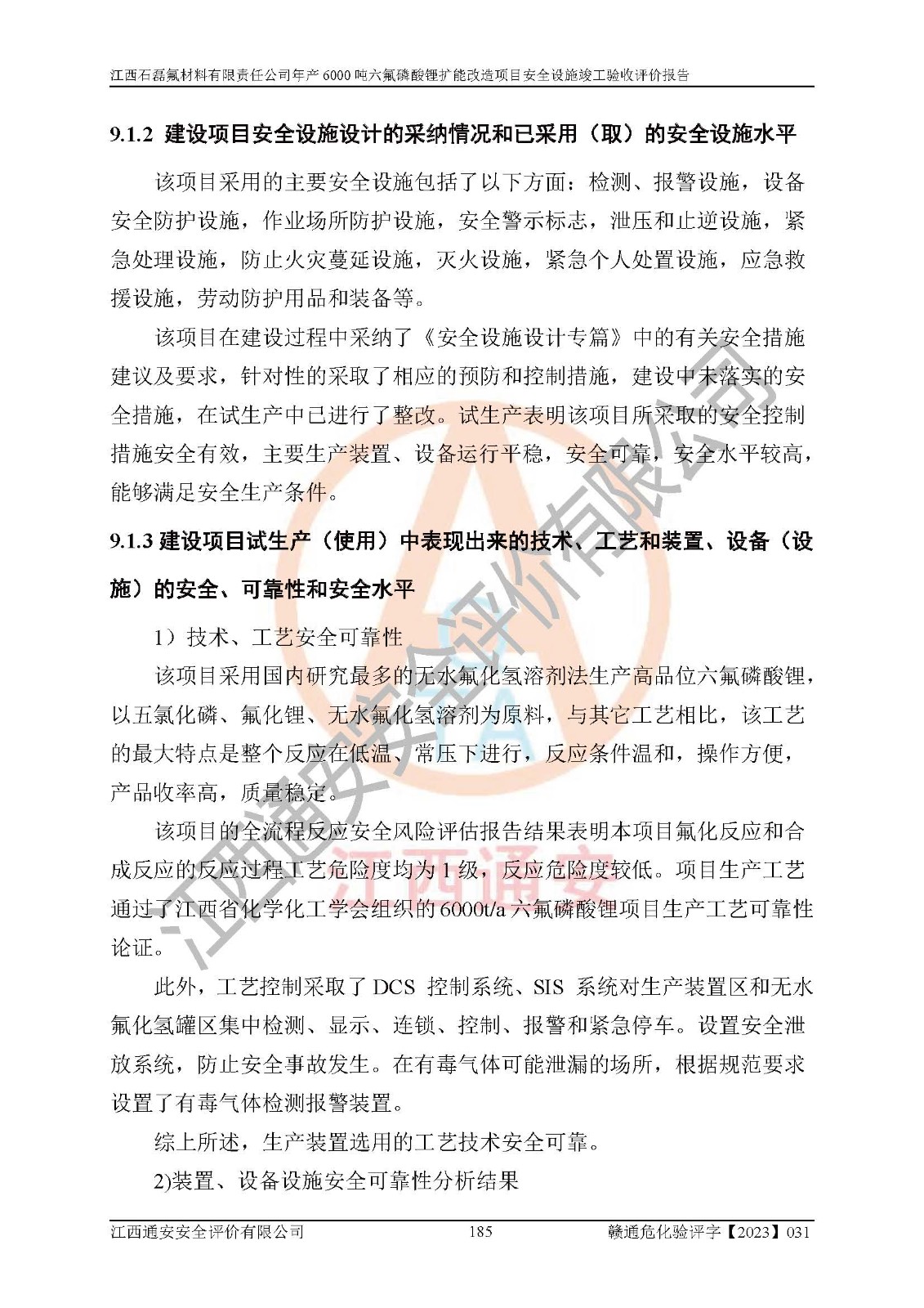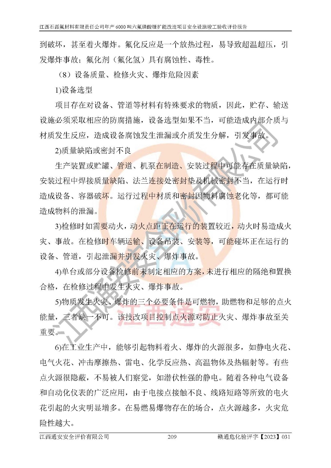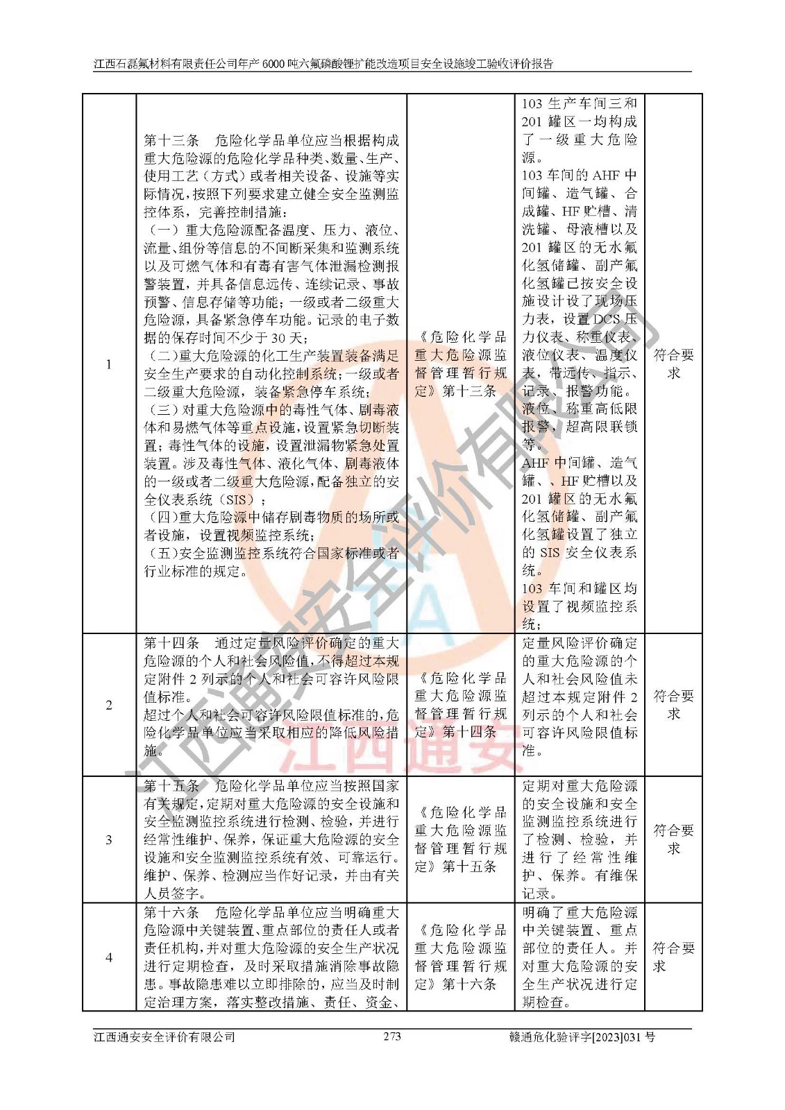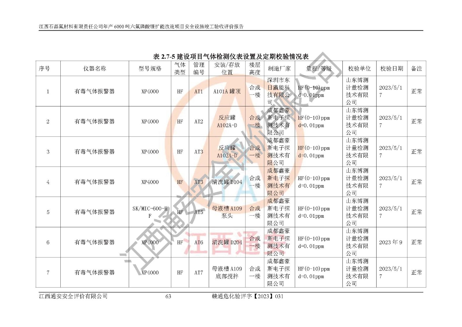 一、建设项目所在地的安全条件和与周边的安全防护距离 (1)该项目位于江西省赣州市会昌县氟盐化工产业基地,属于认定的化工园区,厂址选择合理,该项目与周边环境的防火间距符合规范的要求。 (2)重大危险源与“八类敏感场所及区域”的距离符合相关法律、法规的规定。 (3)该项目103生产车间三和201罐区一均构成**重大危险源。根据《危险化学品生产装置和储存设施外部安全防护距离确定方法》(GB/T 37243-2019)和《危险化学品生产装置和储存设施风险基准》(GB 36894-2018),该项目高敏感防护目标、重要防护目标、一般防护目标中的一类防护目标(<3×10-7)的外部安全防护距离包络线距离厂界*大值为76.36m,个人风险等值线范围内未出现该类防护目标;一般防护目标中的二类防护目标(<3×10-6)的外部安全防护距离包络线距离厂界*大值为51.62m,个人风险等值线范围内未涉及相应的防护目标;一般防护目标中的三类防护目标(<1×10-5)外部安全防护距离的包络线未出厂界。项目外部安全防护距离内无相应的防护目标,该项目不存在社会风险。 (4)该项目投产后在正常生产情况下,对其周边单位的生产、经营活动和居民的生活影响很小。在发生事故的情况下对周边单位的生产、经营活动和居民的生活存在影响。该项目周边单位的生产、经营活动和居民的生活对该项目投产后的正常生产影响很小。该项目所在地自然条件(不包括地震等破坏力**的自然灾害)的变化对该项目投产后的正常生产没有影响。 二、建设项目安全设施设计的采纳情况和已采用(取)的安全设施水平 该项目采用的主要安全设施包括了以下方面:检测、报警设施,设备安全防护设施,作业场所防护设施,安全警示标志,泄压和止逆设施,紧急处理设施,防止火灾蔓延设施,灭火设施,紧急个人处置设施,应急救援设施,劳动防护用品和装备等。 该项目在建设过程中采纳了《安全设施设计专篇》中的有关安全措施建议及要求,针对性的采取了相应的预防和控制措施,建设中未落实的安全措施,在试生产中已进行了整改。试生产表明该项目所采取的安全控制措施安全**,主要生产装置、设备运行平稳,安全可靠,安全水平较高,能够满足安全生产条件。 三、建设项目试生产(使用)后具备**现行有关安全生产法律、法规和部门规章及标准规定和要求的安全生产条件 1)法律法规等方面的符合性:该项目按照建设项目“三同时”要求,项目进行了备案、通过了安全条件审查、安全设施设计审查、试生产方案审查,立项审批手续齐全,安全设施设计、建设施工、施工监理均由有资质的单位承担,项目建设符合法律、法规规定的审批、施工、监理手续。项目建设期间,公司结合生产需要,增设了部分辅助设施和工艺管线,属于一般变更,试生产期间公司已委托河北英科石化工程有限公司进行了设计变更,作为已经审查通过的安全设施设计专篇的补充文件。 2)该项目与周边建构筑物的防火距离符合《精细化工企业工程设计防火标准》《建筑设计防火规范》的要求。根据《危险化学品生产装置和储存设施风险基准》GB36894-2018确定危险化学品单位周边重要目标和敏感场所承受的可容许个人风险和社会风险的定量风险评价。项目的个人风险计算结果表明,项目外部安全防护距离的包络线内无相应的防护目标。该软件未计算出社会风险。因此项目可容许个人风险和社会风险均在可接受范围内。 3)平面布置及常规防护设施措施的合理性:该项目生产场所、办公场所之间的间距满足安全要求,建筑结构、防火分区、防雷设施、安全出口的设置等满足安全生产的要求。消防道路的净宽度、净**、转弯半径均满足运输**及消防**通行。设置的常规防护设施、防止机械伤害、防急性中毒窒息的设施和措施符合要求。 4)设施、设备、装置及工艺方面的安全性:无**明令淘汰的工艺和 设备,该项目不涉及爆炸性危险区域划分。生产工艺操作和设置的安全设施满足安全需要,生产设施的布置能**人员疏散安全及操作方便。设施、设备、装置及工艺方面安全可靠。 5)特种设备、强制检测设备设施监督检验情况:该项目特种设备均进行了检验检测,并取得了检验报告;安全阀、压力表、有毒气体探头也进行了校验,校验结论合格,特种设备及安全附件符合《特种设备安全监察条例》 等相关法律法规、条例的规定。 6)公用工程、辅助设施的配套性:为该项目生产配套的供水、供电、 供气、供热等满足需要。 7)人员管理及安全培训方面充分性:公司现已建立了安全管理机构, 配备了专职安全管理人员。主要负责人王成具备化学工程与工艺专业本科学历,分管生产负责人曾中山具备化学工程与工艺专业本科学历,分管设备和技术负责人刘辉涛具备应用化学专业本科学历。专职安全管理人员共4人,配有一名注册安全工程师,专职安全管理人员均具有大专以上化工及安全专业相关学历。重点监管化工工艺的生产装置、储存设施操作人员具备高中及以上学历或化工类中等及以上职业教育水平。该公司制定了较完善的安全管理制度、岗位责任制、安全操作规程,制度执行情况较好。该公司已为从业职工交纳了工伤**。该公司对操作员工进行相关的培训和教育,经培训合格后上岗。 8)应急救援**性:企业根据自身实际情况,将该项目按照《生产经 营单位生产安全事故