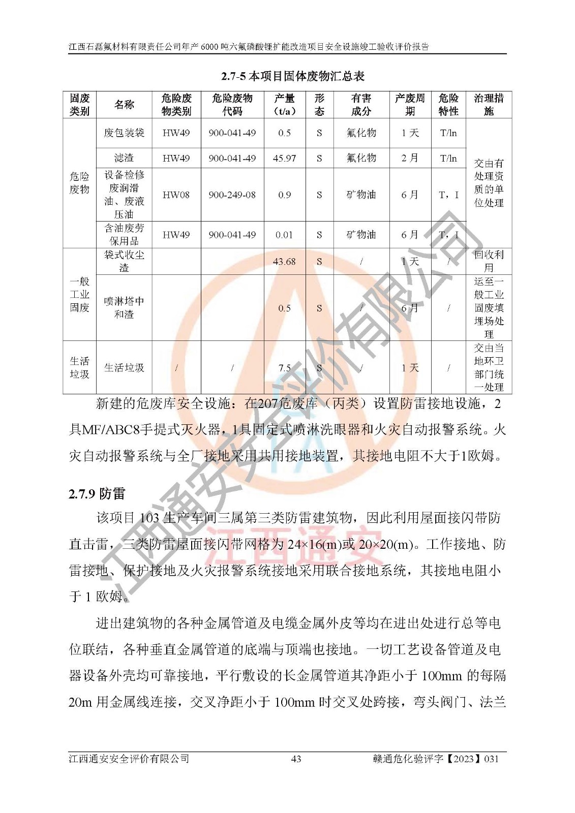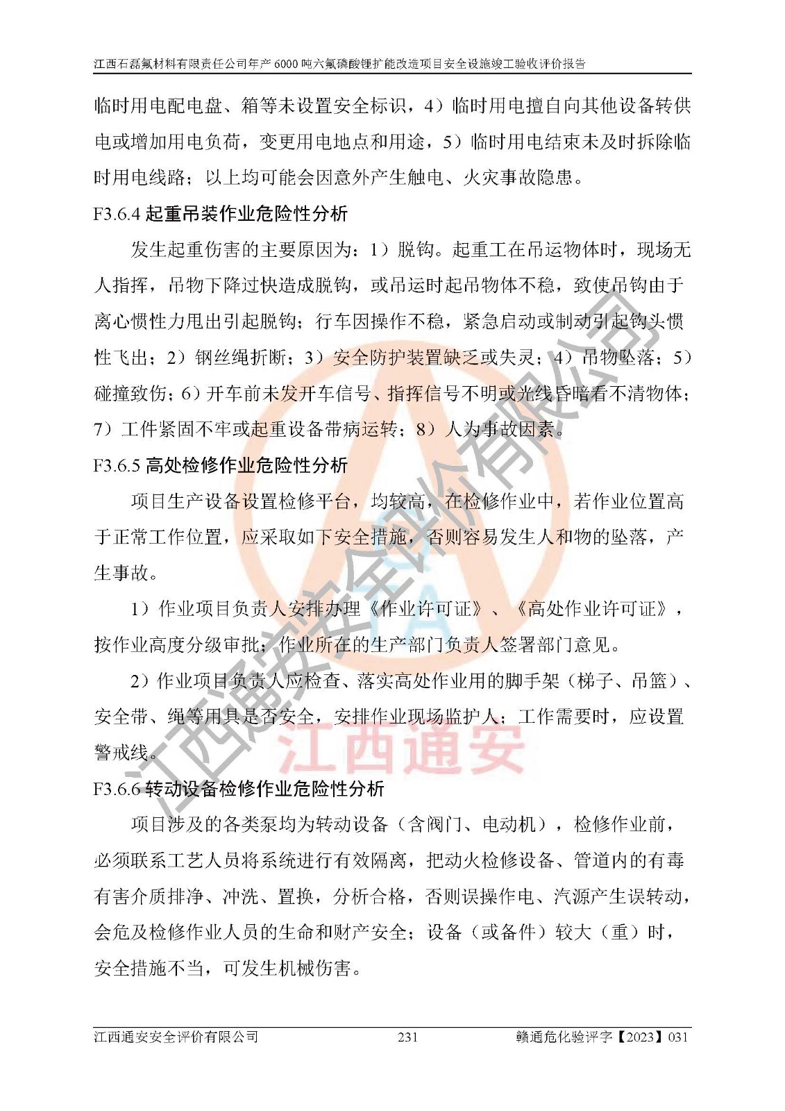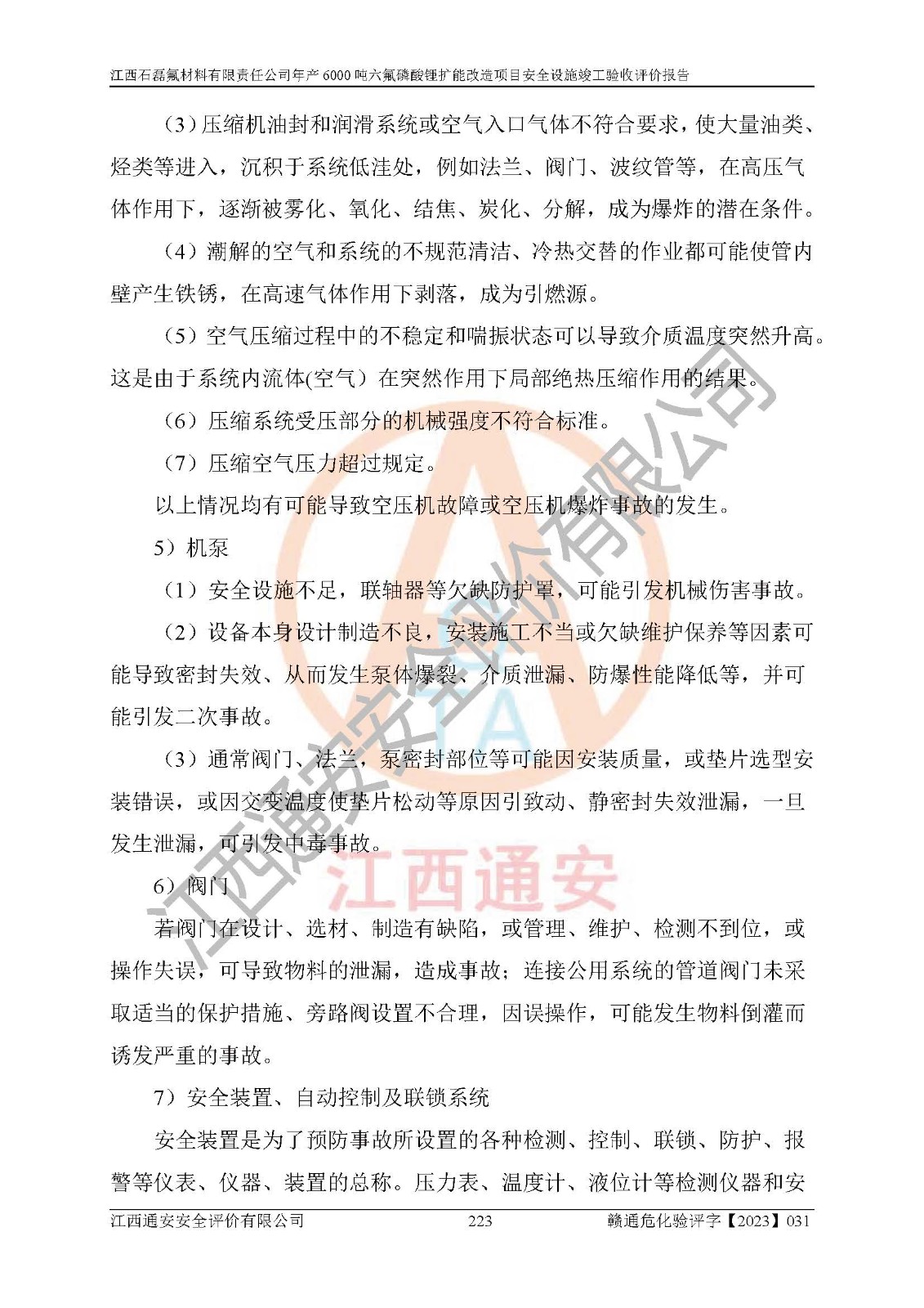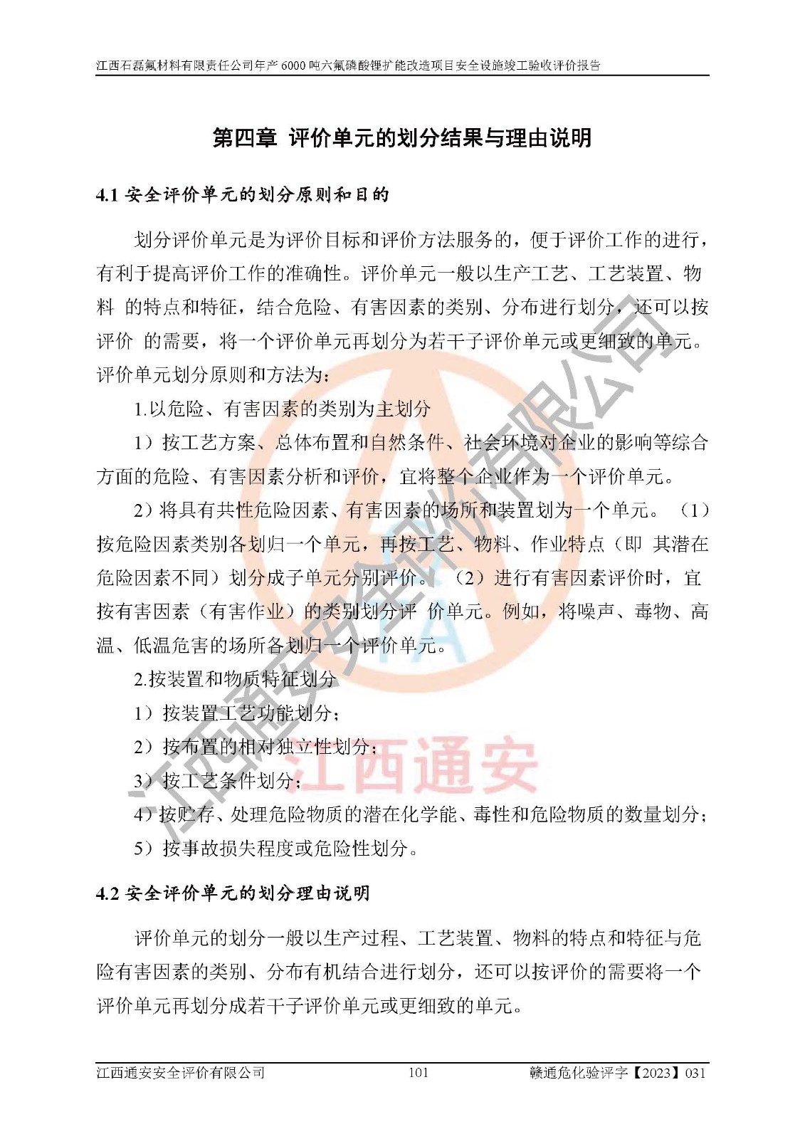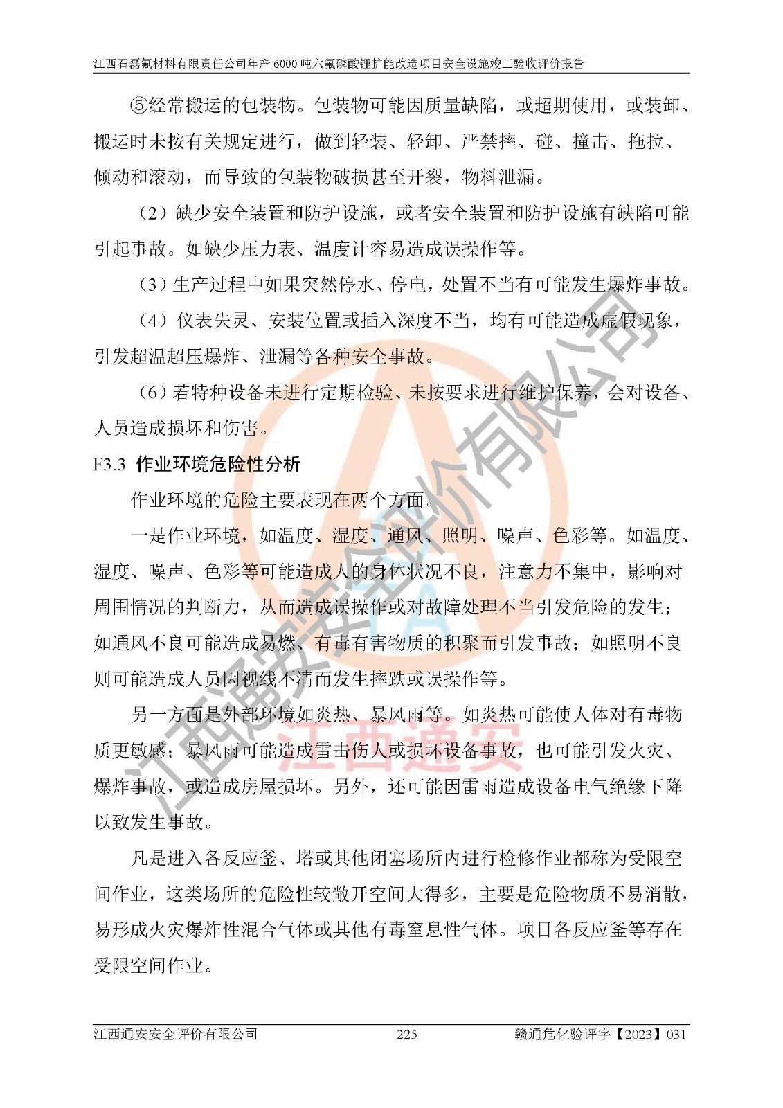 一、建设项目所在地的安全条件和与周边的安全防护距离 (1)该项目位于江西省赣州市会昌县氟盐化工产业基地,属于认定的化工园区,厂址选择合理,该项目与周边环境的防火间距符合规范的要求。 (2)重大危险源与“八类敏感场所及区域”的距离符合相关法律、法规的规定。 (3)该项目103生产车间三和201罐区一均构成**重大危险源。根据《危险化学品生产装置和储存设施外部安全防护距离确定方法》(GB/T 37243-2019)和《危险化学品生产装置和储存设施风险基准》(GB 36894-2018),该项目高敏感防护目标、重要防护目标、一般防护目标中的一类防护目标(<3×10-7)的外部安全防护距离包络线距离厂界*大值为76.36m,个人风险等值线范围内未出现该类防护目标;一般防护目标中的二类防护目标(<3×10-6)的外部安全防护距离包络线距离厂界*大值为51.62m,个人风险等值线范围内未涉及相应的防护目标;一般防护目标中的三类防护目标(<1×10-5)外部安全防护距离的包络线未出厂界。项目外部安全防护距离内无相应的防护目标,该项目不存在社会风险。 (4)该项目投产后在正常生产情况下,对其周边单位的生产、经营活动和居民的生活影响很小。在发生事故的情况下对周边单位的生产、经营活动和居民的生活存在影响。该项目周边单位的生产、经营活动和居民的生活对该项目投产后的正常生产影响很小。该项目所在地自然条件(不包括地震等破坏力**的自然灾害)的变化对该项目投产后的正常生产没有影响。 二、建设项目安全设施设计的采纳情况和已采用(取)的安全设施水平 该项目采用的主要安全设施包括了以下方面:检测、报警设施,设备安全防护设施,作业场所防护设施,安全警示标志,泄压和止逆设施,紧急处理设施,防止火灾蔓延设施,灭火设施,紧急个人处置设施,应急救援设施,劳动防护用品和装备等。 该项目在建设过程中采纳了《安全设施设计专篇》中的有关安全措施建议及要求,针对性的采取了相应的预防和控制措施,建设中未落实的安全措施,在试生产中已进行了整改。试生产表明该项目所采取的安全控制措施安全**,主要生产装置、设备运行平稳,安全可靠,安全水平较高,能够满足安全生产条件。 三、建设项目试生产(使用)后具备**现行有关安全生产法律、法规和部门规章及标准规定和要求的安全生产条件 1)法律法规等方面的符合性:该项目按照建设项目“三同时”要求,项目进行了备案、通过了安全条件审查、安全设施设计审查、试生产方案审查,立项审批手续齐全,安全设施设计、建设施工、施工监理均由有资质的单位承担,项目建设符合法律、法规规定的审批、施工、监理手续。项目建设期间,公司结合生产需要,增设了部分辅助设施和工艺管线,属于一般变更,试生产期间公司已委托河北英科石化工程有限公司进行了设计变更,作为已经审查通过的安全设施设计专篇的补充文件。 2)该项目与周边建构筑物的防火距离符合《精细化工企业工程设计防火标准》《建筑设计防火规范》的要求。根据《危险化学品生产装置和储存设施风险基准》GB36894-2018确定危险化学品单位周边重要目标和敏感场所承受的可容许个人风险和社会风险的定量风险评价。项目的个人风险计算结果表明,项目外部安全防护距离的包络线内无相应的防护目标。该软件未计算出社会风险。因此项目可容许个人风险和社会风险均在可接受范围内。 3)平面布置及常规防护设施措施的合理性:该项目生产场所、办公场所之间的间距满足安全要求,建筑结构、防火分区、防雷设施、安全出口的设置等满足安全生产的要求。消防道路的净宽度、净**、转弯半径均满足运输**及消防**通行。设置的常规防护设施、防止机械伤害、防急性中毒窒息的设施和措施符合要求。 4)设施、设备、装置及工艺方面的安全性:无**明令淘汰的工艺和 设备,该项目不涉及爆炸性危险区域划分。生产工艺操作和设置的安全设施满足安全需要,生产设施的布置能**人员疏散安全及操作方便。设施、设备、装置及工艺方面安全可靠。 5)特种设备、强制检测设备设施监督检验情况:该项目特种设备均进行了检验检测,并取得了检验报告;安全阀、压力表、有毒气体探头也进行了校验,校验结论合格,特种设备及安全附件符合《特种设备安全监察条例》 等相关法律法规、条例的规定。 6)公用工程、辅助设施的配套性:为该项目生产配套的供水、供电、 供气、供热等满足需要。 7)人员管理及安全培训方面充分性:公司现已建立了安全管理机构, 配备了专职安全管理人员。主要负责人王成具备化学工程与工艺专业本科学历,分管生产负责人曾中山具备化学工程与工艺专业本科学历,分管设备和技术负责人刘辉涛具备应用化学专业本科学历。专职安全管理人员共4人,配有一名注册安全工程师,专职安全管理人员均具有大专以上化工及安全专业相关学历。重点监管化工工艺的生产装置、储存设施操作人员具备高中及以上学历或化工类中等及以上职业教育水平。该公司制定了较完善的安全管理制度、岗位责任制、安全操作规程,制度执行情况较好。该公司已为从业职工交纳了工伤**。该公司对操作员工进行相关的培训和教育,经培训合格后上岗。 8)应急救援**性:企业根据自身实际情况,将该项目按照《生产经 营单位生产安全事故