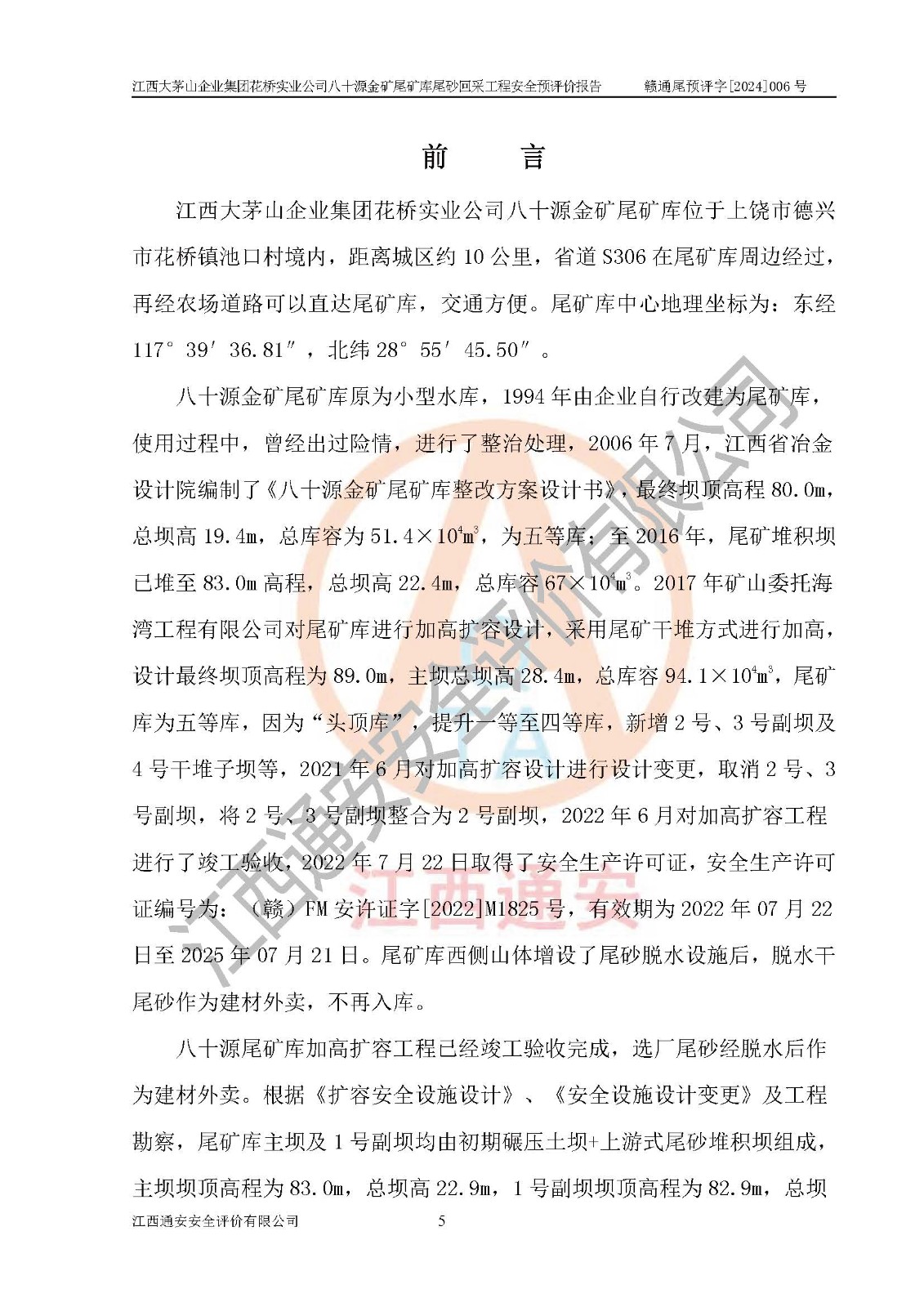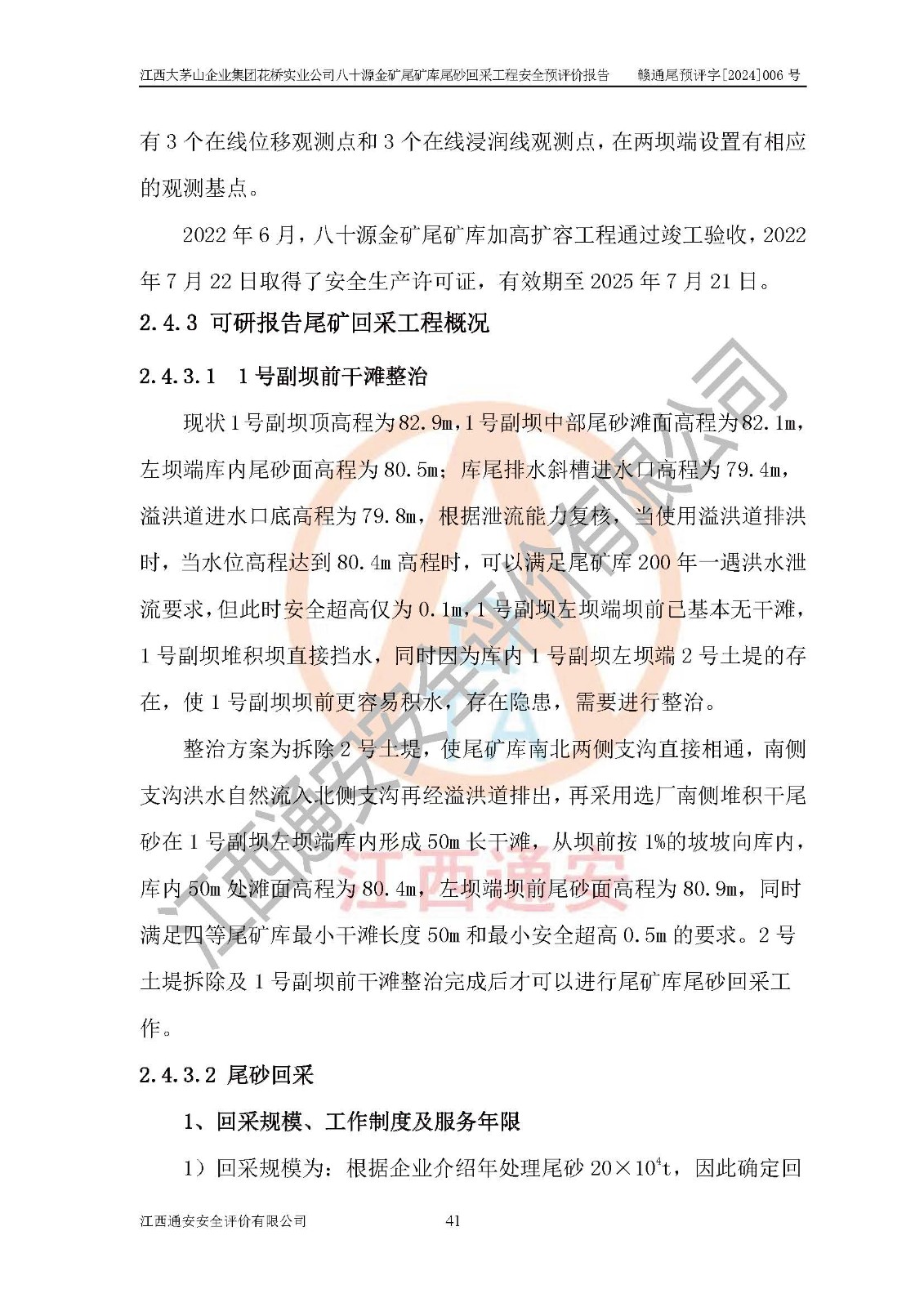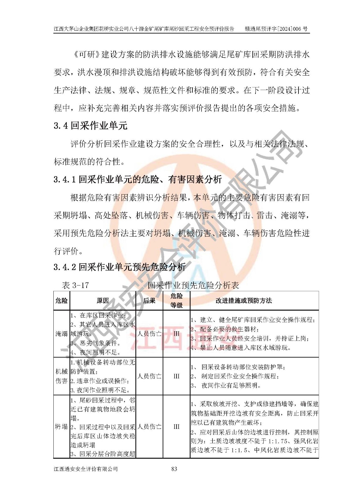 评价结论 | 建设单位依据《可研》建设方案,结合本报告提出的安全措施建议,进行江西大茅山企业集团花桥实业公司八十源金矿尾矿库尾砂回采工程后续设计、施工、生产、管理,则尾矿库尾砂回采项目危险、有害因素的风险程度可以控制在可承受的范围之内,八十源金矿尾矿库尾砂回采工程安全条件可满足安全生产需要。 | |||