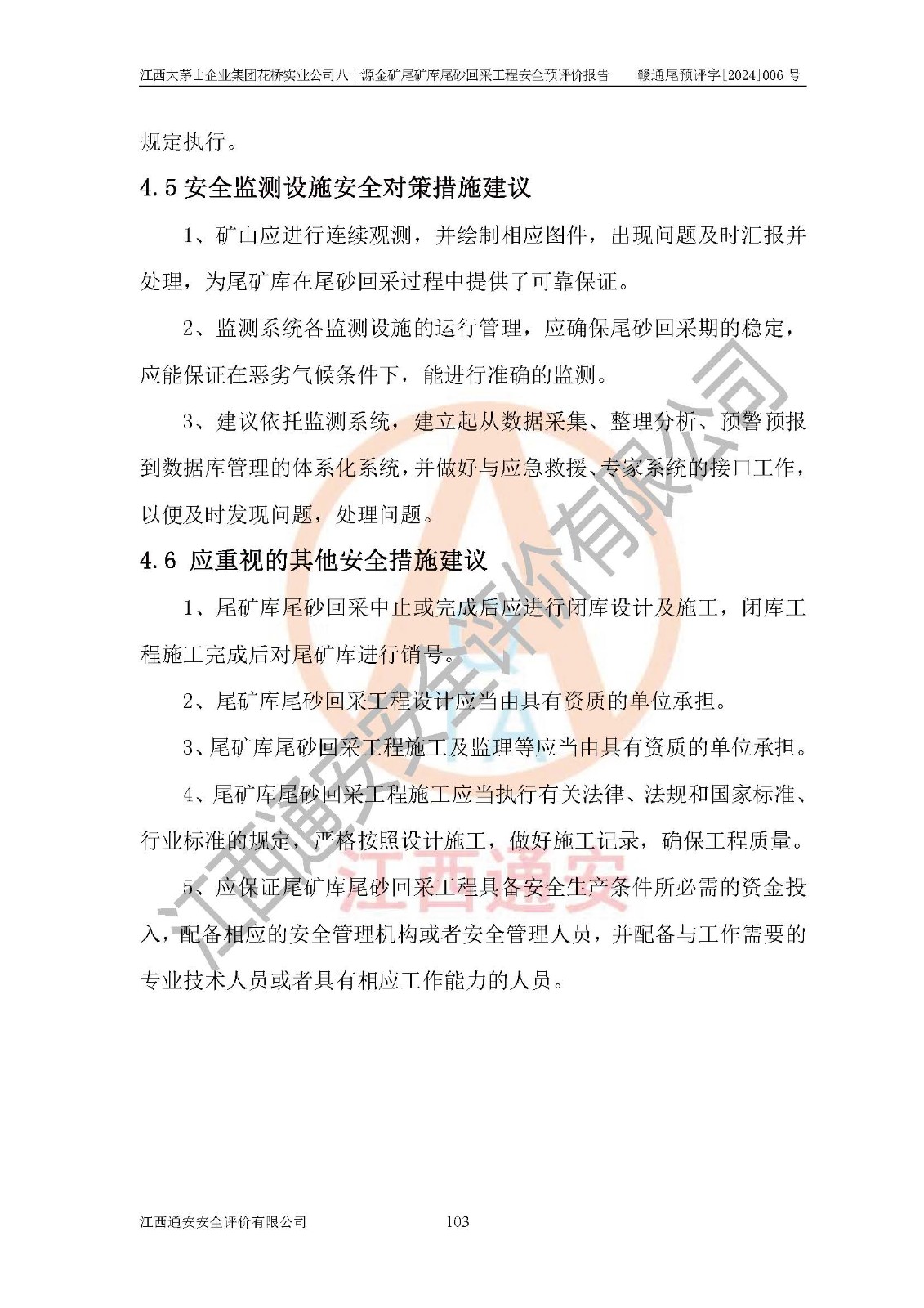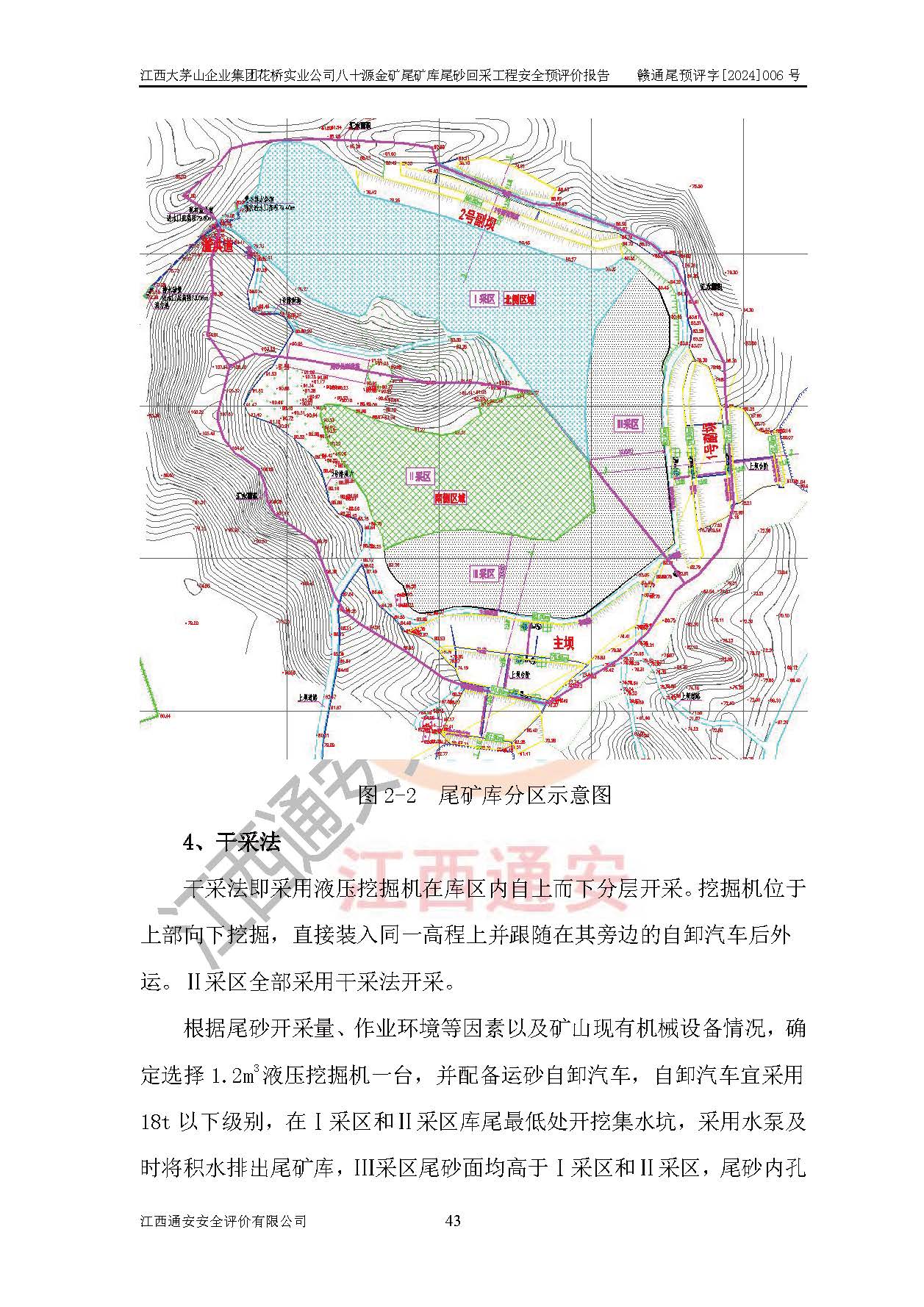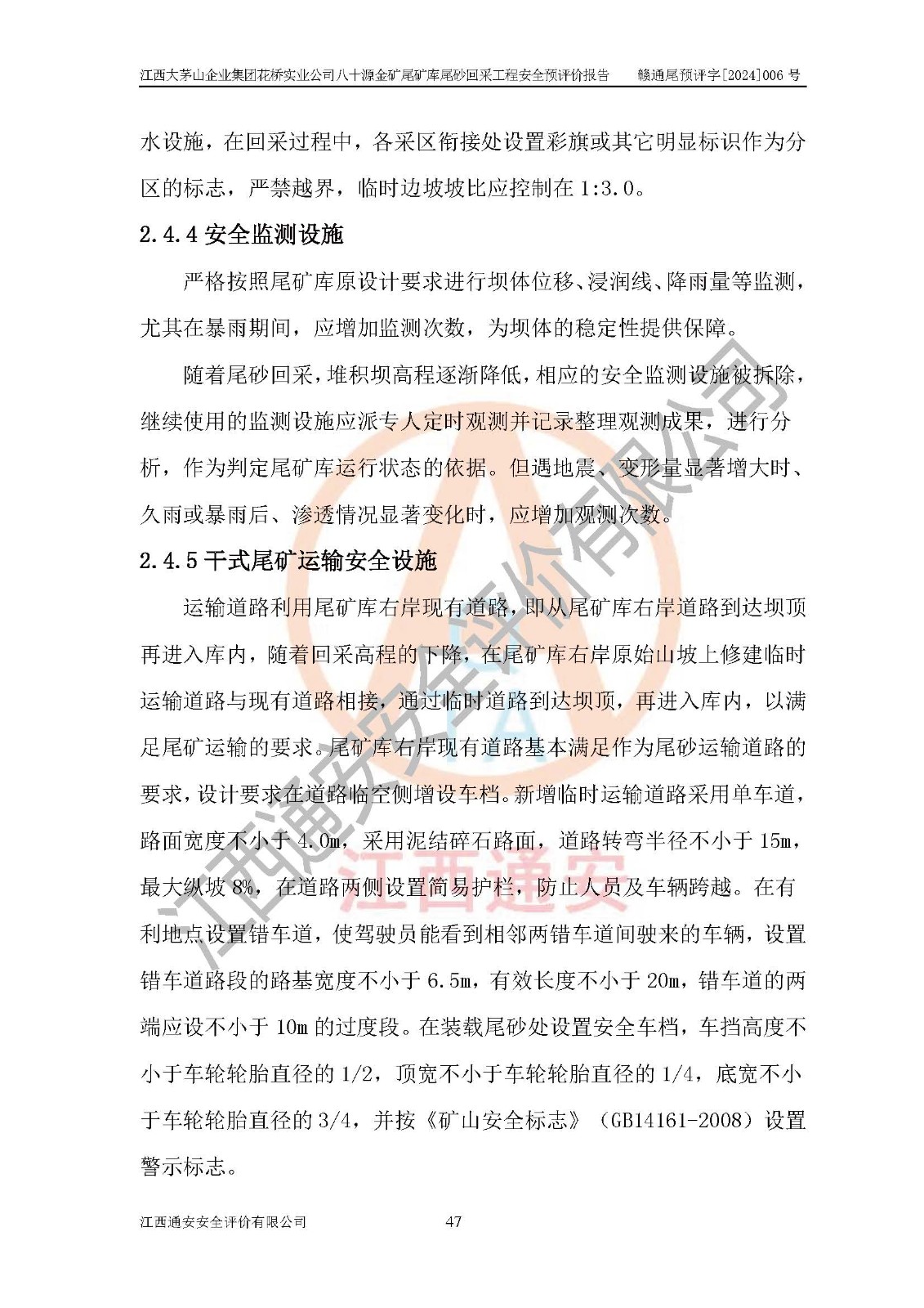 评价结论 | 建设单位依据《可研》建设方案,结合本报告提出的安全措施建议,进行江西大茅山企业集团花桥实业公司八十源金矿尾矿库尾砂回采工程后续设计、施工、生产、管理,则尾矿库尾砂回采项目危险、有害因素的风险程度可以控制在可承受的范围之内,八十源金矿尾矿库尾砂回采工程安全条件可满足安全生产需要。 | |||