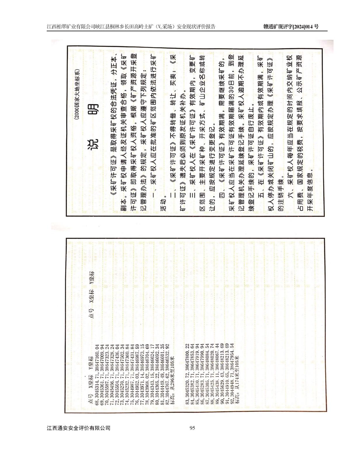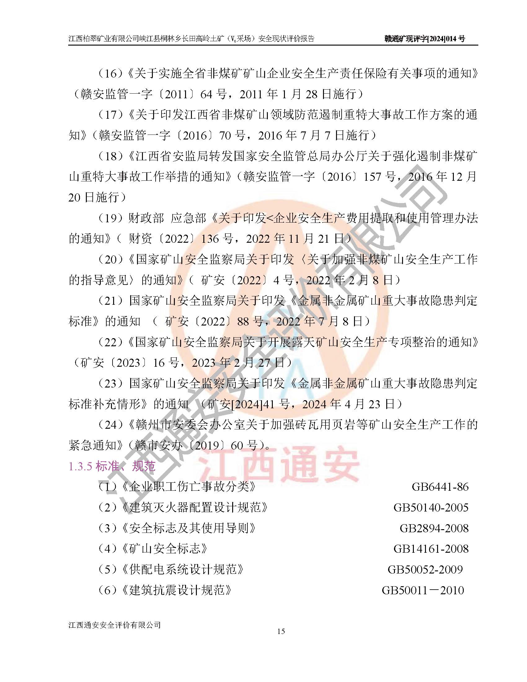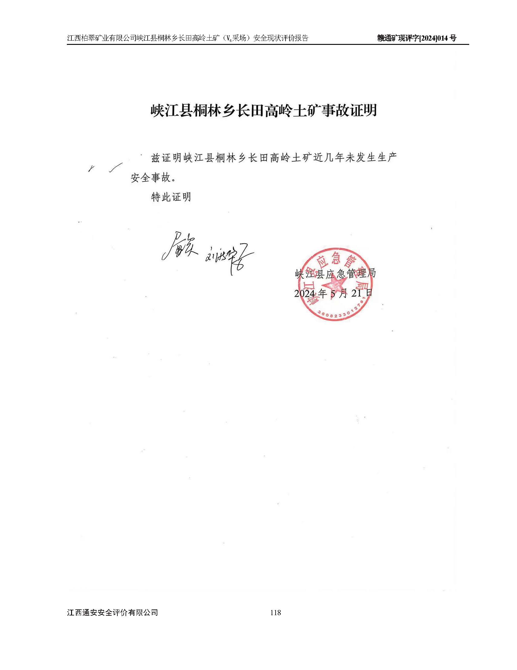 评价报告名称 | 江西柏翠矿业有限公司峡江县桐林乡长田高岭土矿(V6采场)安全现状评价报告 | ||||