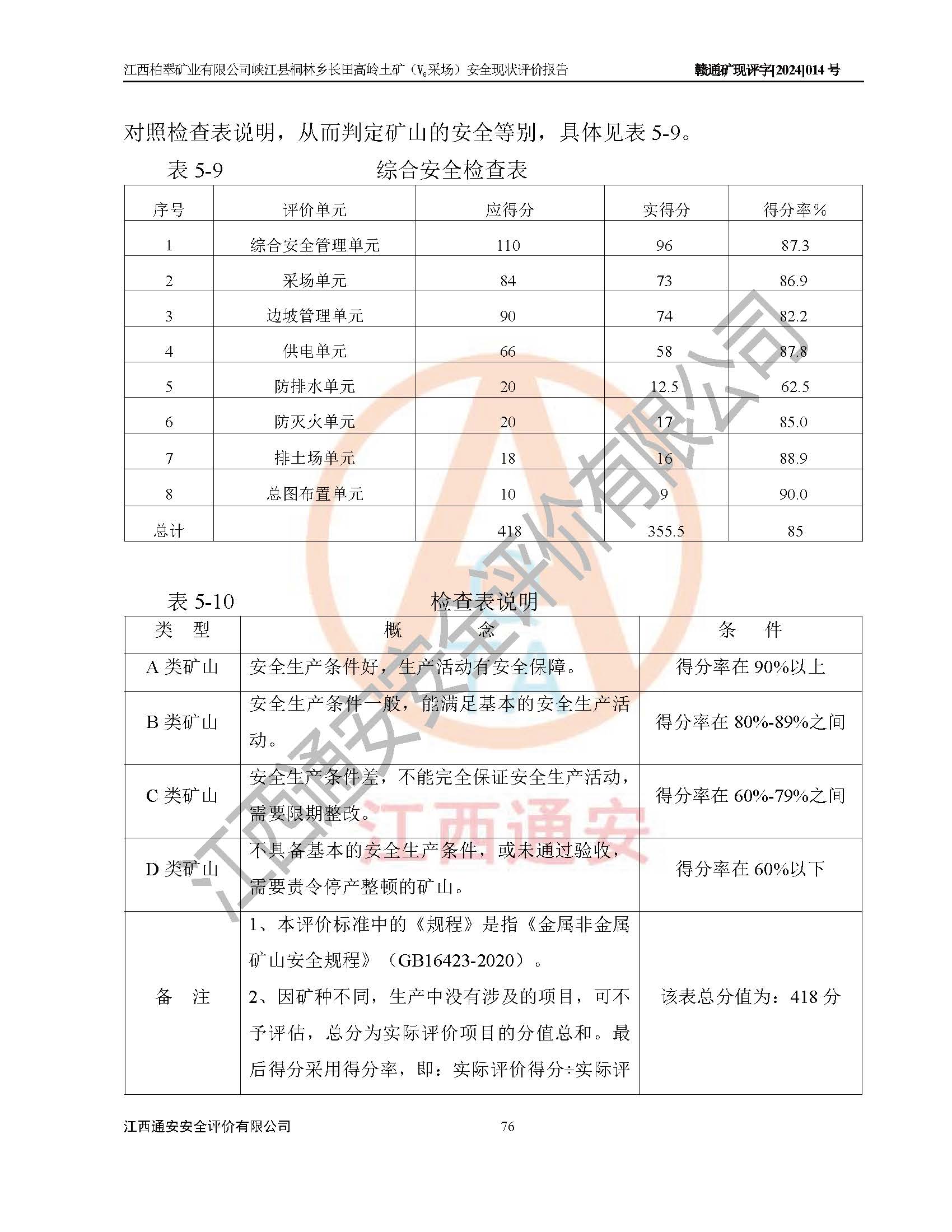 评价结论 | 峡江县桐林乡长田高岭土矿露天开采V6采场设备、设施和场所符合**安全生产有关法律、法规、标准及规范的要求。矿山采用露天开采、公路开拓、汽车运输方式,安全生产条件一般,能满足基本的安全生产活动;安全管理能满足法规要求,V6采场露天开采符合**规定的安全生产条件。