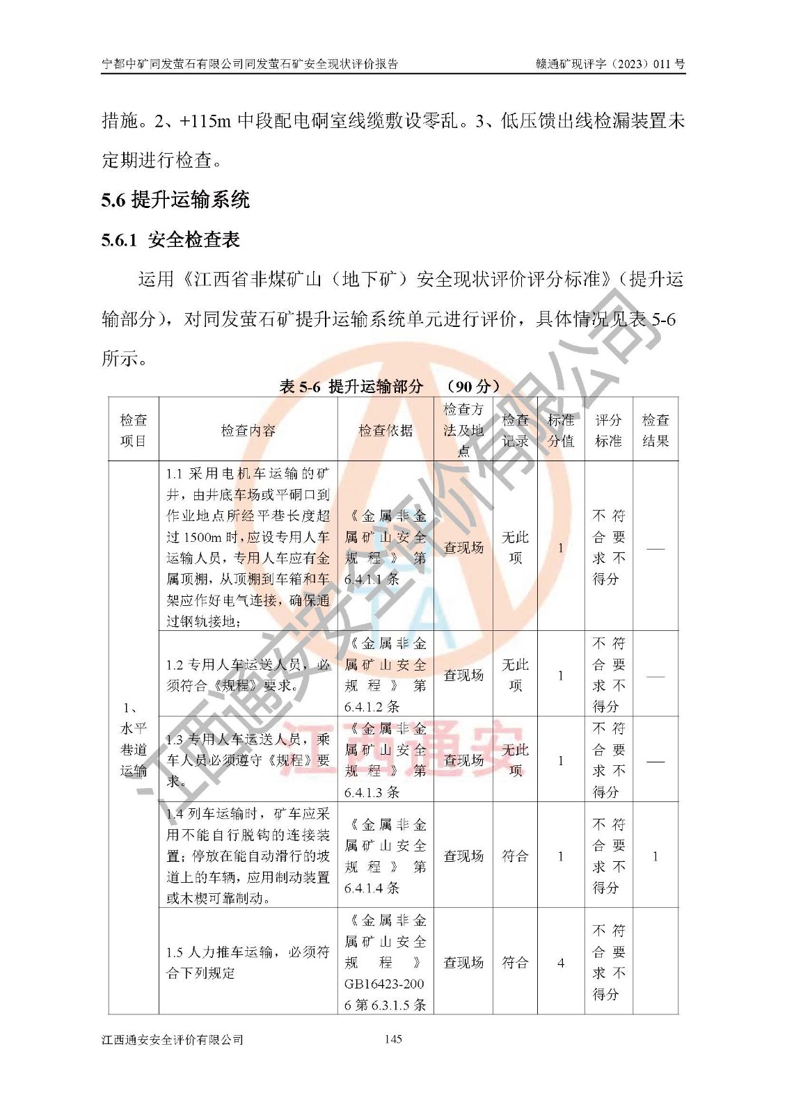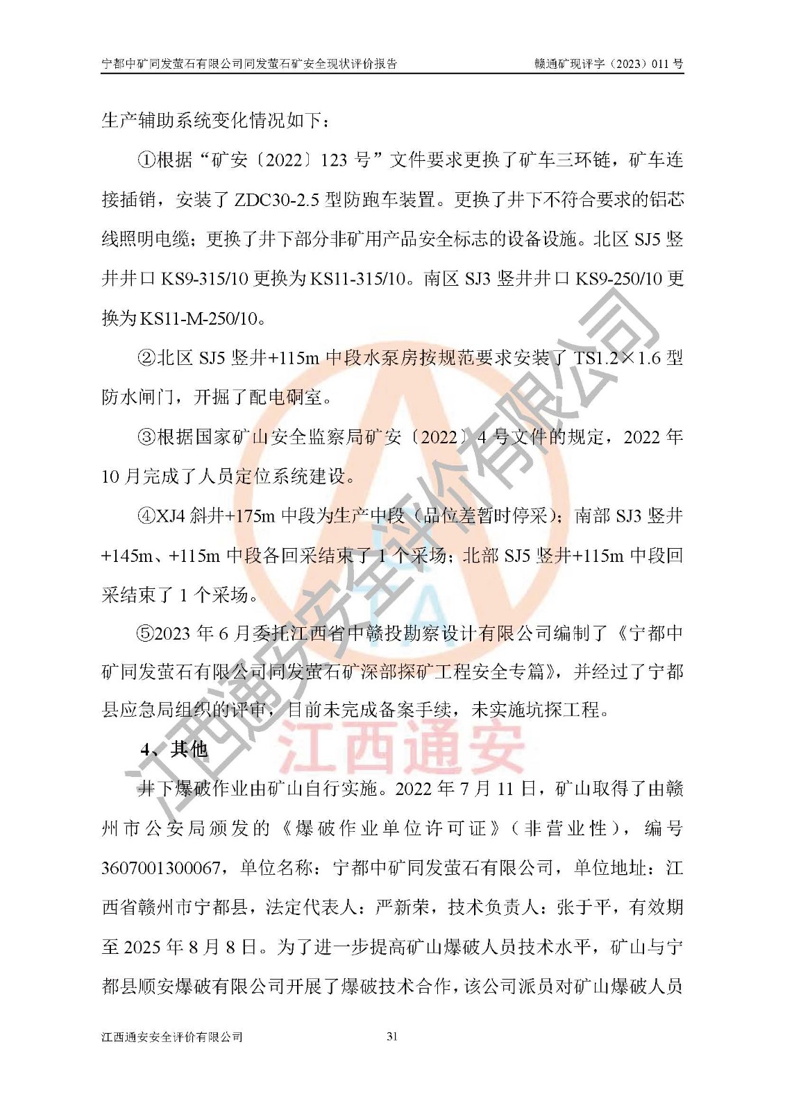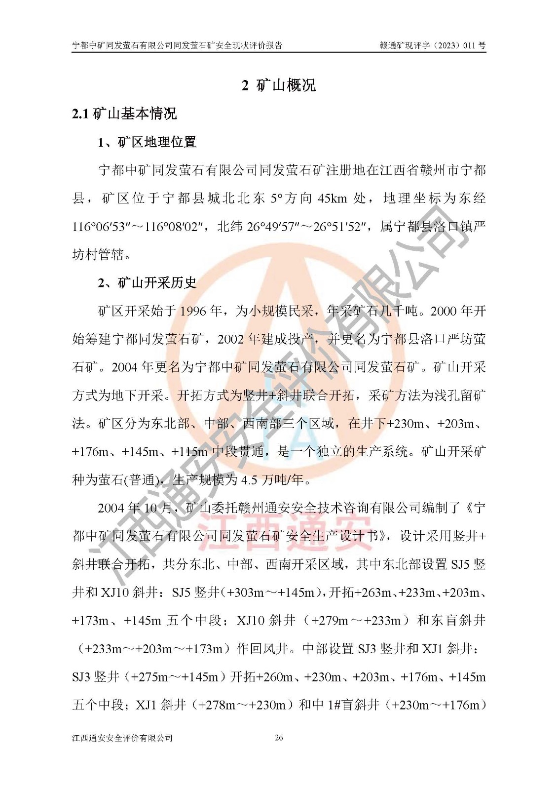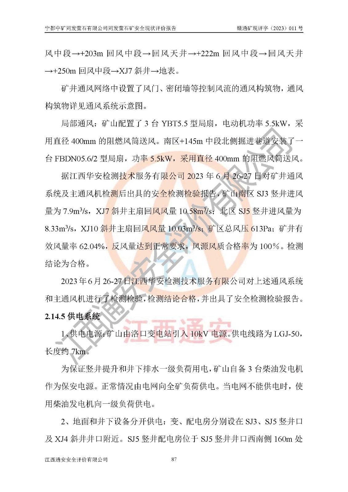 其它 | 宁都中矿同发萤石有限公司同发萤石矿的主要生产及辅助系统:提升运输、排水、供配电、通风、供风、采掘、安全避险“六大系统”等基本符合法律法规要求和规程、规范要求;各种危险有害因素及不可接受的风险在运行中认真落实行之**的技术措施或管理措施,严格按规程,按要求加强管理,可以避免和控制各类事故,**安全生产。现阶段矿山设备、设施和场所符合**安全生产有关法律、法规、标准及规范的规定。矿山采用竖井+斜井联合开拓方式,安全生产条件一般;安全管理能满足法规要求,矿山地下开采符合**规定的安全生产条件。 | ||||