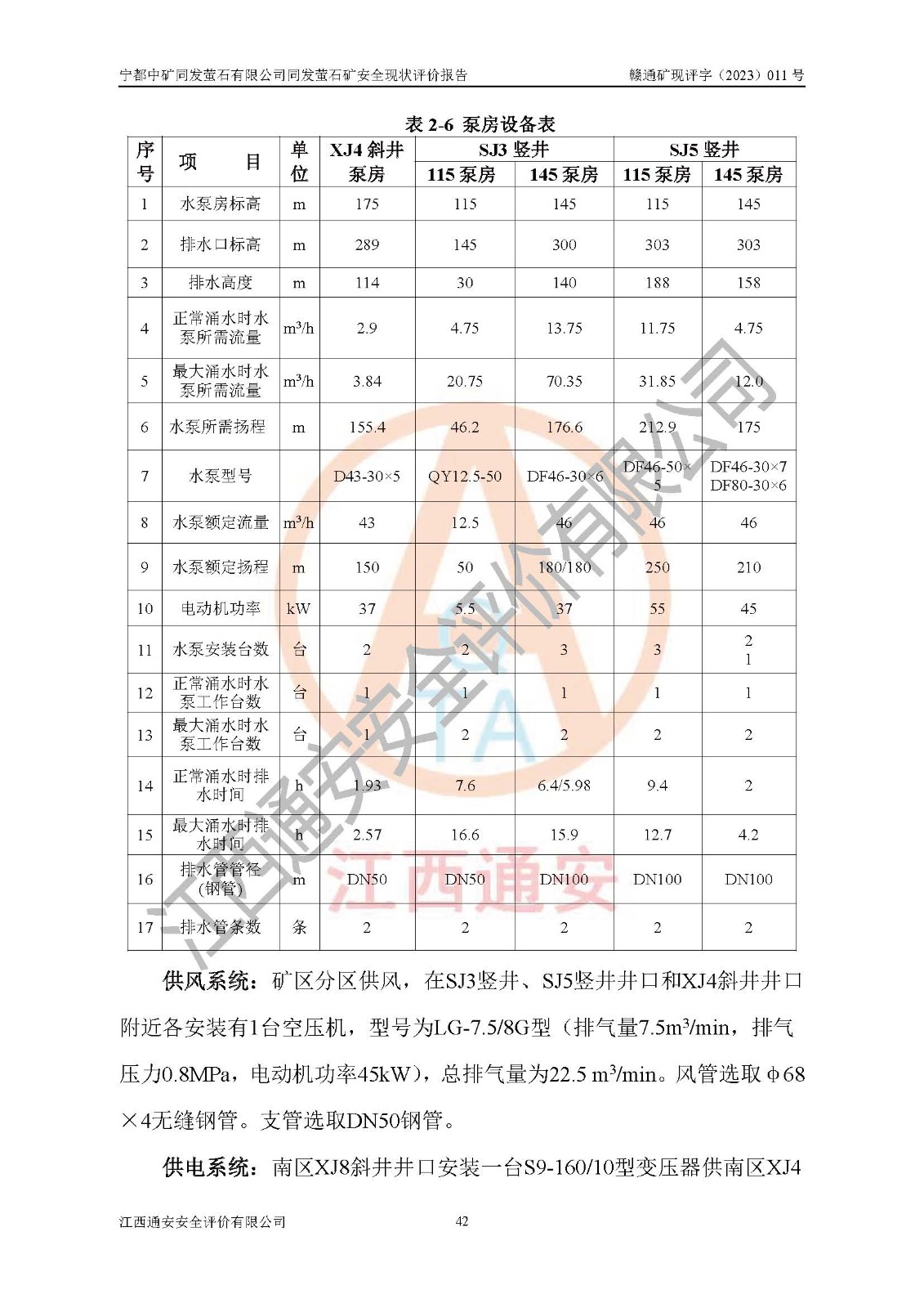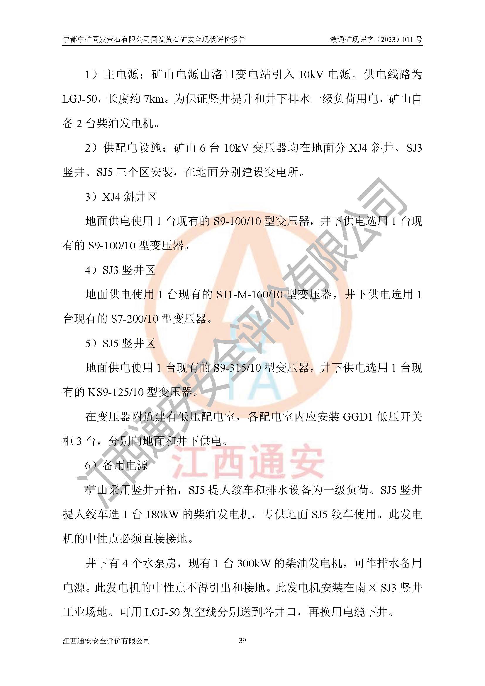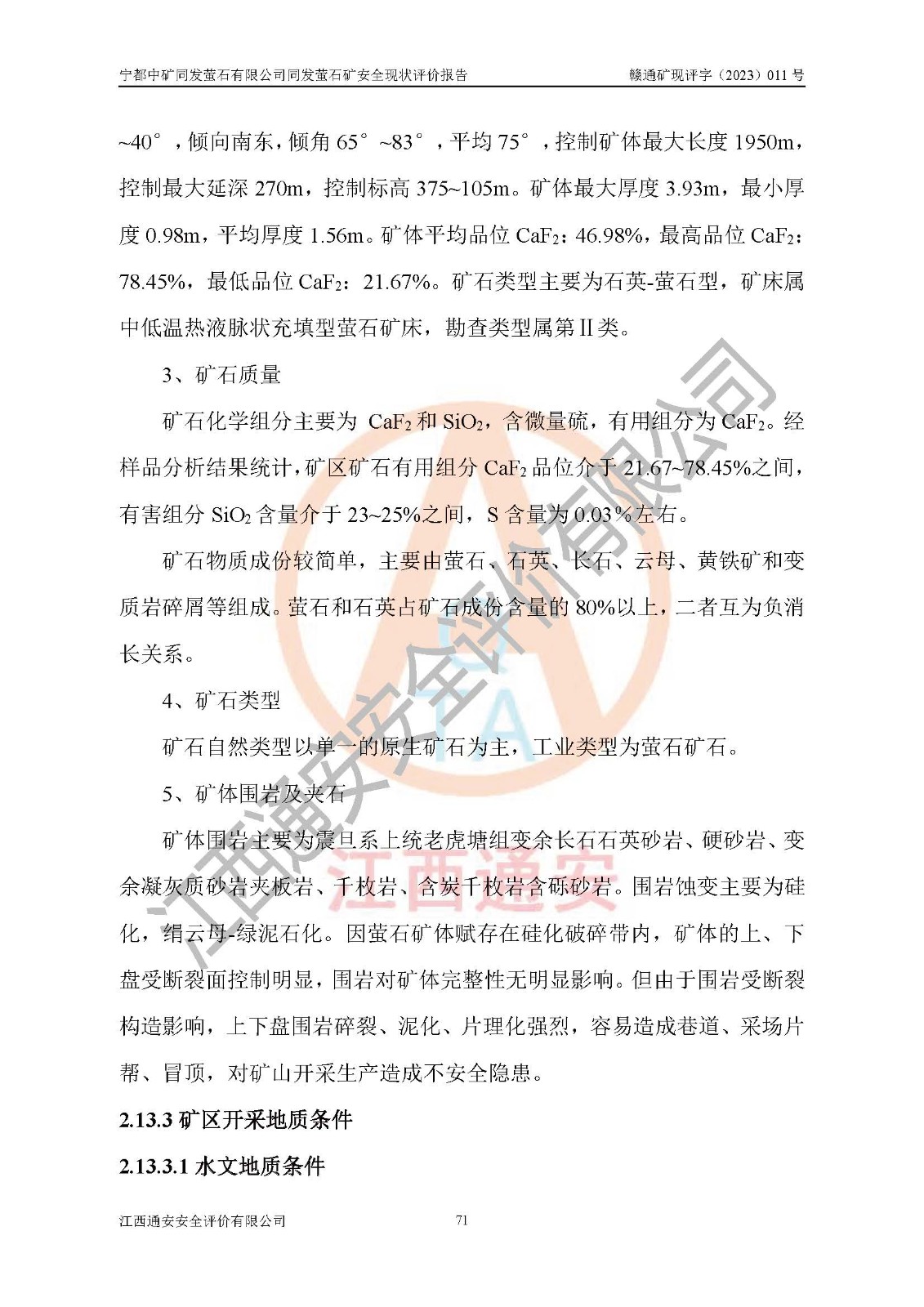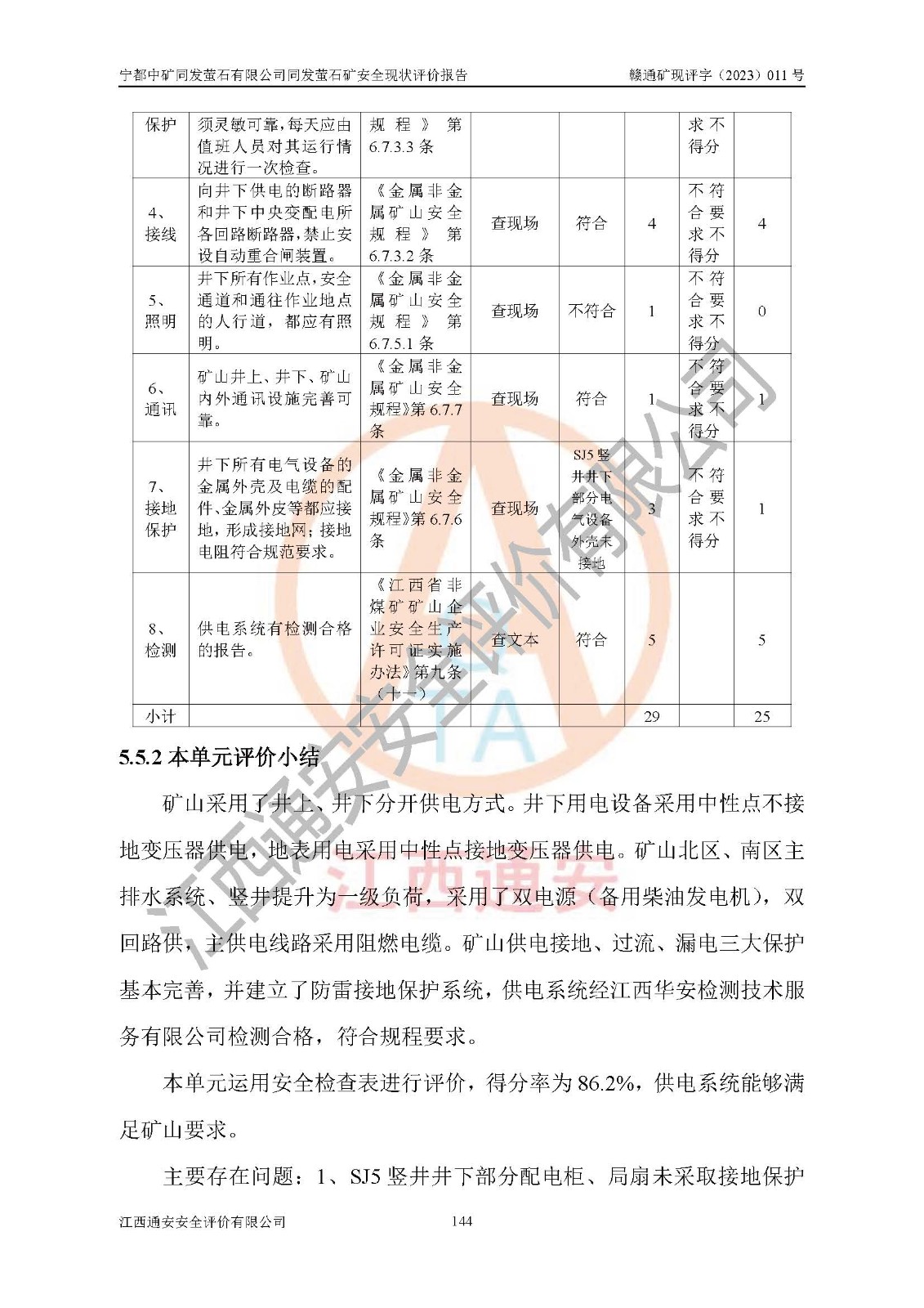 其它 | 宁都中矿同发萤石有限公司同发萤石矿的主要生产及辅助系统:提升运输、排水、供配电、通风、供风、采掘、安全避险“六大系统”等基本符合法律法规要求和规程、规范要求;各种危险有害因素及不可接受的风险在运行中认真落实行之**的技术措施或管理措施,严格按规程,按要求加强管理,可以避免和控制各类事故,**安全生产。现阶段矿山设备、设施和场所符合**安全生产有关法律、法规、标准及规范的规定。矿山采用竖井+斜井联合开拓方式,安全生产条件一般;安全管理能满足法规要求,矿山地下开采符合**规定的安全生产条件。 | ||||
