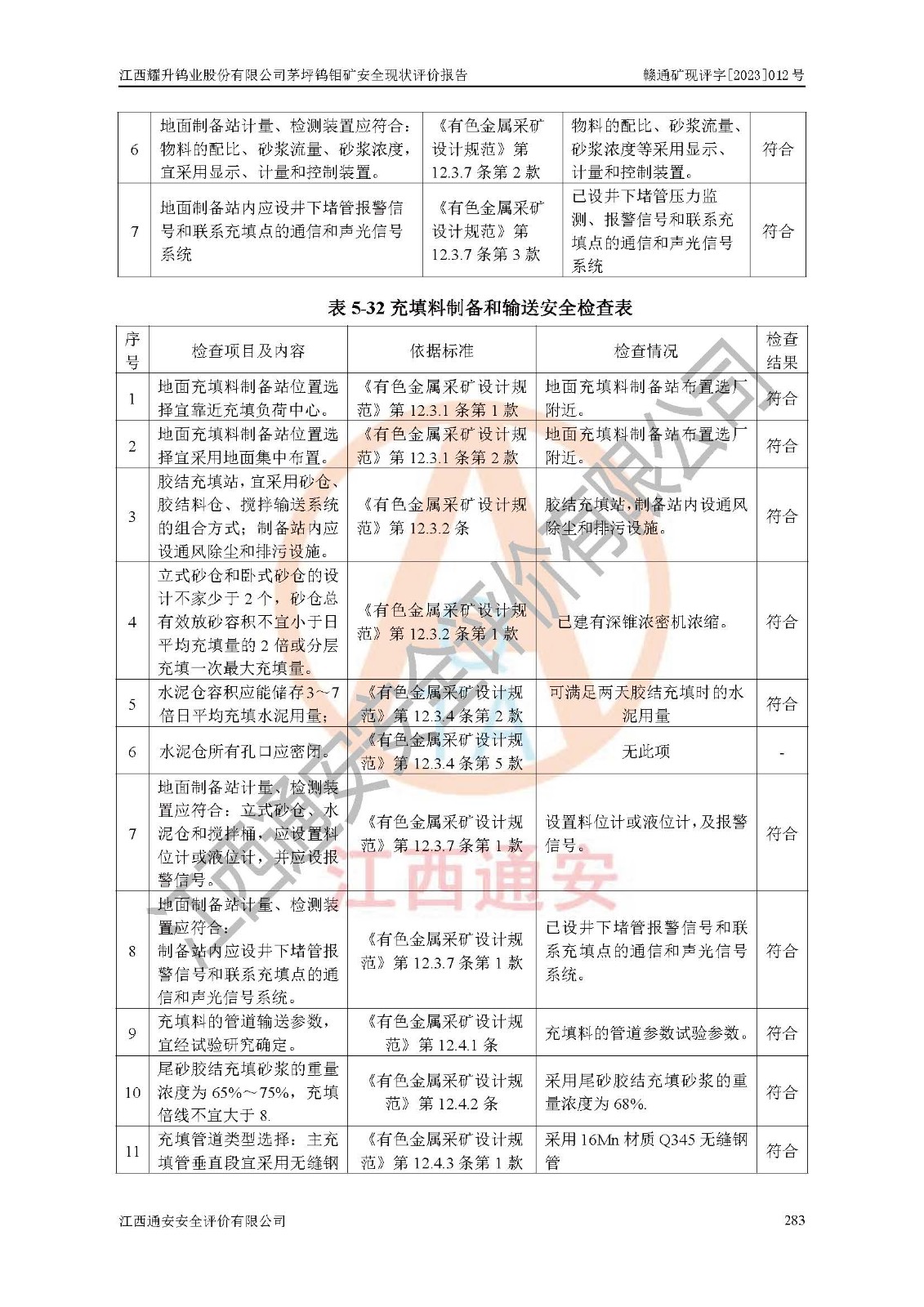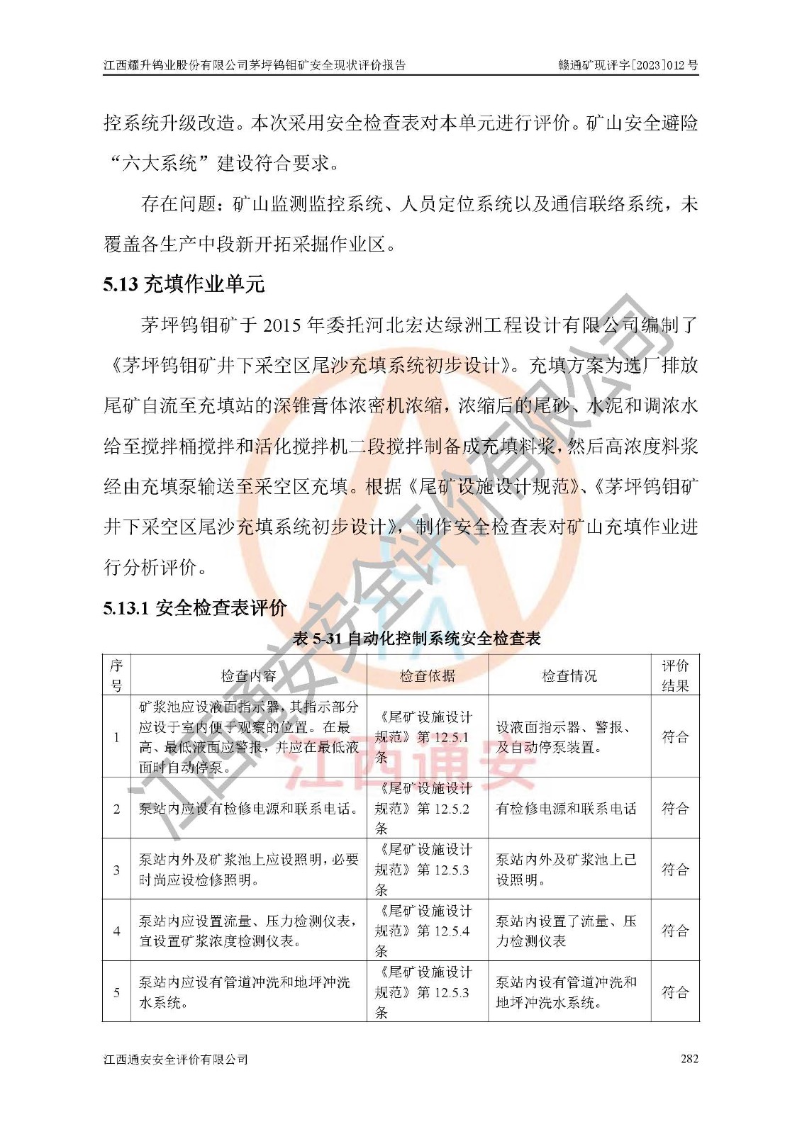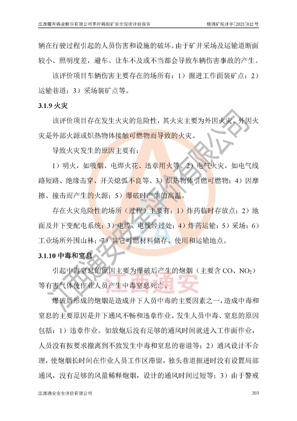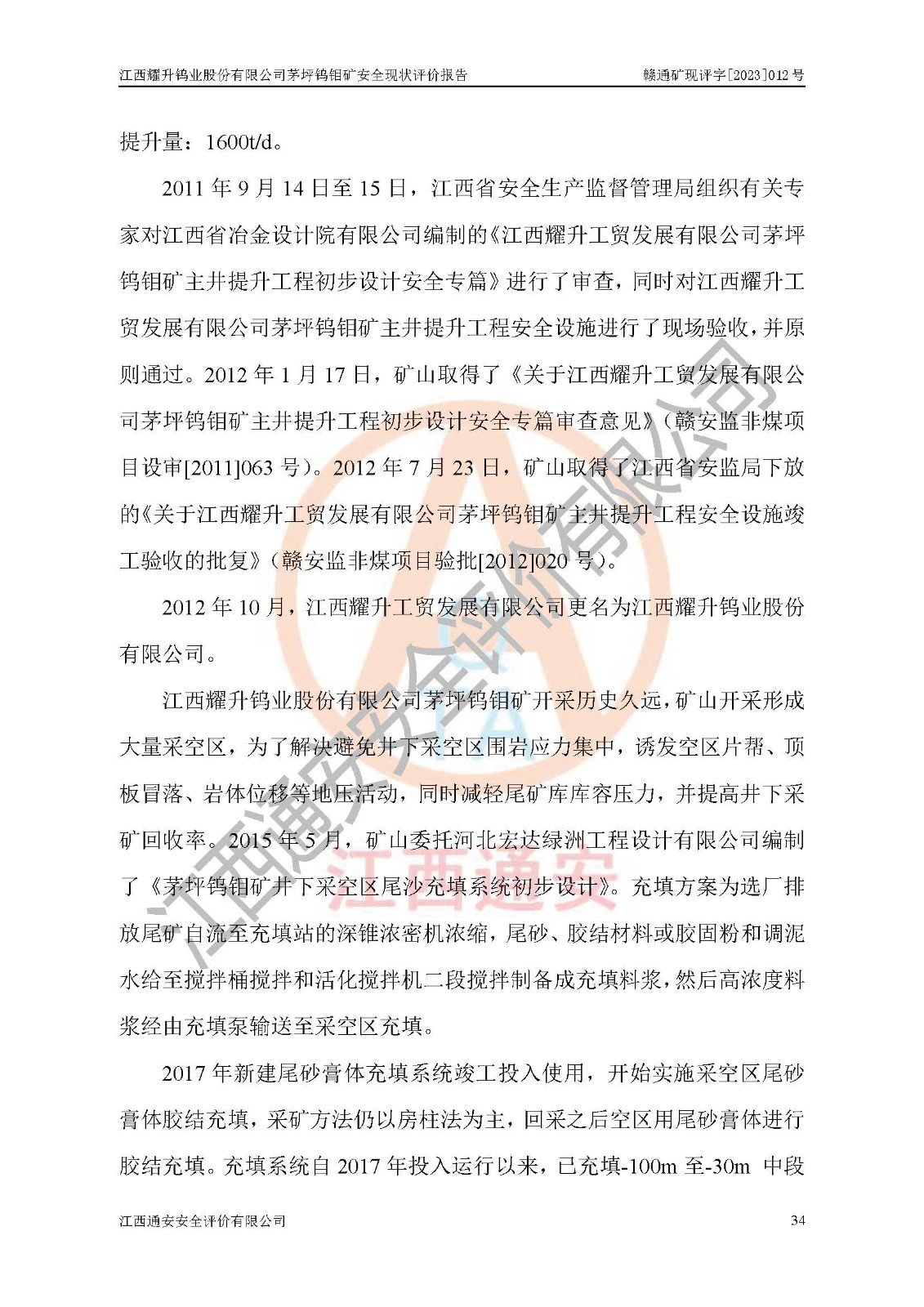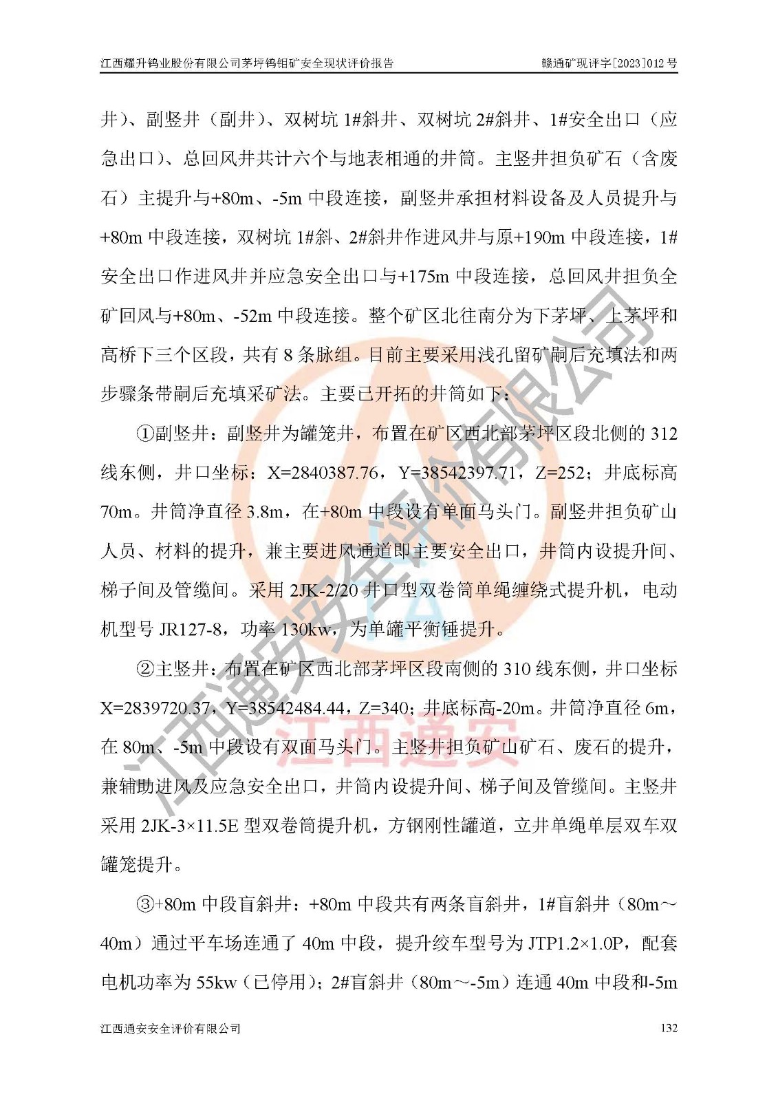 其它 | 江西耀升钨业股份有限公司茅坪钨钼矿的主要生产及辅助系统:提升运输、排水、供配电、通风、供风、采掘、充填、安全避险“六大系统”等基本符合法律法规要求和规程、规范要求;各种危险有害因素及不可接受的风险在运行中认真落实行之**的技术措施或管理措施,严格按规程,按要求加强管理,可以避免和控制各类事故,**安全生产。现阶段矿山设备、设施和场所符合**安全生产有关法律、法规、标准及规范的规定。矿山采用竖井+斜井联合开拓方式,安全生产条件较好;安全管理能满足法规要求,矿山地下开采符合**规定的安全生产条件。 | ||||