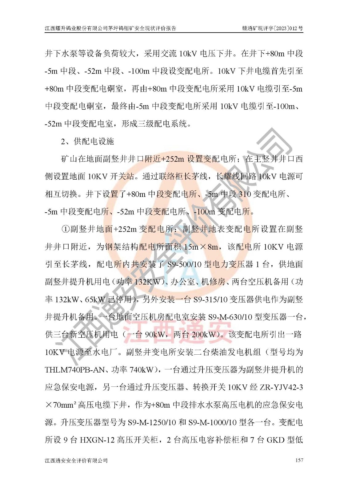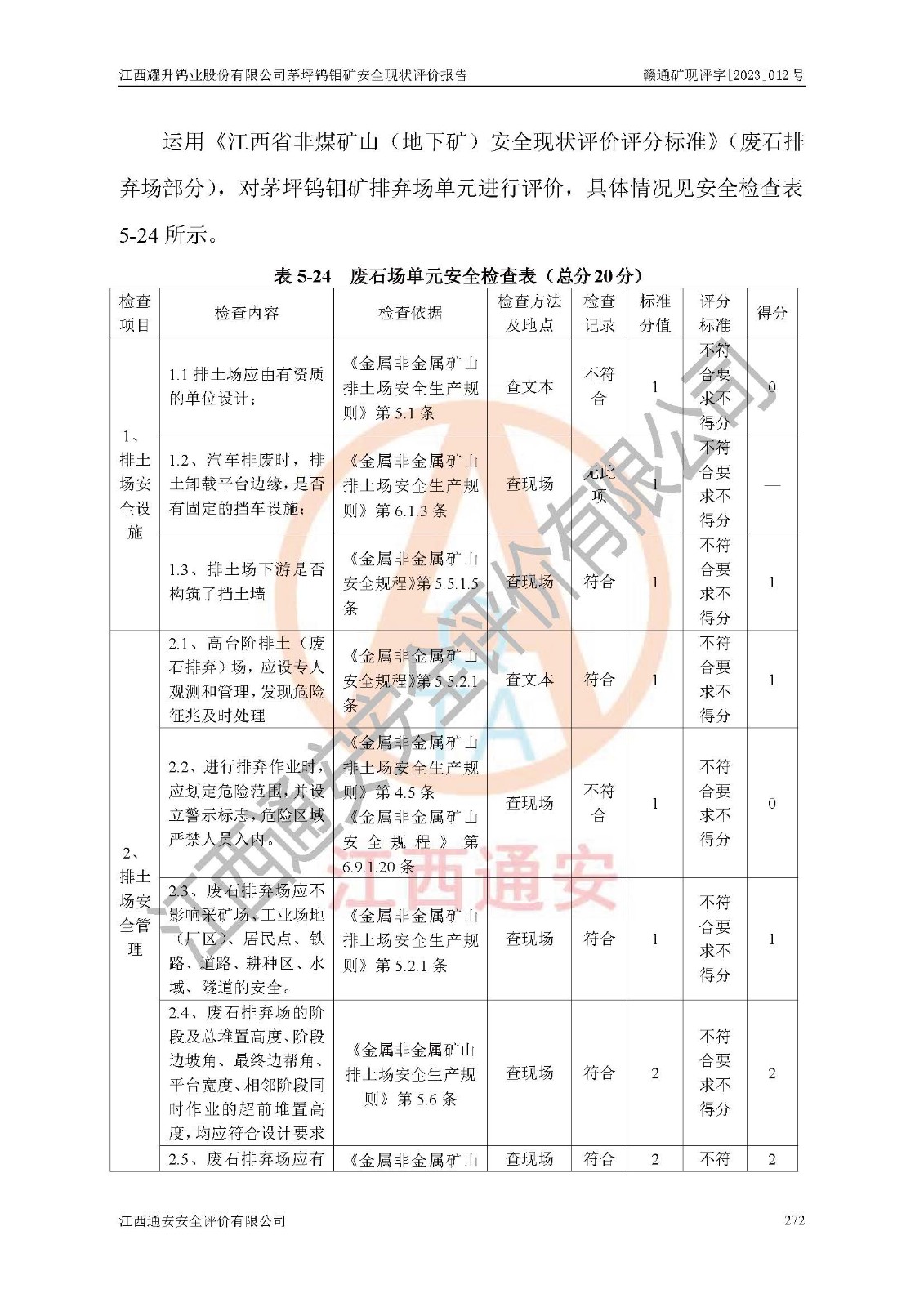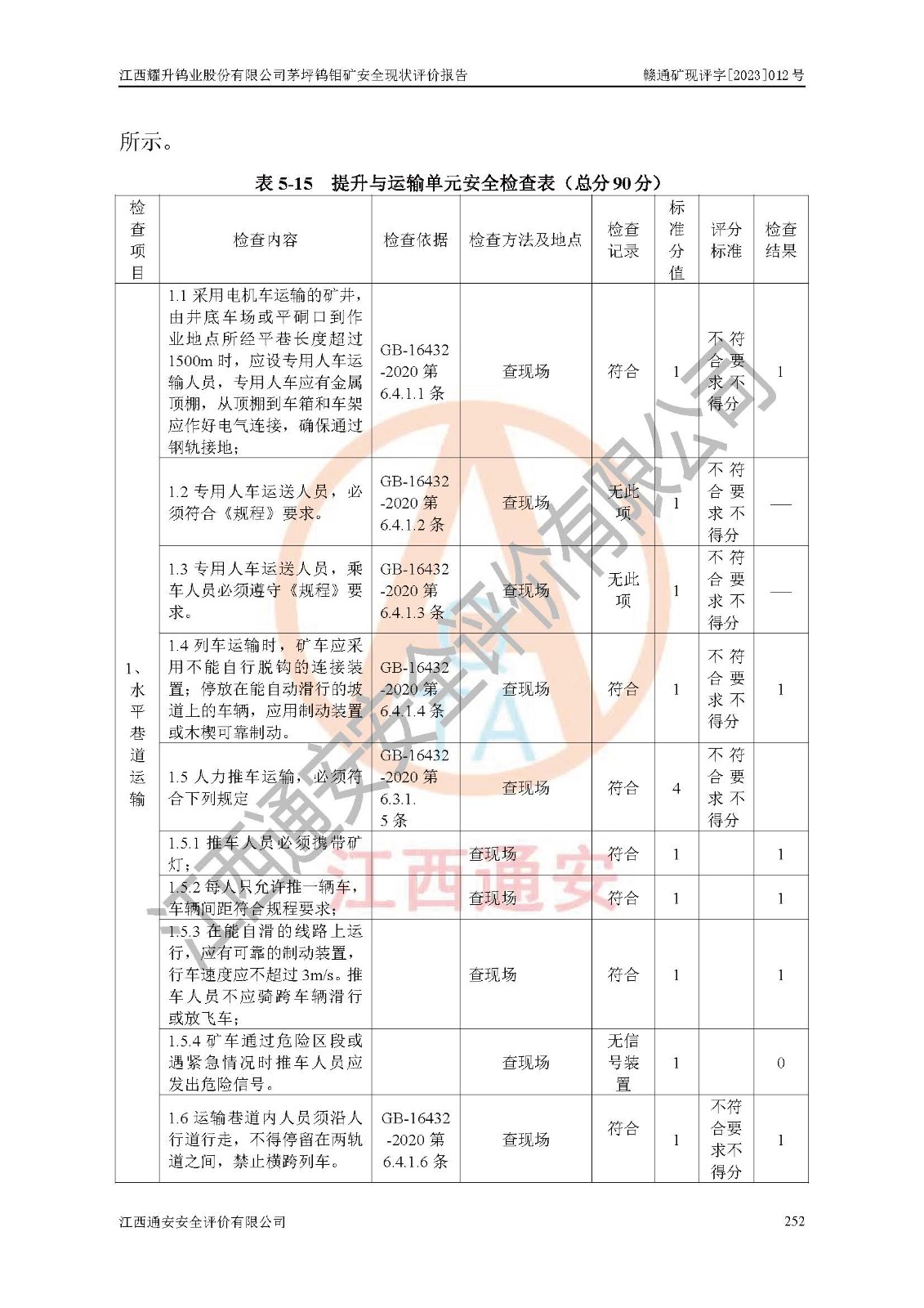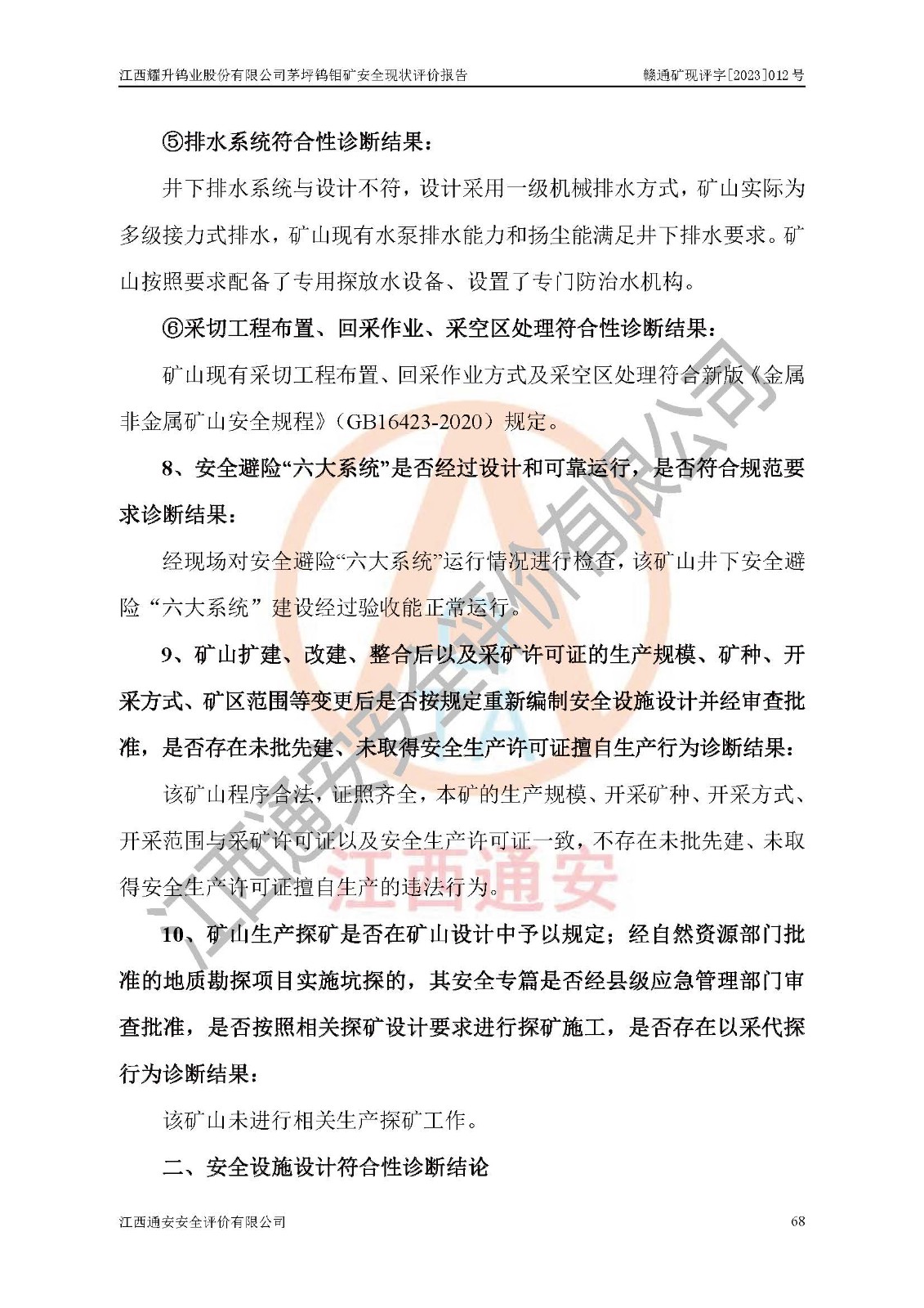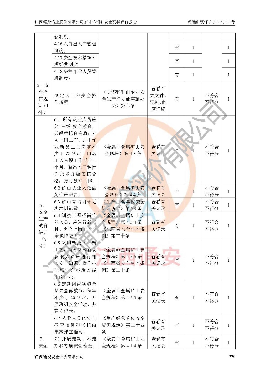 其它 | 江西耀升钨业股份有限公司茅坪钨钼矿的主要生产及辅助系统:提升运输、排水、供配电、通风、供风、采掘、充填、安全避险“六大系统”等基本符合法律法规要求和规程、规范要求;各种危险有害因素及不可接受的风险在运行中认真落实行之**的技术措施或管理措施,严格按规程,按要求加强管理,可以避免和控制各类事故,**安全生产。现阶段矿山设备、设施和场所符合**安全生产有关法律、法规、标准及规范的规定。矿山采用竖井+斜井联合开拓方式,安全生产条件较好;安全管理能满足法规要求,矿山地下开采符合**规定的安全生产条件。 | ||||