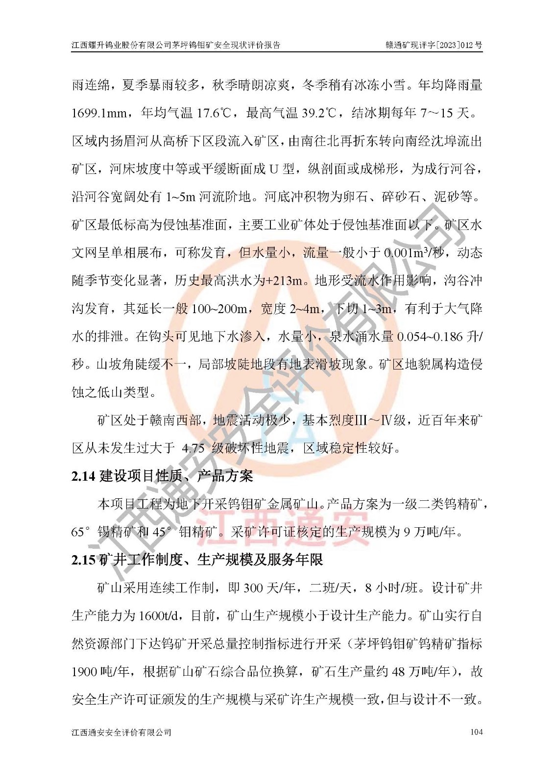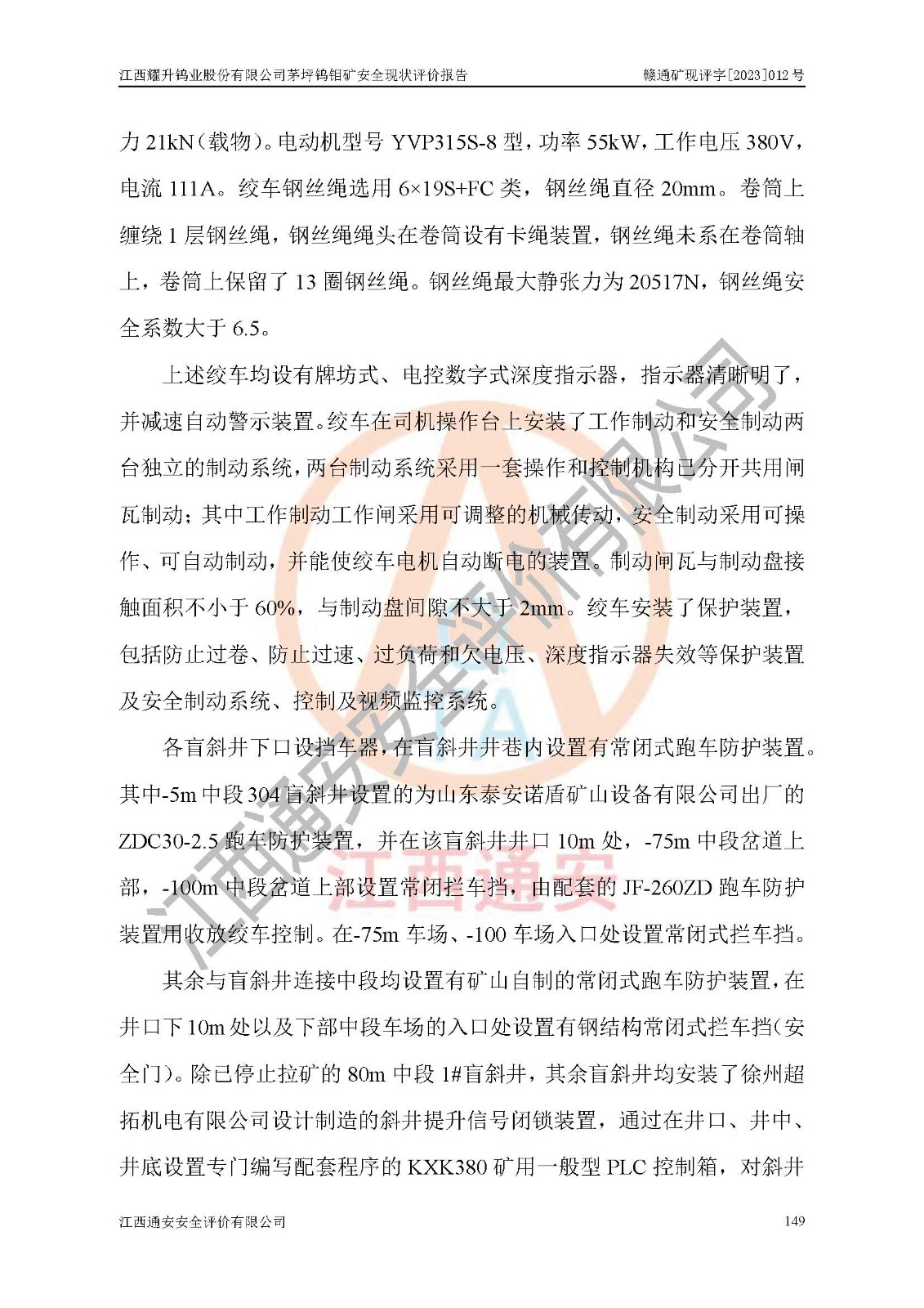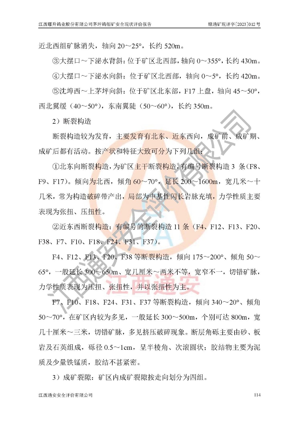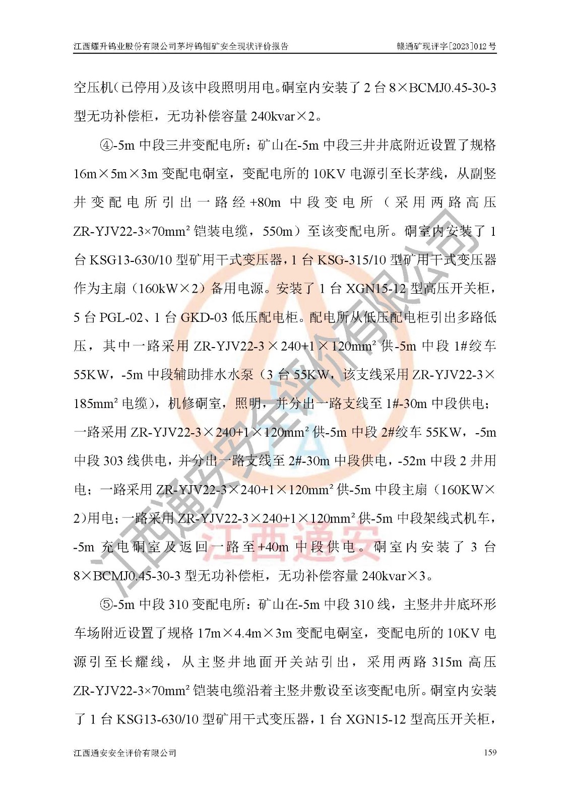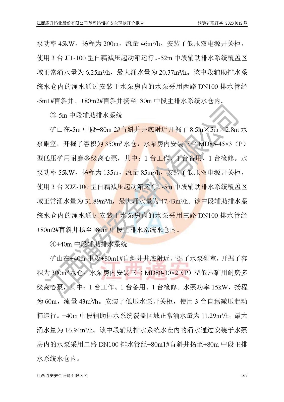 其它 | 江西耀升钨业股份有限公司茅坪钨钼矿的主要生产及辅助系统:提升运输、排水、供配电、通风、供风、采掘、充填、安全避险“六大系统”等基本符合法律法规要求和规程、规范要求;各种危险有害因素及不可接受的风险在运行中认真落实行之**的技术措施或管理措施,严格按规程,按要求加强管理,可以避免和控制各类事故,**安全生产。现阶段矿山设备、设施和场所符合**安全生产有关法律、法规、标准及规范的规定。矿山采用竖井+斜井联合开拓方式,安全生产条件较好;安全管理能满足法规要求,矿山地下开采符合**规定的安全生产条件。 | ||||
