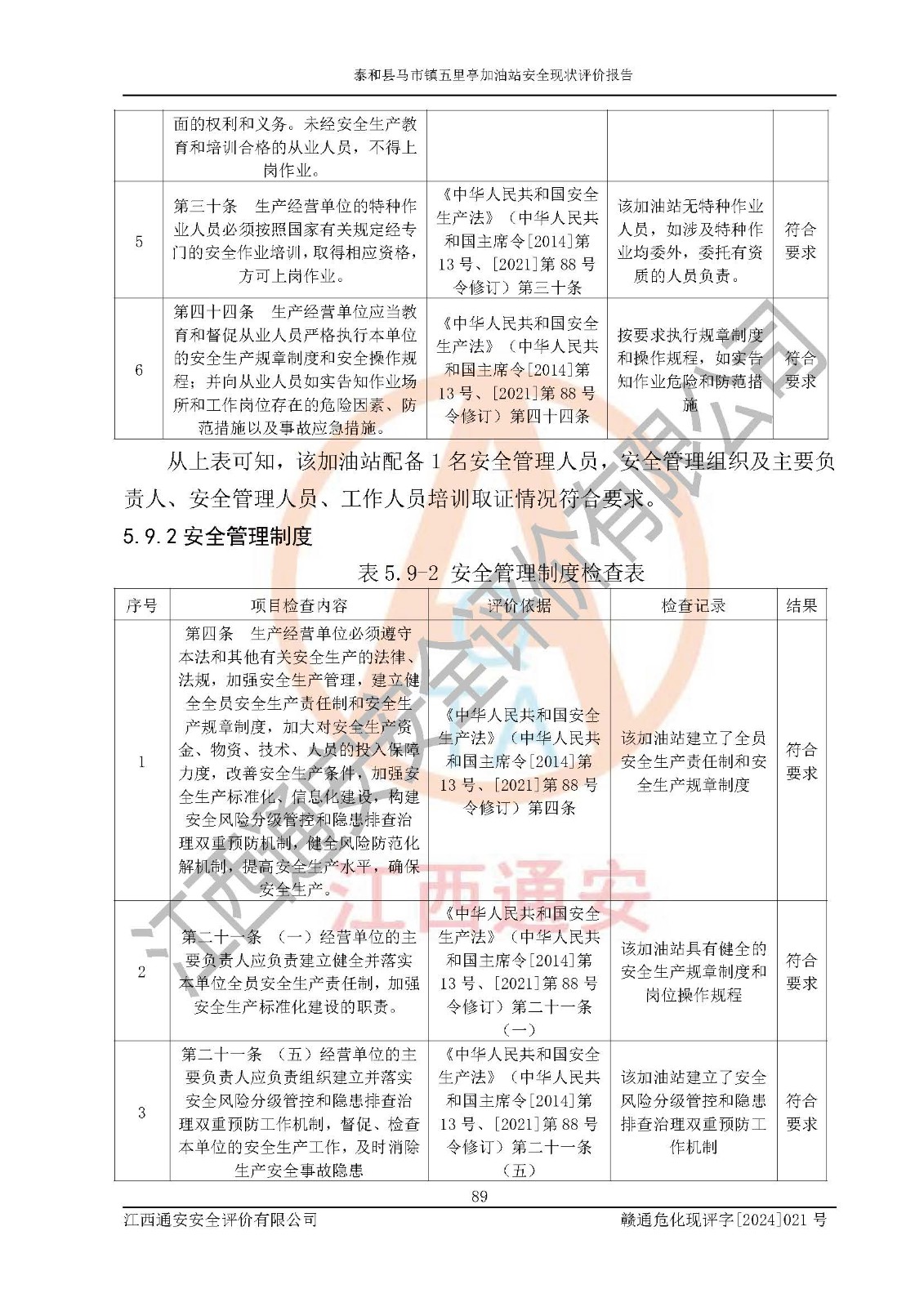 评价结论 | 1、泰和县马市镇五里亭加油站已按照《中华人民共和国安全生产法(中华人民共和国主席令[2021]88号)》和《危险化学品建设项目安全监督管理办法》(**安监总局[2012]第45号令,2015年79号令修改)的要求进行安全条件评价,符合**和省关于危险化学品建设项目经营许可程序的要求。 2、泰和县马市镇五里亭加油站总平面布置符合《汽车加油加气加氢站技术标准》GB50156-2021的要求。泰和县马市镇五里亭加油站在项目建设和运行阶段,总平面布置设计、施工图设计和建设施工、安装调试及生产运行中,应严格执行**有关安全生产法律、法规和有关标准、规范,将本报告书中提出的安全对策措施落实到位,真正做到安全设施与主体工程同时设计、同时施工、同时投入生产和使用,项目建成后危险、有害因素可以得到**控制,安全风险在可接受范围,符合法律法规、标准、规章和规范的要求。 | |||