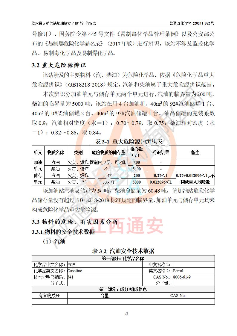 项目简介 | 修水县大桥供销加油站是一家专门从事成品油零售经营的个体工商户,经营场所位于江西省九江市修水县柯龙省道修水县大桥镇朱溪村。现有从业人员5名,其中安全管理人员1人,加油站负责人王华赞。 该加油站占地面积1833.4m2,站区内设置有3台四枪和1台双枪加油机及配套的工艺管线,设有SF双层储罐4台,其中40m3的92#汽油储罐1台、40m3的95#汽油储罐1台、40m3的0#柴油储罐2台,油品储罐总容积为160m3(折算成汽油为120m3),按现行《汽车加油加气加氢站技术标准》对加油站的等级划分原则,属二级加油站。 该站由九江市行政审批局换发《危险化学品经营许可证》(证号:赣九行审经(甲)字[2021]000086号),**期限2021年11月26日至2024年11月25日。 | |||