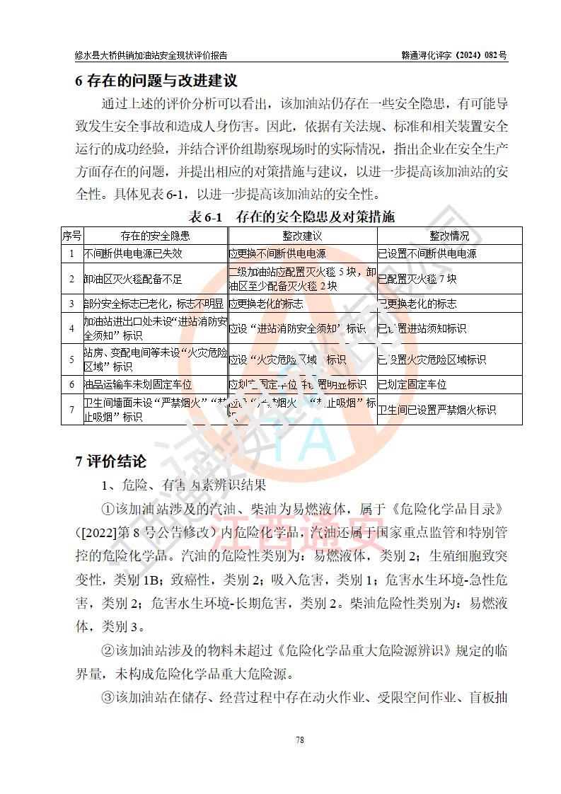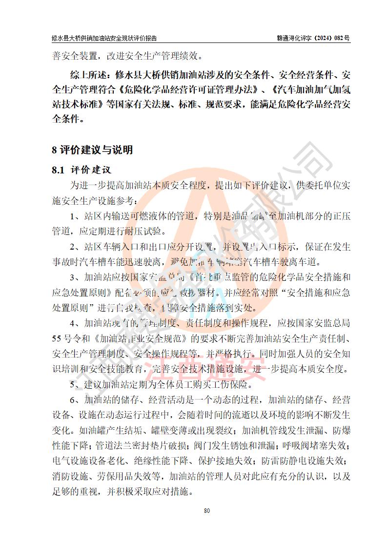 评价结论 | 修水县大桥供销加油站涉及的安全条件、安全经营条件、安全生产管理符合《危险化学品经营许可证管理办法》、《汽车加油加气加氢站技术标准》等**有关法规、标准、规范要求,能满足危险化学品经营安全条件。 | |||