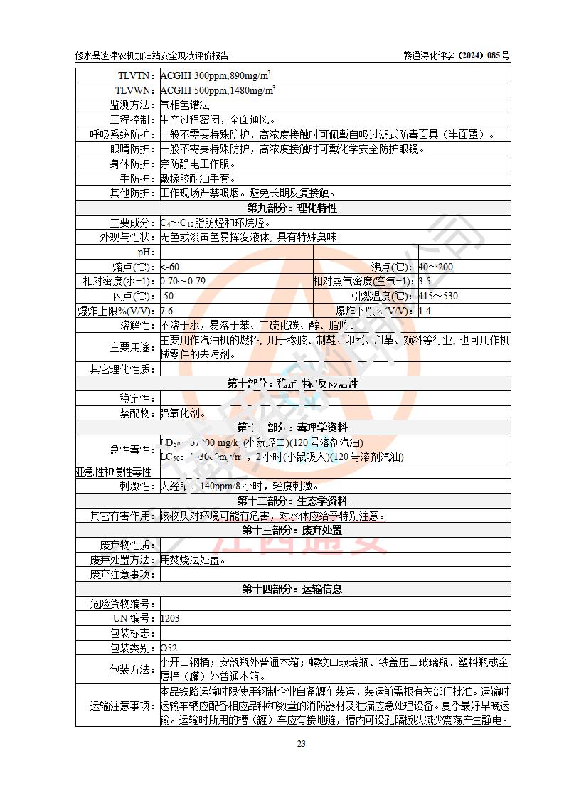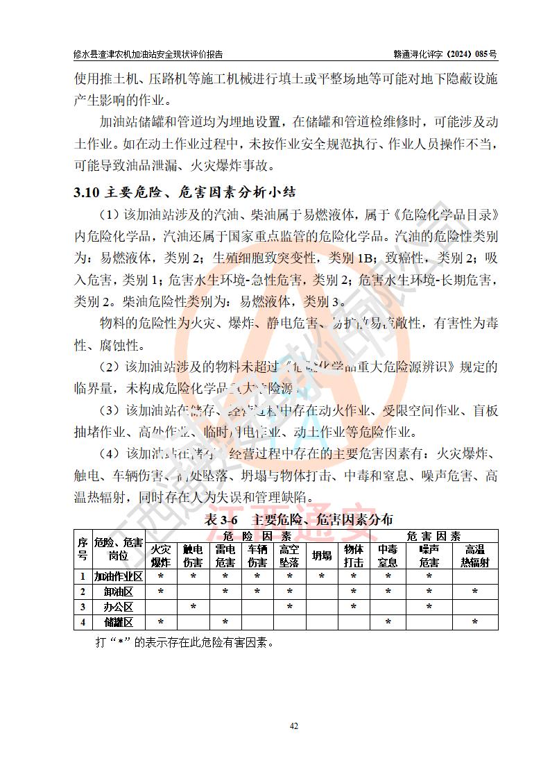 项目简介 | 修水县渣津农机加油站是一家专门从事成品油零售经营的个体工商户,经营场所位于江西省九江市修水县渣津镇津龙西大道114号。现有从业人员7名,其中安全管理人员1人,加油站负责人朱旺武。 该加油站占地面积850m2,站区内设置有4台双枪加油机及配套的工艺管线,设有SF双层储罐3台,其中30m3的92#汽油储罐1台、30m3的95#汽油储罐1台、50m3的0#柴油储罐1台,油品储罐总容积为110m3(折算成汽油为85m3),按现行《汽车加油加气加氢站技术标准》对加油站的等级划分原则,属三级加油站。 该站由九江市行政审批局换发《危险化学品经营许可证》(证号:赣九行审经(甲)字[2021]000084号),**期限2021年11月13日至2024年11月12日。 | |||