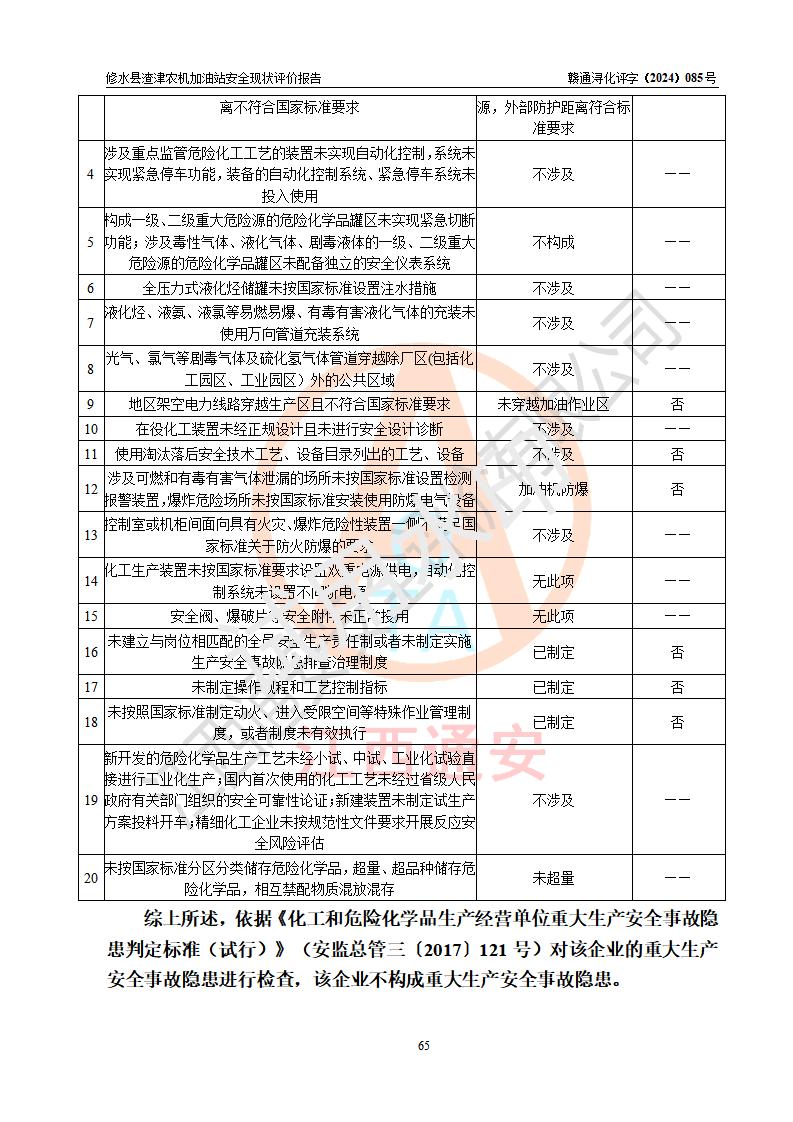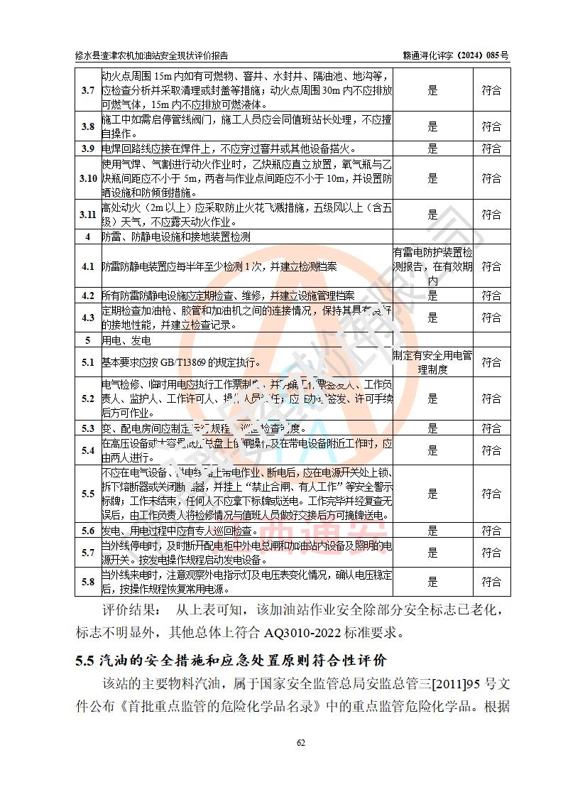 评价结论 | 修水县渣津农机加油站涉及的安全条件、安全经营条件、安全生产管理符合《危险化学品经营许可证管理办法》、《汽车加油加气加氢站技术标准》等**有关法规、标准、规范要求,能满足危险化学品经营安全条件。 | |||