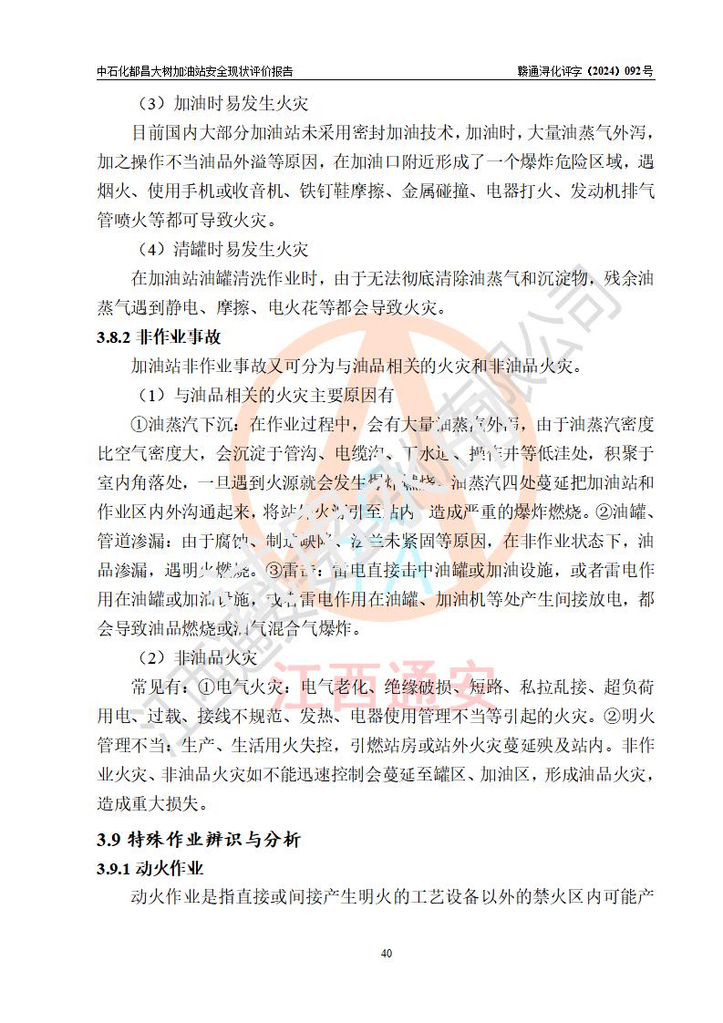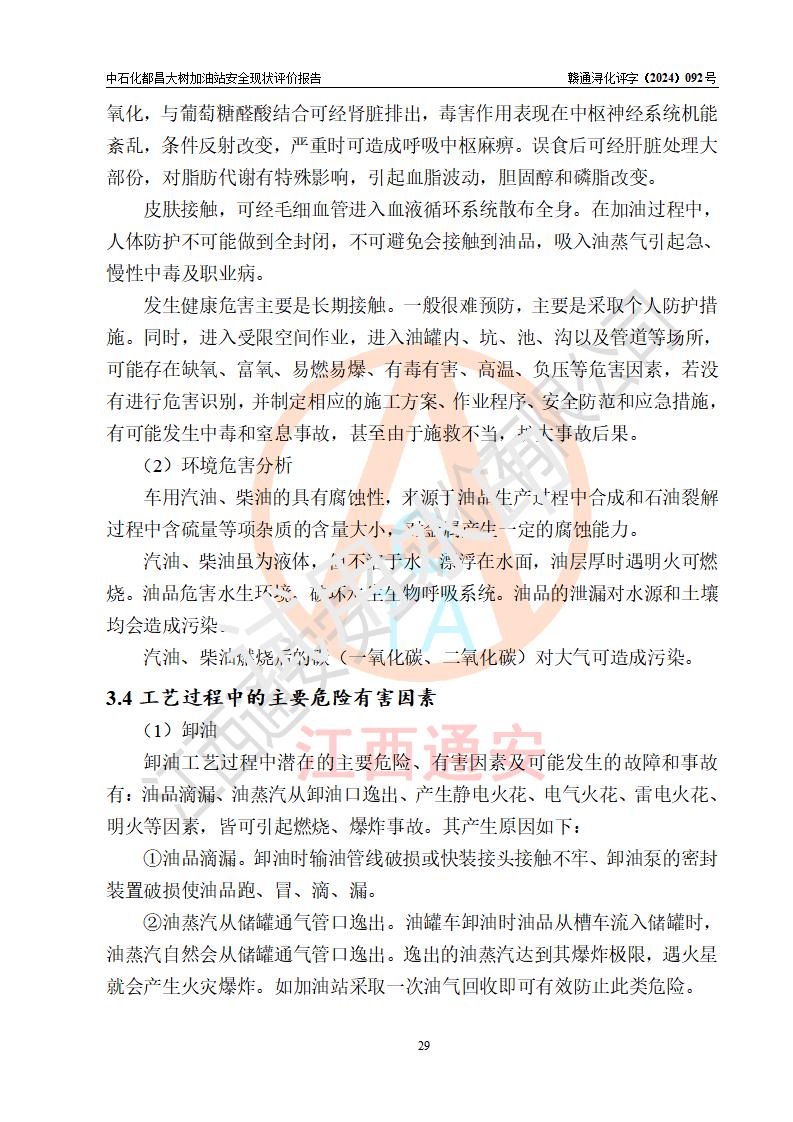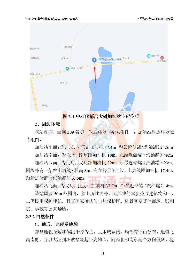 项目简介 | 中国石化销售股份有限公司江西九江都昌石油分公司大树加油站是一家专门从事成品油零售经营的有限公司分公司(外商投资企业分公司),经营场所位于江西省九江市都昌县大树乡烽火村。现有从业人员3名,其中安全管理人员1人,加油站负责人谈宇斌。 该加油站占地面积1840.9m2,站区内设置有3台双枪和1台四枪税控燃油加油机及配套的工艺管线,设有SF双层储罐4台,其中30m3的92#汽油储罐2台、30m3的95#汽油储罐1台、30m3的0#柴油储罐1台,油品储罐总容积为120m3(折算成汽油为105m3),按现行《汽车加油加气加氢站技术标准》对加油站的等级划分原则,属二级加油站。 该站由九江市行政审批局换发《危险化学品经营许可证》(证号:赣九行审经(甲)字[2021]000058号),**期限2021年09月30日至2024年09月29日。 | |||