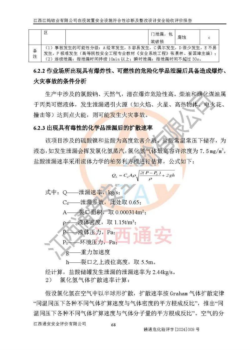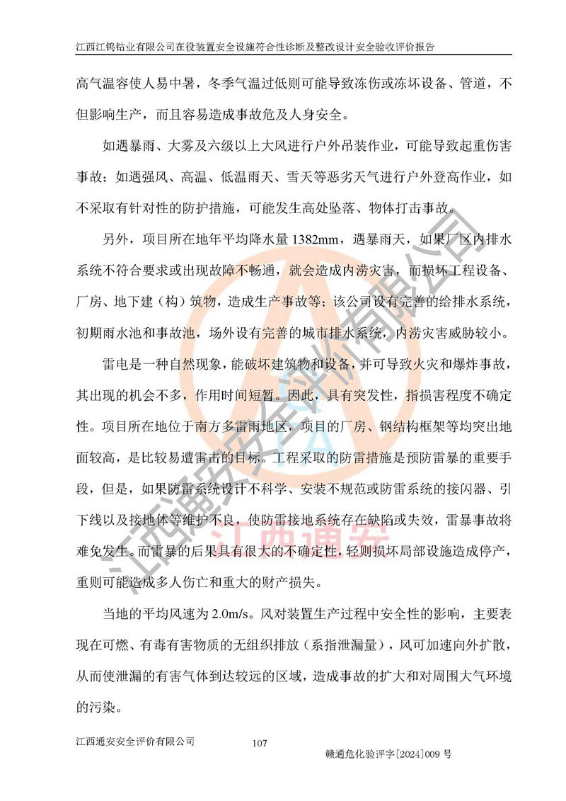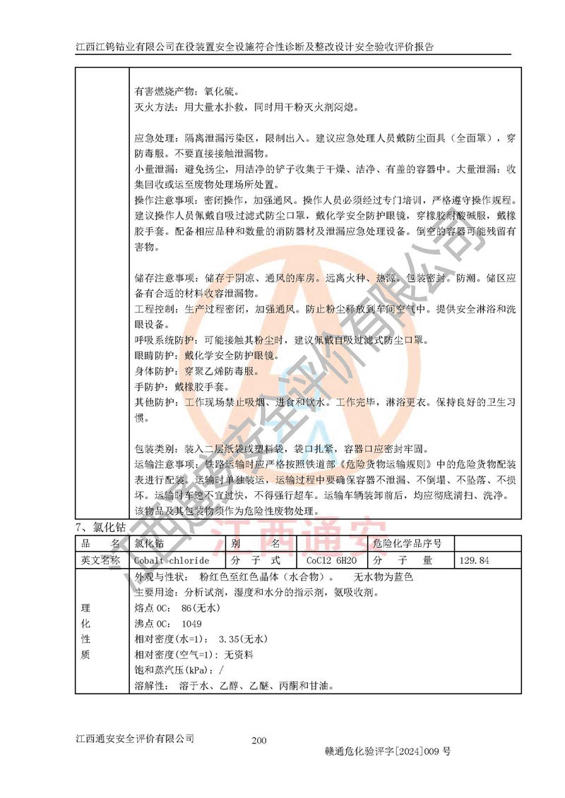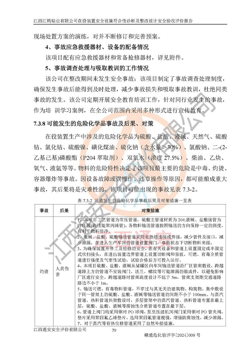 其它 | (1)该项目在原址上进行安全设施整改提升,在役装置与周边居民区、商业中心、公园等人口密集区域和学校、医 院、影剧院、体育场(馆)等公共设施,周边河流等八类场所的距离符合安全间距的要求,与周边建筑构物的防火间距满足要求。 (2)该项目根据《危险化学品生产装置和储存设施外部安全防护距离确定方法》(GB/T 37243-2019)和《危险化学品生产装置和储存设施风险基准》(GB 36894-2018),该项目的个人风险符合要求,根据社会风险分析效果图可知,该项目无社会风险。锅炉发生物理爆炸的多米诺半径局限在厂界内,企业会定期对锅炉、空气储罐及安全附件进行检测,锅炉操作工持证上岗,并加强日常的安全管理,可**降低发生物理爆炸的风险。 (3)该项目在正常生产情况下,对其周边单位的生产、经营活动和居民的生活影响很小。在发生事故的情况下对周边单位的生产、经营活动和居民的生活存在影响。该项目周边单位的生产、经营活动和居民的生活对该项目投产后的正常生产影响很小。该项目所在地自然条件(不包括地震等破坏力**的自然灾害)的变化对该项目投产后的正常生产没有影响。 二、建设项目安全设施设计的采纳情况和已采用(取)的安全设施水平 建设单位在整改过程中采纳了江西省化工设计院出具的《江西江钨钴业有限公司在役装置安全设施符合性诊断及整改设计》的安全措施建议及要求,针对性的采取了相应的预防措施。 三、建设项目试生产(使用)中表现出来的技术、工艺和装置、设备(设 施)的安全、可靠性和安全水平 该项目采用湿法冶炼工艺,本次隐患整改工程属于企业安全设施提升改造,未增加产能,主要工艺路线不变,浸出工序采用焦亚硫酸钠作为还原剂替代了二氧化硫,将三价钴还原为二价钴,反应机理相似,但降低了二氧化硫发生泄漏可能导致的人员中毒风险,另外公司已拆除了氨分解制氢装置、涉氢的生产装置已停产,消除了该装置火灾爆炸、中毒、容器爆炸等危险因素。 该项目无**明令淘汰的工艺和设备,设备、设施与工艺条件、内部 介质相适应,安全设备、设施基本齐全,安全附件及检测仪器、仪表定期 进行了校验,按规定设置了防雷、防静电接地,工艺管理及设备设施基本符合规范的要求。综上所述,生产装置选用的工艺技术安全可靠。 四、 建设项目试生产(使用)后具备**现行有关安全生产法律、法规和部门规章及标准规定和要求的安全生产条件 1)法律法规等方面的符合性:建设单位委托江西省化工设计院编制了《江西江钨钴业有限公司在役装置安全设施符合性诊断及整改设计》,通过了专家评审。安全设施设计、设备安装单位均由有资质的单位承担。 2)该项目与周边建构筑物的防火距离符合《建筑设计防火规范》的要求。根据《危险化学品生产装置和储存设施风险基准》GB36894-2018确定危险化学品单位周边重要目标和敏感场所承受的可容许个人风险和社会风险的定量风险评价。项目的个人风险计算结果表明,项目外部安全防护距离的包络线内无相应的防护目标。该软件未计算出社会风险。因此项目可容许个人风险和社会风险均在可接受范围内。 3)平面布置及常规防护设施措施的合理性:该项目生产场所、办公场所之间的间距满足安全要求,建筑结构、防火分区、防雷设施、安全出口的设置等满足安全生产的要求。消防道路的净宽度、净**、转弯半径均满足运输**及消防**通行。设置的常规防护设施、防止机械伤害、防急性中毒窒息的设施和措施符合要求。 4)设施、设备、装置及工艺方面的安全性:无**明令淘汰的工艺和 设备,生产工艺操作和设置的安全设施满足安全需要,生产设施的布置能保障人员疏散安全及操作方便。设施、设备、装置及工艺方面安全可靠。 5)特种设备、强制检测设备设施监督检验情况:该项目特种设备均进行了检验检测,并取得了检验报告;安全阀、压力表、气体探头也进行了校验,校验结论合格,特种设备及安全附件符合《特种设备安全监察条例》 等相关法律法规、条例的规定。 6)公用工程、辅助设施的配套性:为该项目生产配套的供水、供电、 供气、供热等满足需要。 7)人员管理及安全培训方面充分性:公司现已建立了安全管理机构, 配备了专职安全管理人员。主要负责人司杨继红具备有色冶金专业高级工程师职称,生产、设备、技术负责人何文龙具备冶金工程专业本科学历;安全负责人刘曾升具备化学工程专业本科学历,专职安全管理人员共5人,另配有一名注册安全工程师,专职安全管理人员均具有大专以上化工及安全专业相关学历。该公司制定了较完善的安全管理制度、岗位责任制、安全操作规程,制度执行情况较好。该公司已为从业职工交纳了工伤**。该公司对操作员工进行相关的培训和教育,经培训合格后上岗。 8)应急救援**性:公司结合自身的实际情况,按照有关标准、规范编制了生产安全事故应急预案。生产安全事故应急预案已在赣州市章贡区行政审批局进行了备案,备案编号为360702-2023-0057。详见附件应急救援预案备案登记表。该公司配备了应急救援人员和应急救援器材、设施,制定了演练计划并进行了演练,应急救援准备充分**。 9)依据《关于公布首批重点监管的危险化工工艺目录的通知》(原安监总管三[2009]116号)及《关于公布第二批重点监管危险化