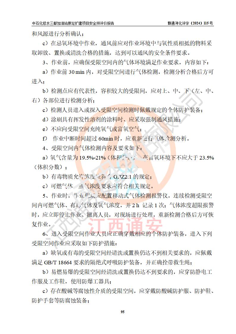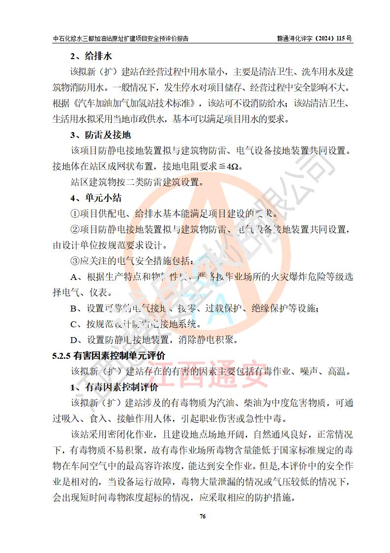 评价结论 | 中国石化销售股份有限公司江西九江修水石油分公司三都加油站原址扩建项目的选址、自然条件适宜该项目工程的建设;项目规划设计中的总体布局方案可行,符合有关法规、标准要求;项目选择的工艺过程及设备设施的安全可靠性能达到**法规、标准规定要求;项目存在的危险有害因素可控,在落实项目建设方案及评价报告提出的有关安全对策措施后,其危险有害程度能达到可以接受的程度,项目建设能够实现安全运行的目标。 | |||