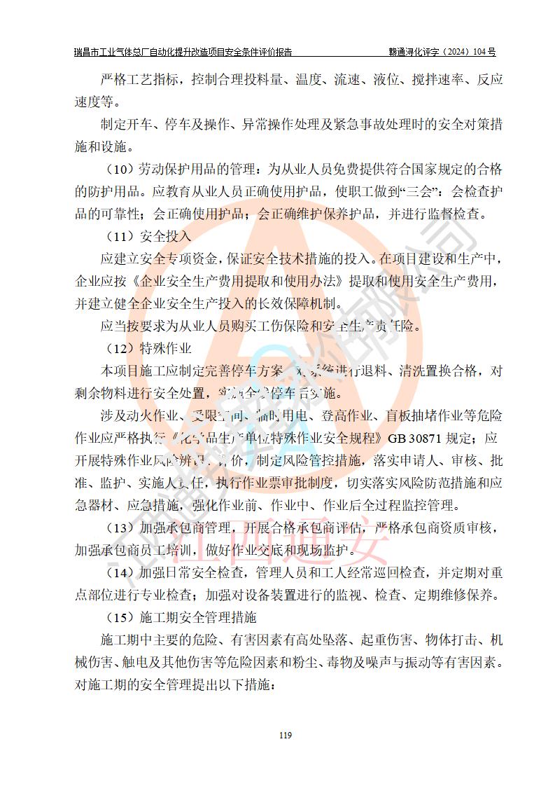 评价结论 | 瑞昌市工业气体总厂自动化提升改造项目选择的工艺过程及设备设施的安全可靠性能达到**法规、标准规定要求;项目存在的危险有害因素可控,在落实本评价报告提出的有关安全对策措施后,其危险有害程度能达到 可以接受的程度,项目建设能够实现安全运行的目标。 | ||||