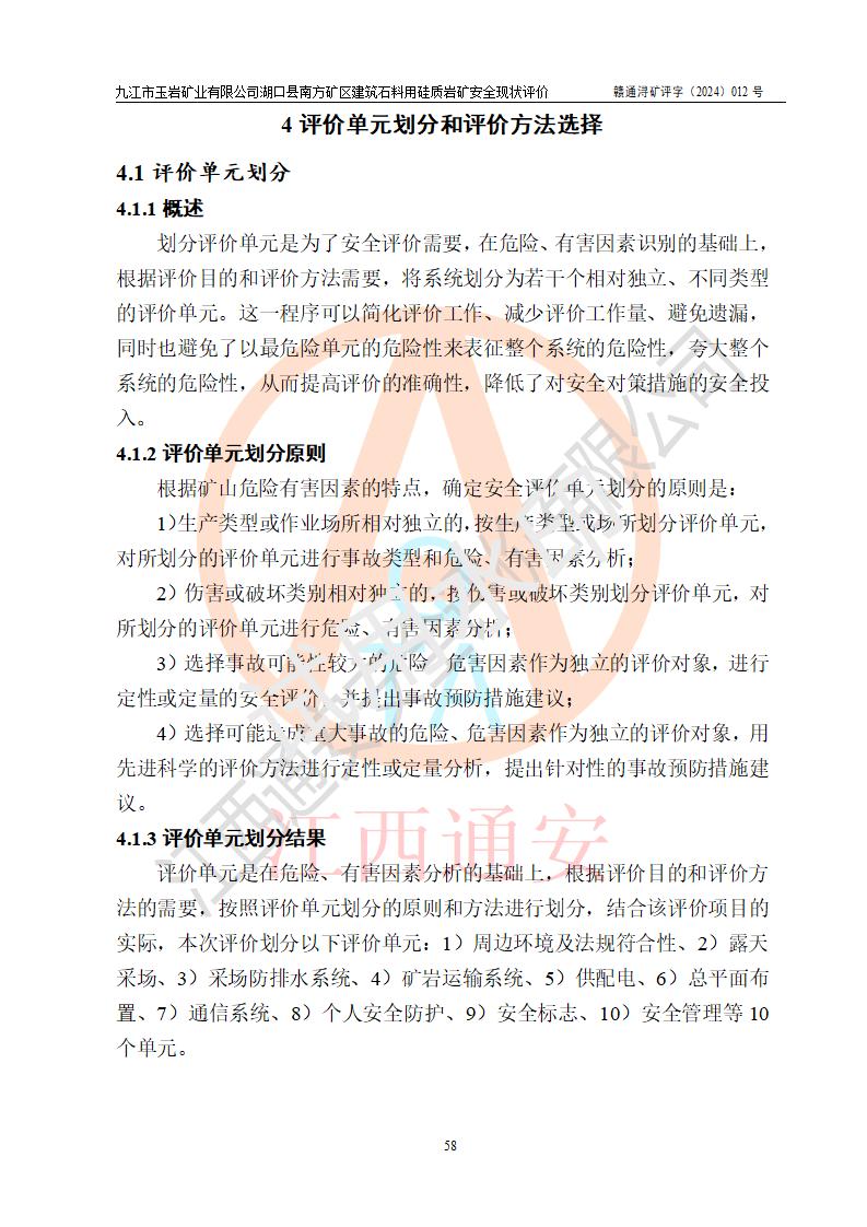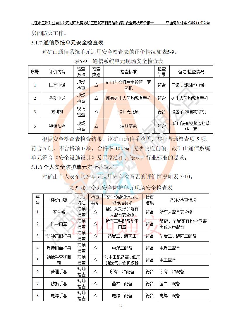 评价结论 | 总体结论:九江市玉岩矿业有限公司湖口县南方矿区建筑石料用硅质岩矿的周边环境符合法规要求;安全设施总体符合《九江市玉岩矿业有限公司湖口县南方矿区建筑石料用硅质岩矿安全设施设计》和**安全生产法律法规、标准规范的要求,风险可控,满足安全生产条件。 | |||||