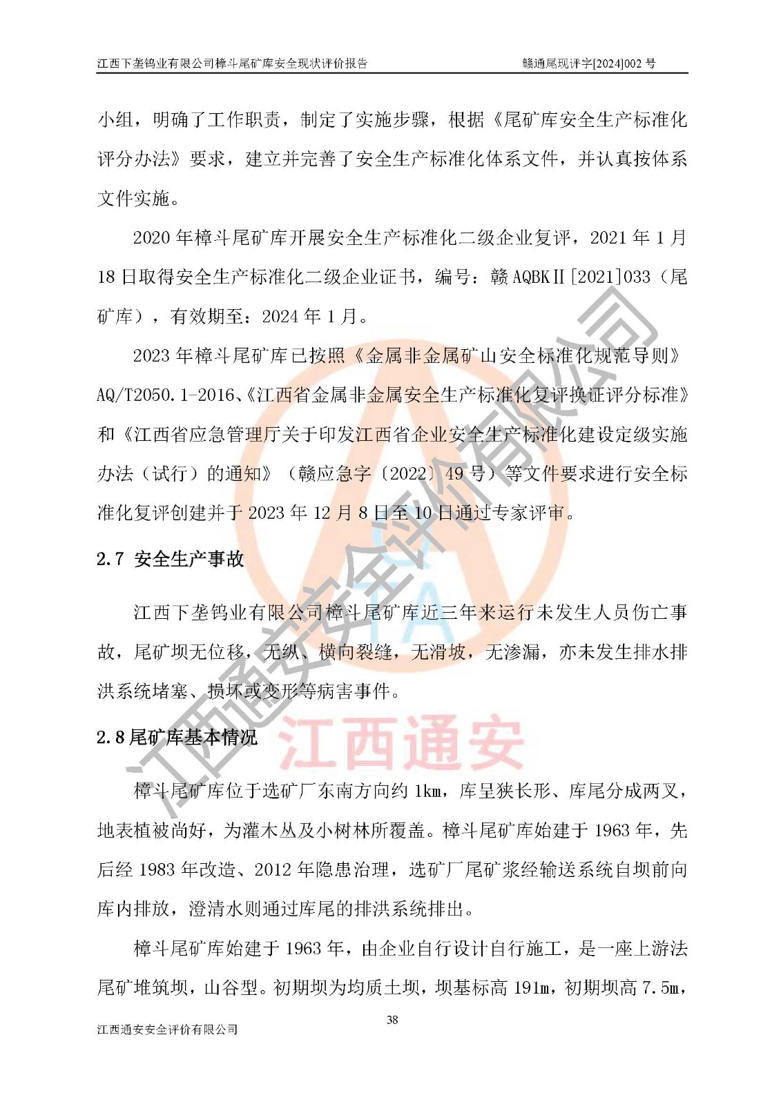 项目简介 | 江西下垄钨业有限公司的前身是下垄钨矿,1954年建成投产,现属江西钨业集团有限公司成员单位,2004年8月改制,成立公司。该公司现有两座尾矿库,大坪尾矿库已停用,樟斗尾矿库正在使用。 樟斗尾矿库位于该公司樟斗矿区,用于堆存该公司选矿厂的尾矿,现由公司选矿厂管理。其地理位置为江西省大余县樟斗镇樟斗村,地理座标为东经114025′16″,北纬25033′08″。樟斗矿区距大余县城25㎞,距京九铁路南康车站36㎞,距赣韶公路(323国道)新城车站15㎞,矿区有水泥公路与之相通,交通方便。 樟斗尾矿库始建于1963年,1982年进行改造,2012年进行隐患综合治理,采用上游式堆坝,属山谷型,因尾矿库下游有居民提等为二等尾矿库。总坝高69m,设计总库容730×104m3,**库容561.0×104m3,已入库尾矿总量258×104m3,尚剩余**库容303.0×104m3。2023年7月19日樟斗尾矿库取得了江西省应急管理厅变更换发的安全生产许可证,证书编号(赣)FM安许证字[2006]M0222号,**期从2021年03月16日到2024年03月15日,为三年期,依照《非煤矿矿山企业安全生产许可证延期换证工作》的通知,根据***《安全生产许可证条例》、《江西省安全生产条例》、《非煤矿山安全生产许可证实施办法》、《江西省非煤矿矿山企业安全生产许可证办法》规定及非煤矿山安全评价导则的要求,受江西下垄钨业有限公司委托,我公司承担樟斗尾矿库证延期换证的安全现状评价工作。 | |||