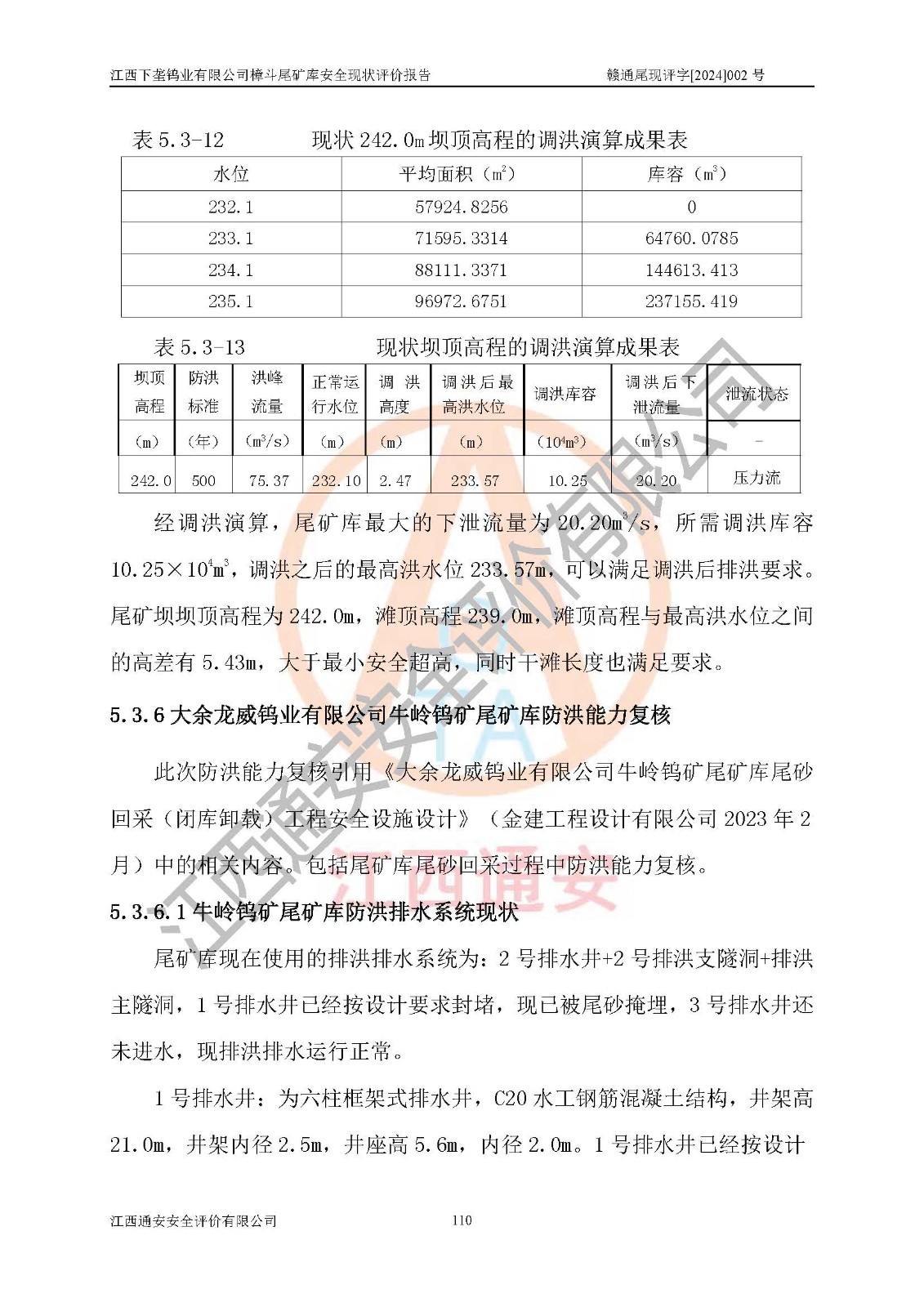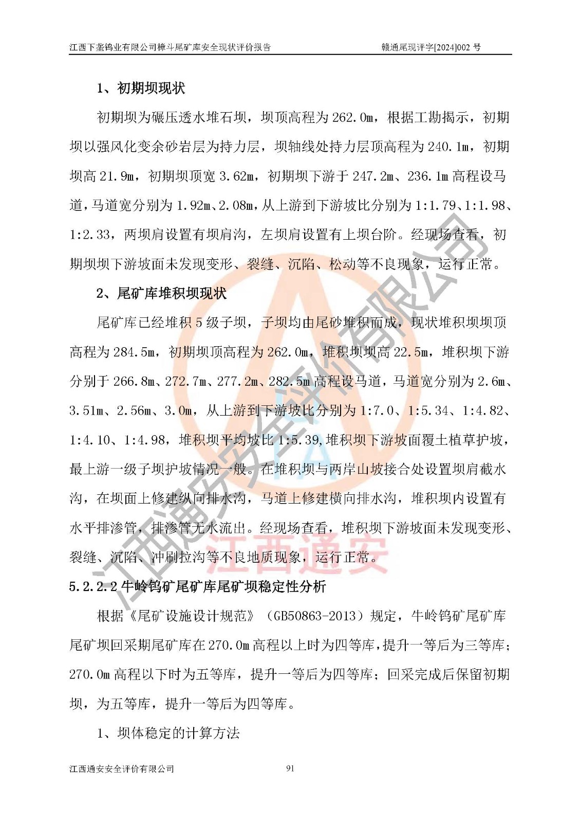 评价结论 | 江西下垄钨业有限公司樟斗尾矿库安全生产条件较好,为正常库,具备继续生产运行的安全生产条件。 | |||
