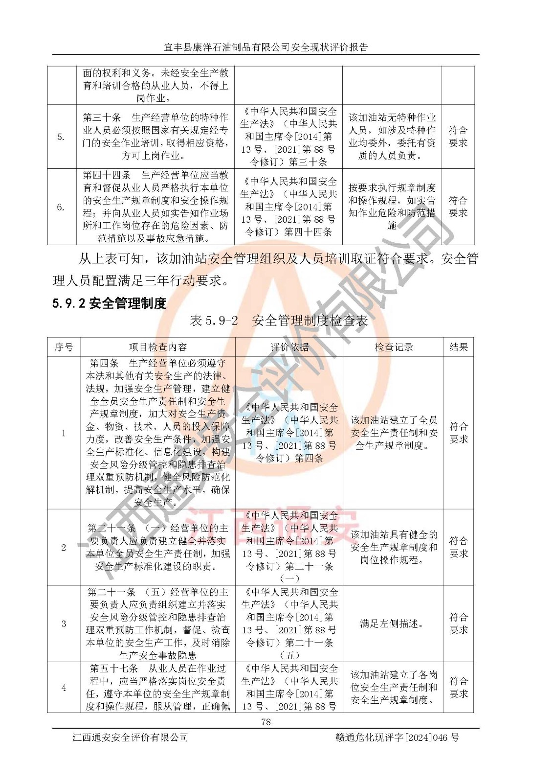 该企业属三级加油站,主要从事成品油零售经营,经营的油品有0#柴油、92#汽油和95#汽油。 该项目为一功能集中的加油站,且设备设施集中在站区内,根据空间相对独立、事故范围相对固定、具有明显特征界限的原则,评价小组确定将其划分为一个评价单元。选择安全检查表法和危险指数方法进行评价。 1、加油站涉及的汽油、柴油属于易燃液体,汽油属于重点监管的危险化学品;不构成《危险化学品重大危险源辨识》规定危险化学品重大危险源。 2、经营过程中存在的主要危险有:火灾、爆炸等。 3、该站的选址、自然条件、总体布局、周边环境符合《建筑设计防火规范》、《汽车加油加气站设计与施工规范》的要求。 4、采用检查表法评价,该站总体上符合零售经营成品油的安全经营条件。 5、经采用危险度评价法分析,油罐区主要危险物质为汽油,属甲B类可燃液体,故物质取5分;油罐区内油总储量为210m³(柴油折半计算),故容量取10分;本单元在常温、常压下储存,故温度、压力,取0分;单批式作业,使用机械进行程序操作有**危险,取2分。油罐区得分为17分,为I级,属**危险。针对安全风险,油罐区采取了措施:油罐采用双层罐,埋地设置,按要求设置了通气管,并装设了阻火器;设置了液位监测报警报警系统和紧急切断系统,其安全风险可控。 6、企业在完善评价报告表6.3-1中企业存在的问题后,其涉及的安全条件、安全经营条件、安全生产管理、应急管理符合《危险化学品经营许可证管理办法》、《汽车加油加气站设计与施工规范》等**有关法规、标准、规范要求,可以满足危险化学品经营安全条件。 |