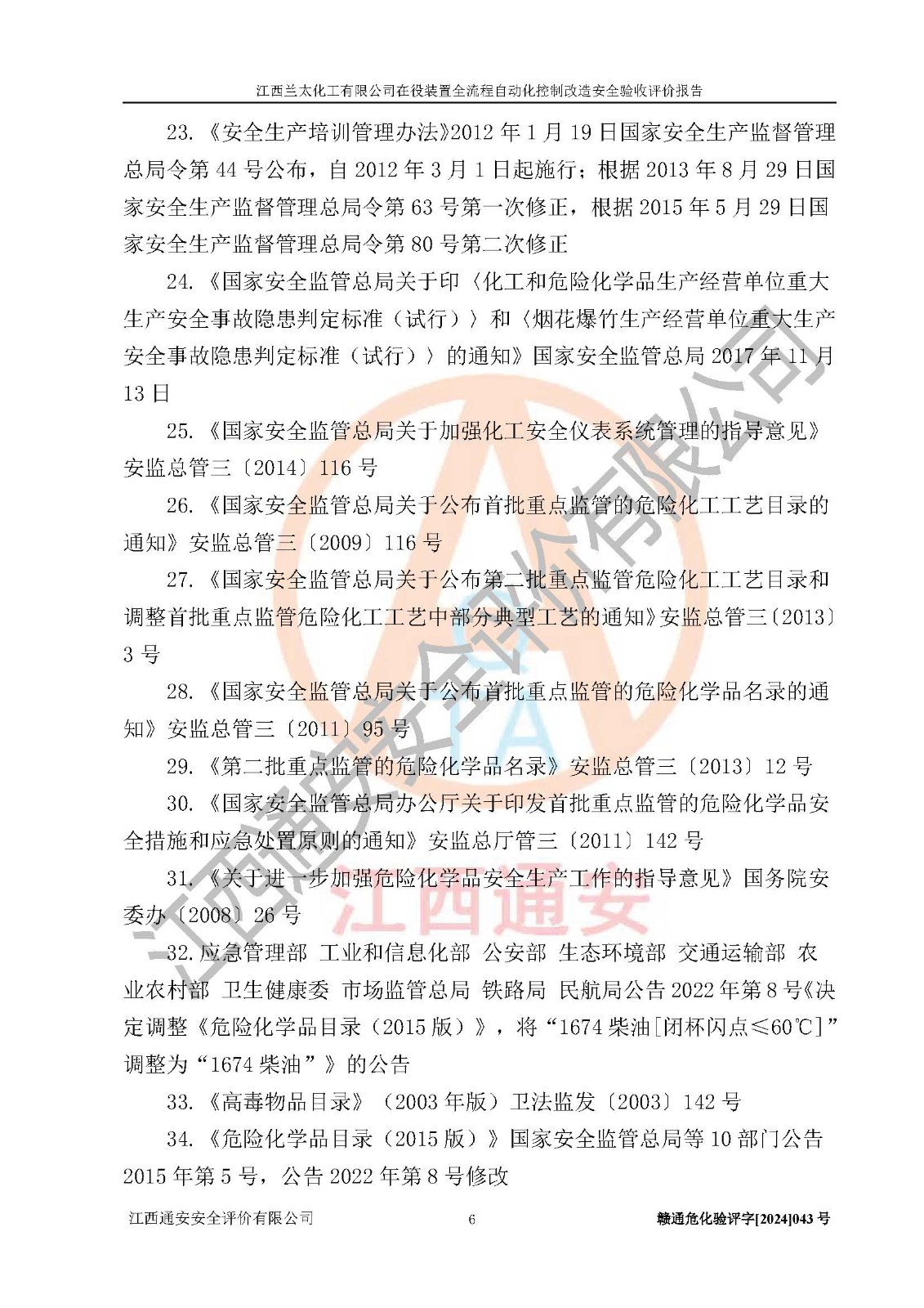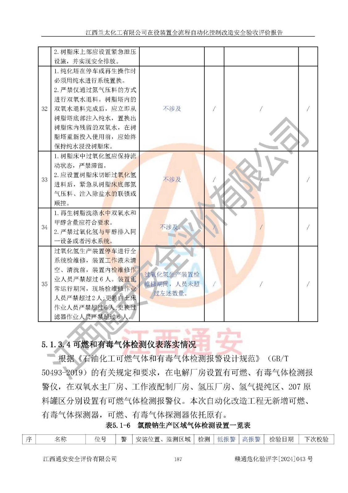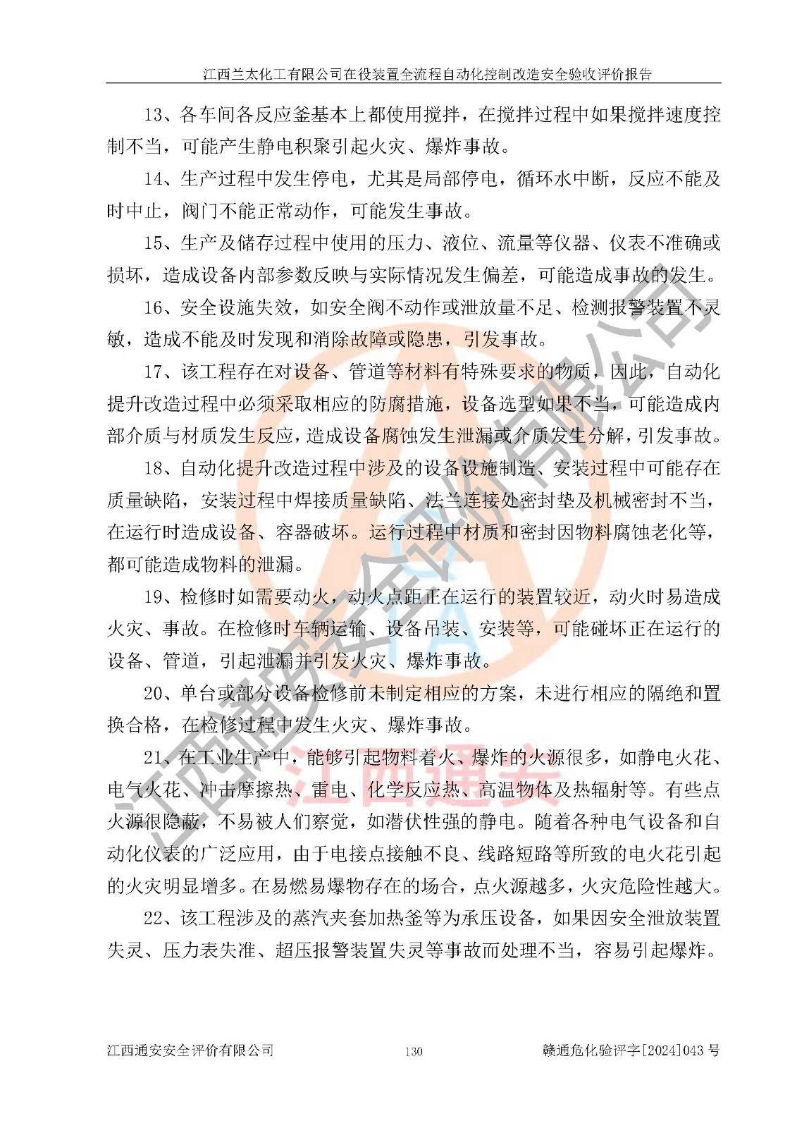 江西兰太化工有限公司于2008年5月成立,公司位于江西省吉安市新干县盐化工业城北区,公司法人**:李威。公司类型:有限责任公司(自然人投资或控股)。江西兰太化工有限公司是一家氯酸钠、双氧水产品的生产、销售(凭许可证**期限经营);化工产品(不含化学危险品及易制毒化学品)批发及零售;进出口经营权。(依法须经批准的项目经相关部门批准后方可开展经营活动)的有限责任公司。 江西兰太化工有限公司现有安全生产许可证**期至2024年8月30日,证书编号:(赣) WH 安许证字【2012】 0714 号,许可范围:氯酸钠 (50kt/a ) 、双氧水 (27.5%、 35% 、50% ,折合 27.5% 、150kt/a )。 项目生产过程中涉及的物料和成品中属于危险化学品的有:氯酸钠、双氧水、氯化氢、氢气、次氯酸钠、重铬酸钠、氯气(尾气产生微量)、氢氧化钠、盐酸、磷酸、氮气[压缩的]、芳烃(以**苯为主)、柴油(柴油发电机使用)等。项目涉及的盐酸属于第三类易制毒化学品。不涉及的重点监管的危险化学品。该工程涉及的氯气(尾气产生微量)属于剧毒化学品。该工程涉及的氯气(尾气产生微量)、重铬酸钠属于高毒物品。该工程涉及的重铬酸钠、氯酸钠、双氧水属于易制爆化学品。项目氯酸钠生产过程中的电解反应和双氧水生产过程的氢化反应、过氧化反应均为重点监管的危险化工工艺。公司201罐区构成三级危险化学品重大危险源,202氯酸钠危险化学品仓库、205氯酸钠危险化学品仓库、206氯酸钠危险化学品仓库分别构成四级危险化学品重大危险源。 |
