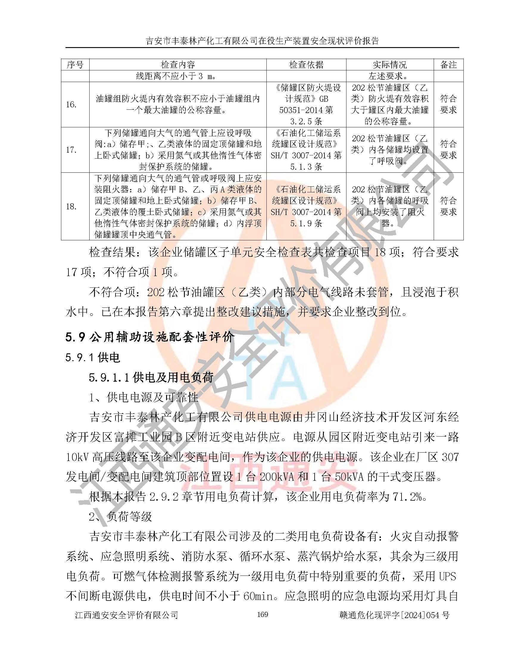 评价结论 | 评价结论:本报告认为,吉安市丰泰林产化工有限公司在役生产装置现场情况与设计图纸一致,有关从业人员资格符合《江西省危险化学品安全专项整治三年行动实施方案》要求,安全设施及安全管理符合**及有关部门关于安全生产法律法规、标准的要求,安全设施正常投用且运行**,安全风险是可以控制的,其风险程度是可以接受的,安全现状符合安全生产条件,能够满足安全生产的要求。 | |||