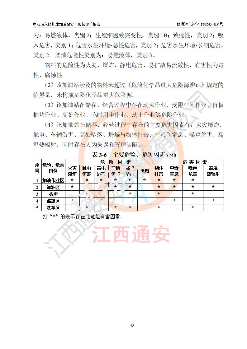 项目简介 | 中国石油天然气股份有限公司江西九江永修县虬津加油站是一家专门从事成品油零售经营的股份有限公司分公司(上市、国有控股),经营场所位于江西省九江市永修县虬津镇105国道西侧。现有从业人员5名,其中安全管理人员1人,加油站负责人杨全荣。 该加油站占地面积4000.74m2,站区内设置有4台四枪税控燃油加油机及配套的工艺管线,设有SF双层储罐5台,其中30m3的92#汽油储罐2台、30m3的95#汽油储罐1台、30m3的0#柴油储罐2台,油品储罐总容积为150m3(折算成汽油为120m3),按现行《汽车加油加气加氢站技术标准》对加油站的等级划分原则,属二级加油站。 该站由九江市行政审批局换发《危险化学品经营许可证》(证号:赣九行审经(甲)字[2021]000068号),**期限2021年11月07日至2024年11月06日。 | |||
