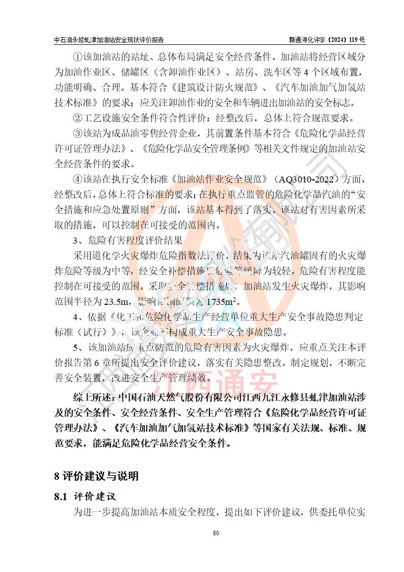 评价结论 | 中国石油天然气股份有限公司江西九江永修县虬津加油站涉及的安全条件、安全经营条件、安全生产管理符合《危险化学品经营许可证管理办法》、《汽车加油加气加氢站技术标准》等**有关法规、标准、规范要求,能满足危险化学品经营安全条件。 | |||