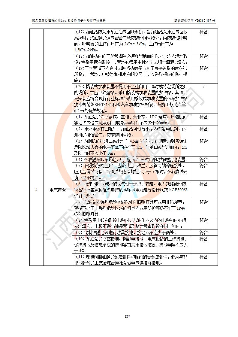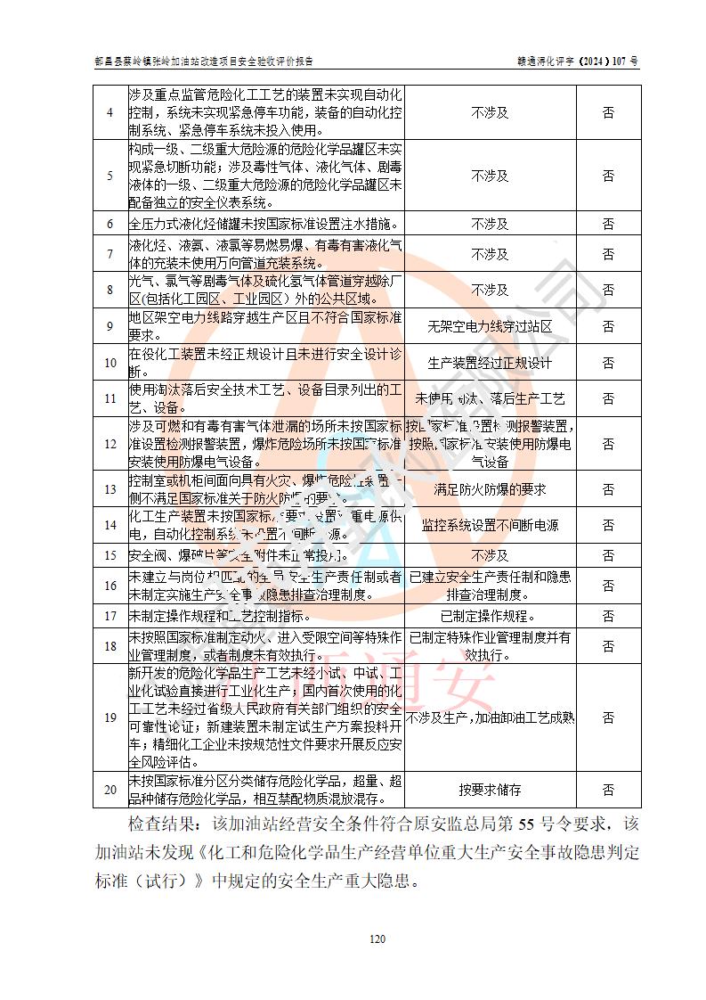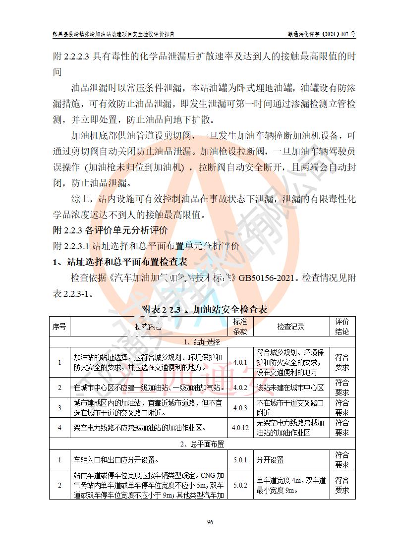 评价结论 | 都昌县蔡岭镇张岭加油站改造项目涉及的安全条件、安全生产条件、安全生产管理符合《危险化学品经营许可证管理办法》、《汽车加油加气加氢站技术标准》等**有关法规、标准、规范要求,能满足成品油零售经营单位的安全条件,具备项目竣工验收的条件。 | |||