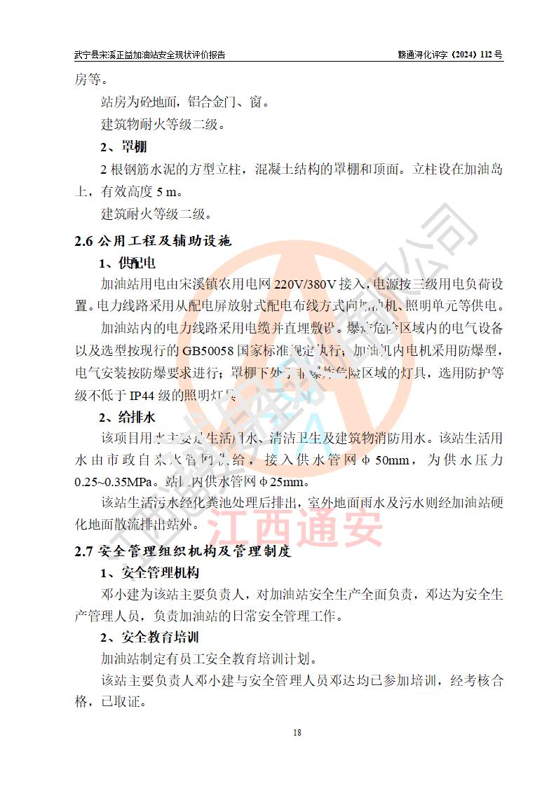 项目简介 | 武宁县宋溪正益加油站是一家专门从事成品油零售经营的个体工商户,经营场所位于江西省九江市武宁县宋溪集镇。现有从业人员3名,其中安全管理人员1人,加油站负责人邓小建。 该加油站占地面积约595.2m2,站区内设置有2台双枪程控燃油加油机及配套的工艺管线,设有SF双层储罐2台,其中30m3的92#汽油储罐1台、30m3的0#柴油储罐1台,油品储罐总容积为60m3(折算成汽油为45m3),按现行《汽车加油加气加氢站技术标准》对加油站的等级划分原则,属三级加油站。 该站由九江市行政审批局换发《危险化学品经营许可证》(证号:赣九行审经(甲)字[2021]000100号),**期限2021年12月31日至2024年12月30日。 | |||