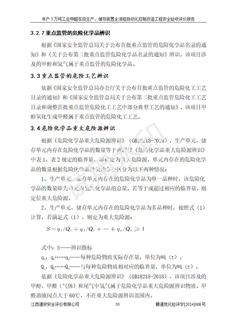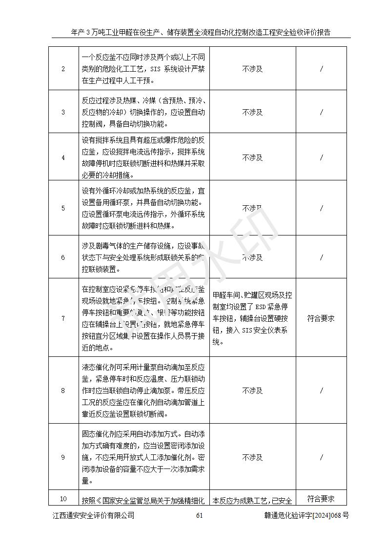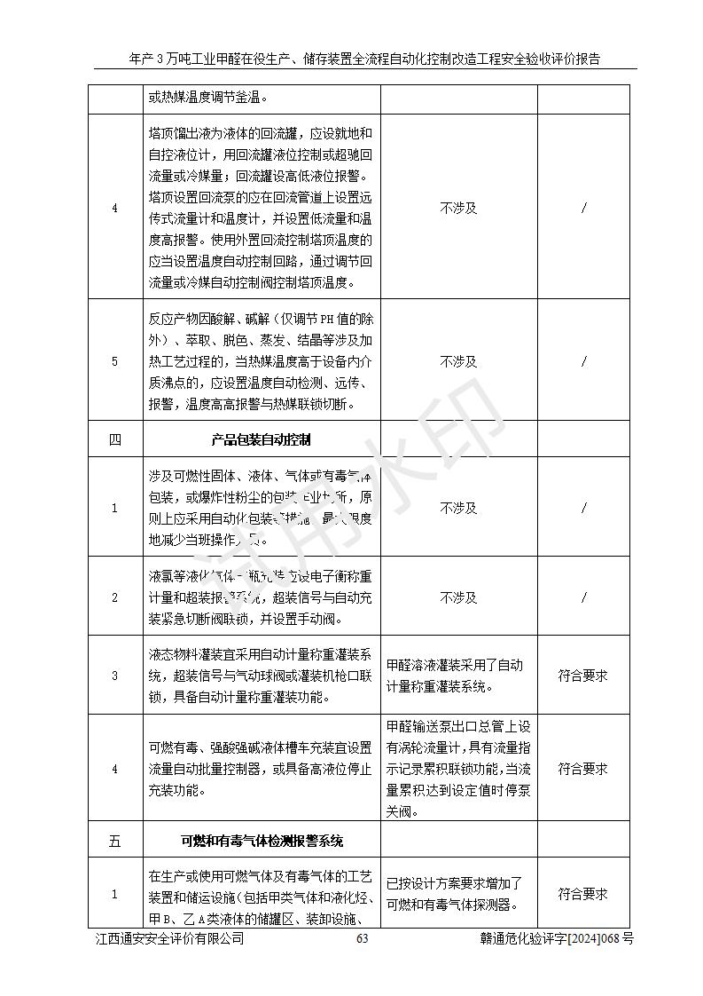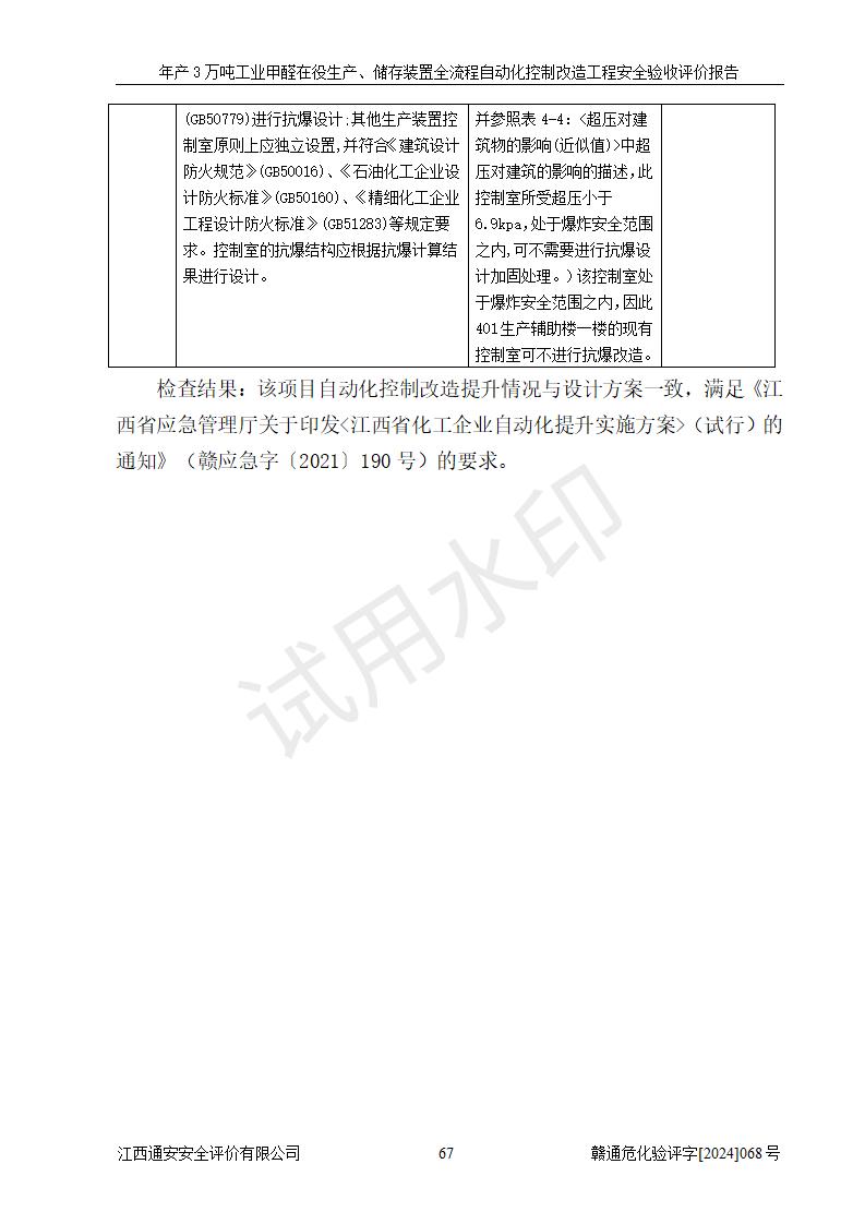 评价结论 | 信丰县东新合成材料有限公司年产3万吨工业甲醛在役生产、储存装置全流程自动化控制改造设计方案中提出的控制措施已得到落实,自动化控制系统设置情况与设计方案一致,满足《江西省应急管理厅关于印发<江西省化工企业自动化提升实施方案>(试行)的通知》(赣应急字〔2021〕190号)的要求,具备自动化控制改造工程竣工验收条件。 | ||||||