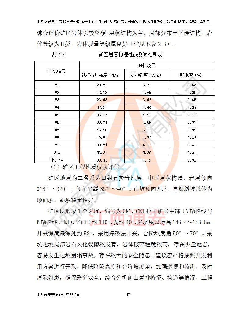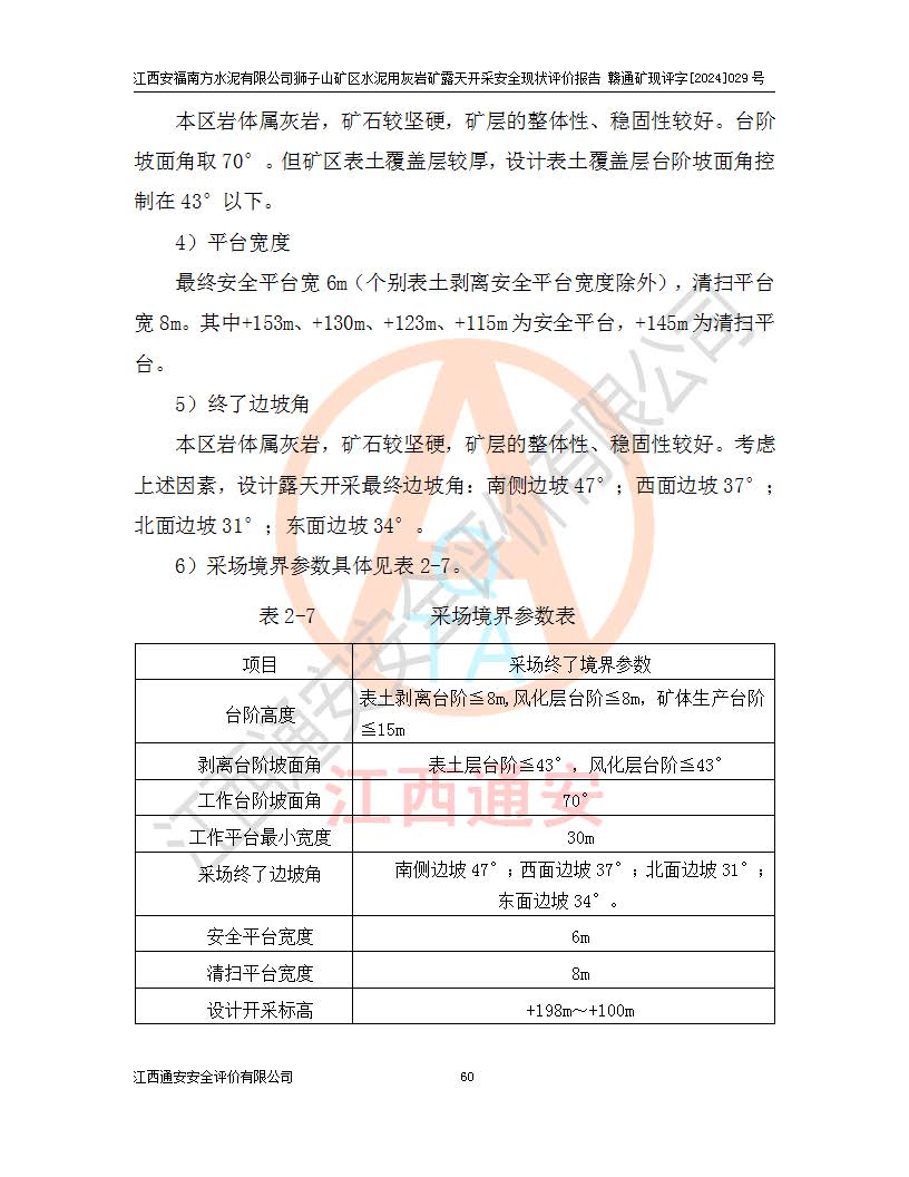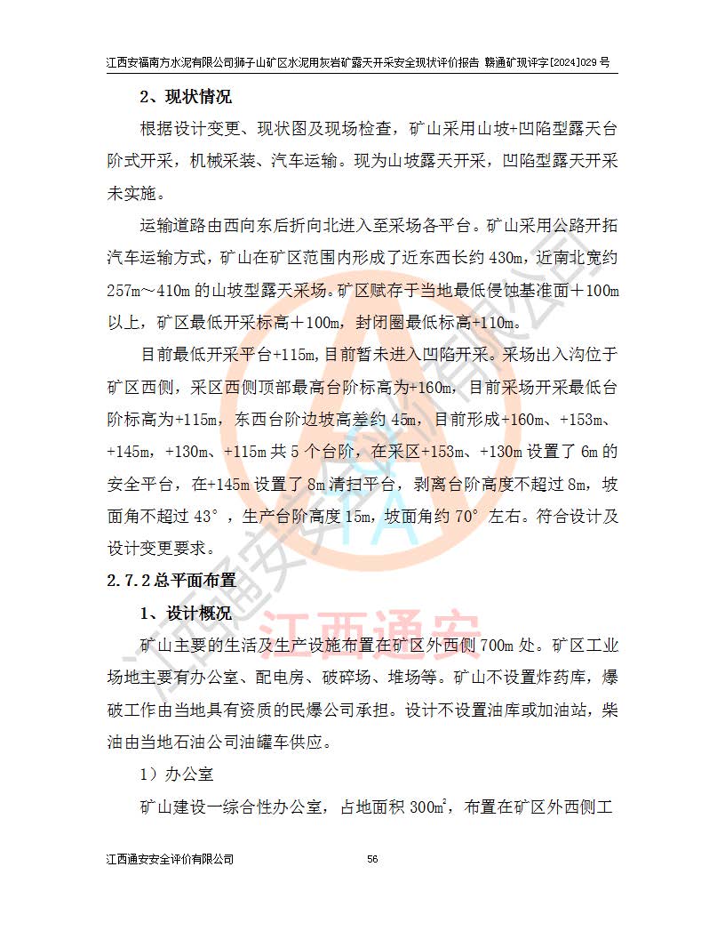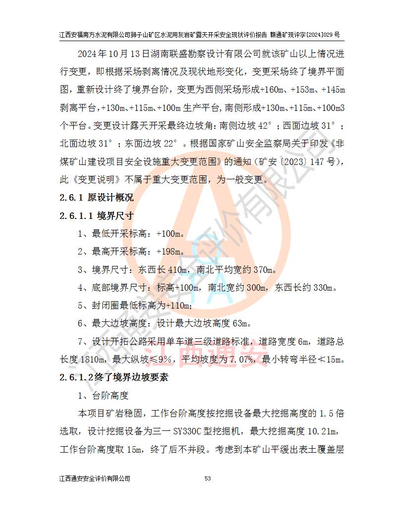 项目简介 | 江西安福南方水泥有限公司安福县狮子山水泥用石灰岩矿采矿权人为安福县金来山砂石有限公司。江西安福南方水泥有限公司安福县狮子山水泥用石灰岩矿矿区位于安福县县城165°方向直距约8km处,行政区划分所在地隶属安福县寮塘乡管辖。安福县金来山砂石有限公司成立于2019年10月,安福县市场监督管理局为其颁发《营业执照》。企业性质为有限责任公司,法定**人为张五苟。 该矿山2008年之前由安福县齐峰水泥有限责任公司通过“招拍挂”形式获得,2008年矿山法人变更为安福县南方水泥有限公司,2020年5月矿山采矿权人变更为安福县金来山砂石有限公司。安福县金来山砂石有限公司注册地在江西省吉安市安福县公路分局东侧商会大厦B座23楼B231。 2020年7月,安福县金来山砂石有限公司申请变更采矿标高,将开采标高+200m~+110m变更为+200m~+100m,吉安市自然资源局于2020年7月29日重新预划定矿区范围,保留期为两年。2020年8月江西省地质矿产勘查开发局九0二地质大队提交了《江西省安福县狮子山矿区水泥用灰岩矿资源储量核实报告》,根据资源储量核实结果,安福县金来山砂石有限公司于2020年11月申报了缩界,吉安市自然资源局作了批复,文号为吉市自然资采划字[2020]28号,缩界后,矿区范围由7个拐点圈定,矿区面积0.1588km2。2020年11月,该公司委托江西省地质矿产勘查开发局九0二地质大队编制了《江西省安福县狮子山矿区水泥用灰岩矿矿产资源开发利用、地质环境保护与土地复垦方案》及相关技术图纸;2020年4月由江西通安安全评价有限公司编制并提交了《安福县金来山砂石有限公司安福县狮子山水泥用灰岩矿露天开采建设项目安全预评价报告》。 2021年7月,企业委托湖南联盛勘察设计有限公司编制了《江西安福南方水泥有限公司狮子山矿区水泥用灰岩矿露天开采建设项目安全设施设计》。安福县应急管理局组织专家对报告进行了审查,报告通过了评审并获得了批复(安应急字[2021]45号)。 江西安福南方水泥有限公司安福县狮子山矿区水泥用灰岩矿露天开采采用公路开拓,汽车运输,按自上而下分台阶开采,设计台阶**15m,台阶坡面角70°,首采平台为+175m,安全平台6m,清扫平台8m,生产规模55万吨/年。 2021年11月,江西安福南方水泥有限公司安福县狮子山矿区水泥用灰岩矿通过验收,2021年11月26日,矿山取得了安福县应急管理局颁发的安全生产许可证,编号:(赣)FM安许证字[2021]DAF02号,**期:2021年11月26日至2024年11月25日。 安福县金来山砂石有限公司根据《中华人民共和国安全生产法》、《安全生产许可证条例》等有关法律、法规、部门规章的规定,严格按照《安全设施设计》进行开采生产,在开采过程中,一是由于矿山表土覆盖层较厚,且受矿山周边公益林征地及地形的限制,原设计的排土未启用,采场西侧剥离平台未能剥离到位,现西侧平台*高标高约+160m。压覆了部分矿量,导致西侧的开采境界未到边;二是在采场南侧由于地形变化及开采变化,现开采标高约+135m,原设计*高终了平台+153m,采场南侧的终了平台**与原设计的终了平台**不一致,矿山采场终了平台等安全设施与《安全设施设计》不相符,为**安全设施符合性,湖南联盛勘察设计有限公司就该矿山开采平台及终了平台等有关情况进行变更。 2024年10月13日湖南联盛勘察设计有限公司就该矿山以上情况进行变更,即根据采场剥离情况及现状地形变化,变更采场终了境界平面图,重新设计终了境界台阶,变更为西侧采场形成+160m、+153m、+145m剥离平台,+130m、+115m、+100m生产平台,南侧形成+130m、+115m、+100m3个平台。变更设计露天开采*终边坡角:南侧边坡42°;西面边坡31°;北面边坡31°;东面边坡22°。根据**矿山安全监察局关于印发《非煤矿山建设项目安全设施重大变更范围》的通知(矿安〔2023〕147号),此《变更说明》不属于重大变更范围,为一般变更。 2024年11月江西通安安全评价有限公司编制了《安福县金来山砂石有限公司江西安福南方水泥有限公司狮子山矿区水泥用灰岩矿边坡稳定性分析评估报告》,结论是:安福县金来山砂石有限公司江西安福南方水泥有限公司狮子山矿区水泥用灰岩矿边坡工程安全等级为Ⅲ级,处于安全、稳定状态,属于正常级、安全运行的露天采场,现状符合安全生产条件。 根据《安全生产法》、《矿山安全法》、《安全生产许可证条例》、《非煤矿矿山企业安全生产许可证实施办法》和原江西省安全生产监督管理局《关于做好非煤矿矿山企业安全生产许可证延期换证工作的通知》的要求,企业委托江西通安安全评价有限公司对狮子山矿区水泥用灰岩矿进行安全现状评价。 | |||