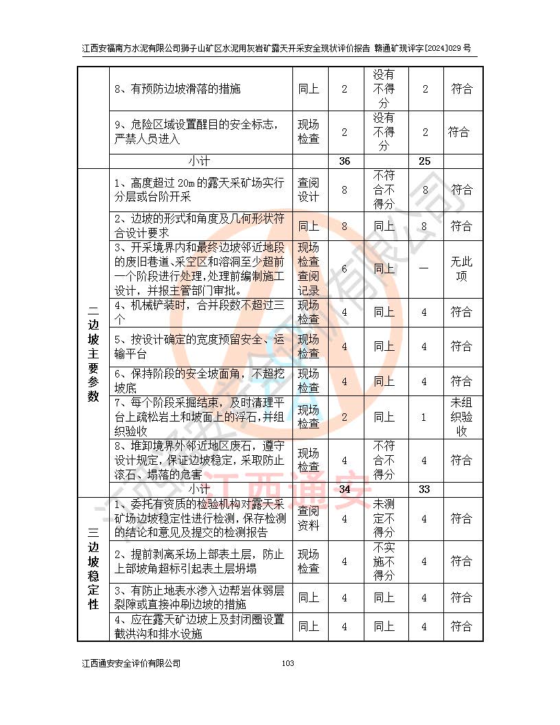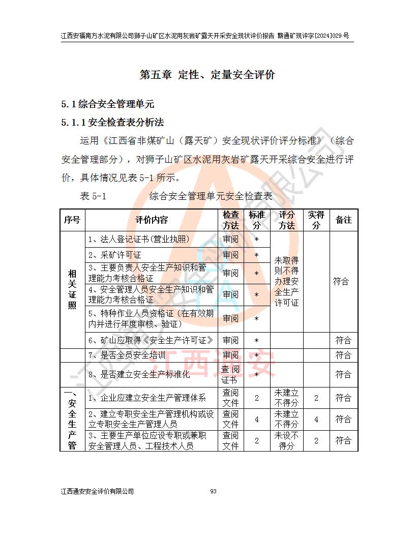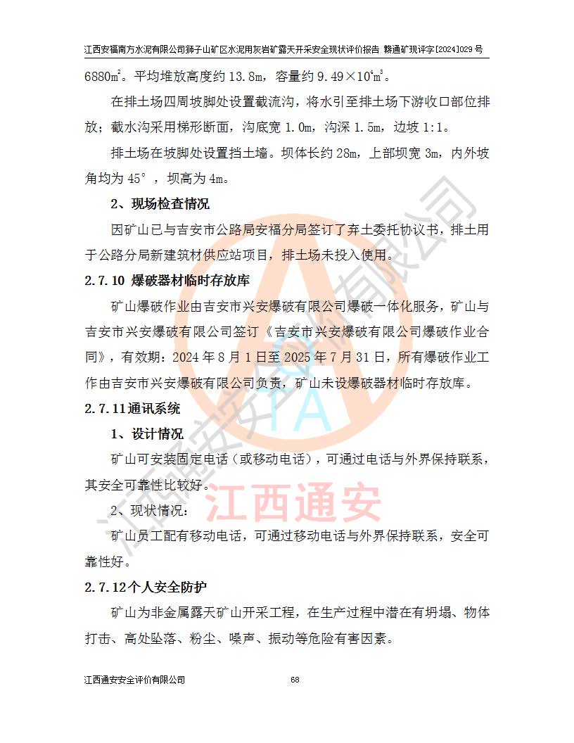 评价结论 | 综上所述,江西安福南方水泥有限公司狮子山矿区水泥用灰岩矿设备、设施和场所符合**安全生产有关法律、法规、标准及规范的要求。安全设施符合《安福县金来山砂石有限公司江西安福南方水泥有限公司狮子山矿区水泥用灰岩矿露天开采建设项目安全设施设计》及《设计变更说明》和相关标准、规范的要求,江西安福南方水泥有限公司狮子山矿区水泥用灰岩矿露天开采符合**规定的安全生产条件。 | |||