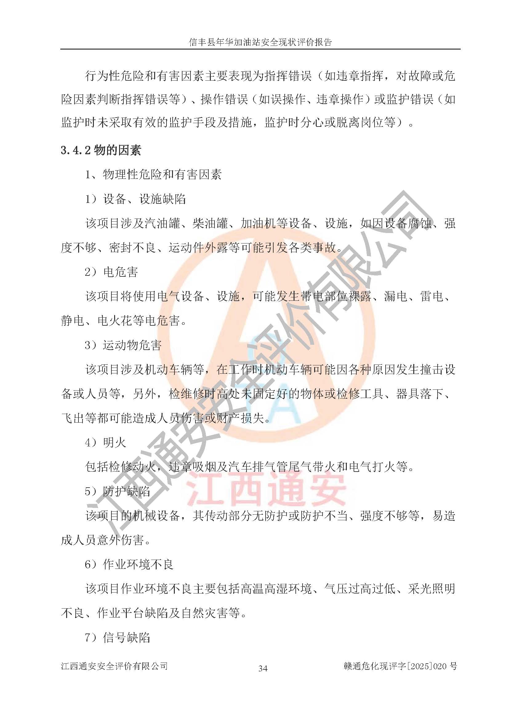 项目简介 | 信丰县年华加油站位于赣州市信丰县大阿镇大阿圩,投资人为肖斌,现有员工4人,其中安全管理人员1人。该加油站2022年03月28日取得了危险化学品经营许可证,登记编号为(赣)信行审危许字[2022]007号,经营方式为零售,许可范围为汽油、柴油,**期限为2022年05月15日至2025年05月14日。该加油站2022年04月02日取得了成品油零售经营批准证书,编号为油零售证书第虔0212号,**期限为2022年03月21日至2027年03月20日。加油站设有3台埋地油罐,分别为1台50m30#柴油卧式隔仓储罐(分为20m3和30m3,其中20m3柴油为预留)、1台50m392#汽油卧式油罐和1台50m392#/95#汽油卧式油罐(其中20m392#汽油,30m395#汽油),总储存能力为115m³(柴油折半),为二级加油站。加油区设有2台双枪加油机和1台四枪加油机。该加油站目前运行正常。 | |||
