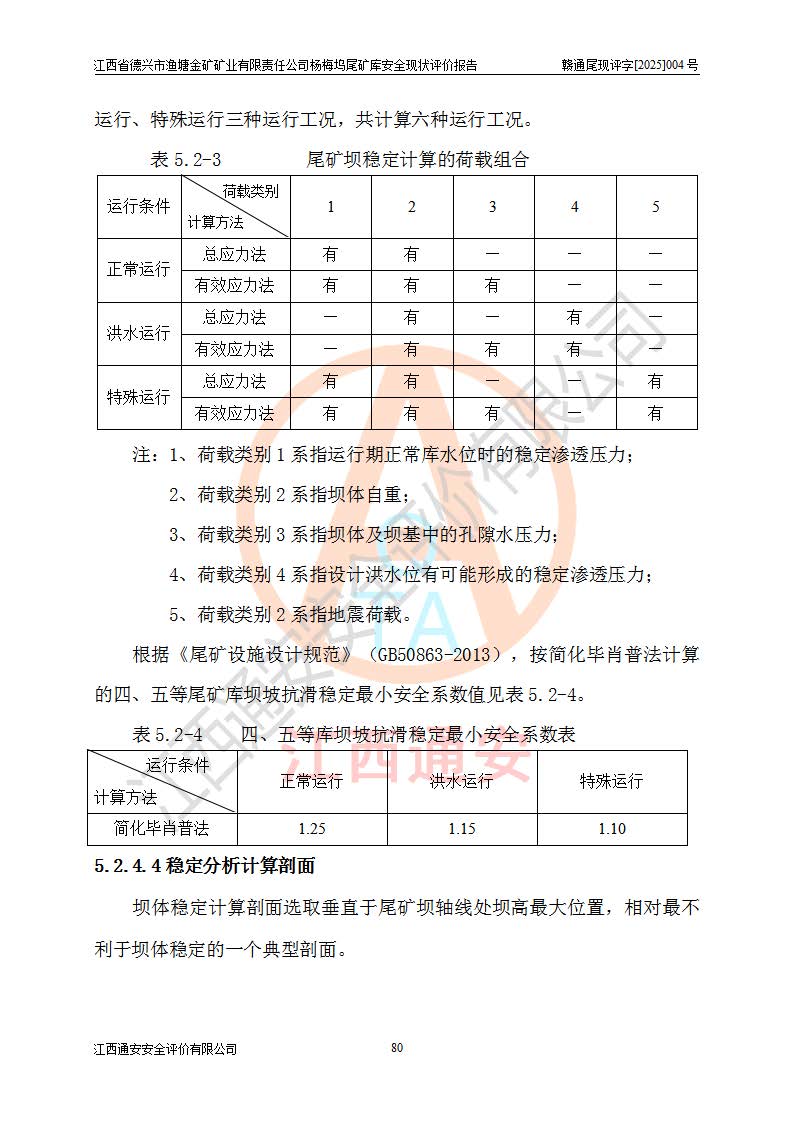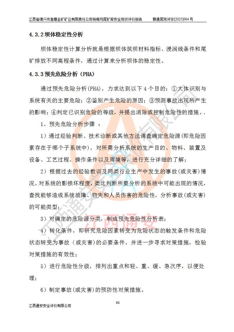 项目简介 | 江西省德兴市渔塘金矿矿业有限责任公司由原渔塘金矿、原石碑金矿和原黄柏洋金矿整合成立。江西省德兴市渔塘金矿矿业有限责任公司杨梅坞尾矿库位于德兴市84°方向直线距离约9.2**处,属德兴市花桥镇黄柏洋村。库区中心地理坐标:东经117°40′39″,北纬28°57′47″,有矿山公路通达杨梅坞尾矿库,交通较为方便。 杨梅坞尾矿库2017年7月由海湾工程有限公司设计,为山谷型尾矿库,总库容39.07×104m3,尾矿终期坝坝顶高程为120.0m,坝高37.53m。初期坝坝顶高程为105.0m,初期坝坝高22.53m,后期采用上游式放矿法,粘土堆积子坝,堆积坝高15.0m。根据《尾矿设施设计规范》(GB50863-2013),尾矿库为四等库,库内主要水工构筑物等级为4级,排洪设施采用200年一遇标准设计,排洪排水设施采用排水斜槽+连接井+排水涵洞的排洪排水方式。尾矿库年入库尾矿量5.88×104m3,可服务5.65年。尾矿库总汇水面积为0.064km2。尾矿库总占地面积约52亩。 杨梅坞尾矿库于2022年4月27日取得江西省应急管理厅颁发安全生产许可证,证书编号(赣)FM安许证字(2019)M1740号,有限期从2022年4月29日到2022年4月28日,依照《非煤矿矿山企业安全生产许可证延期换证工作》的通知,根据***《安全生产许可证条例》、《江西省安全生产条例》、《非煤矿山安全生产许可证实施办法》、《江西省非煤矿矿山企业安全生产许可证办法》规定及非煤矿山安全评价导则的要求,受江西省德兴市渔塘金矿矿业有限责任公司的委托,我公司承担杨梅坞尾矿库延期换证的安全现状评价工作。 | |||