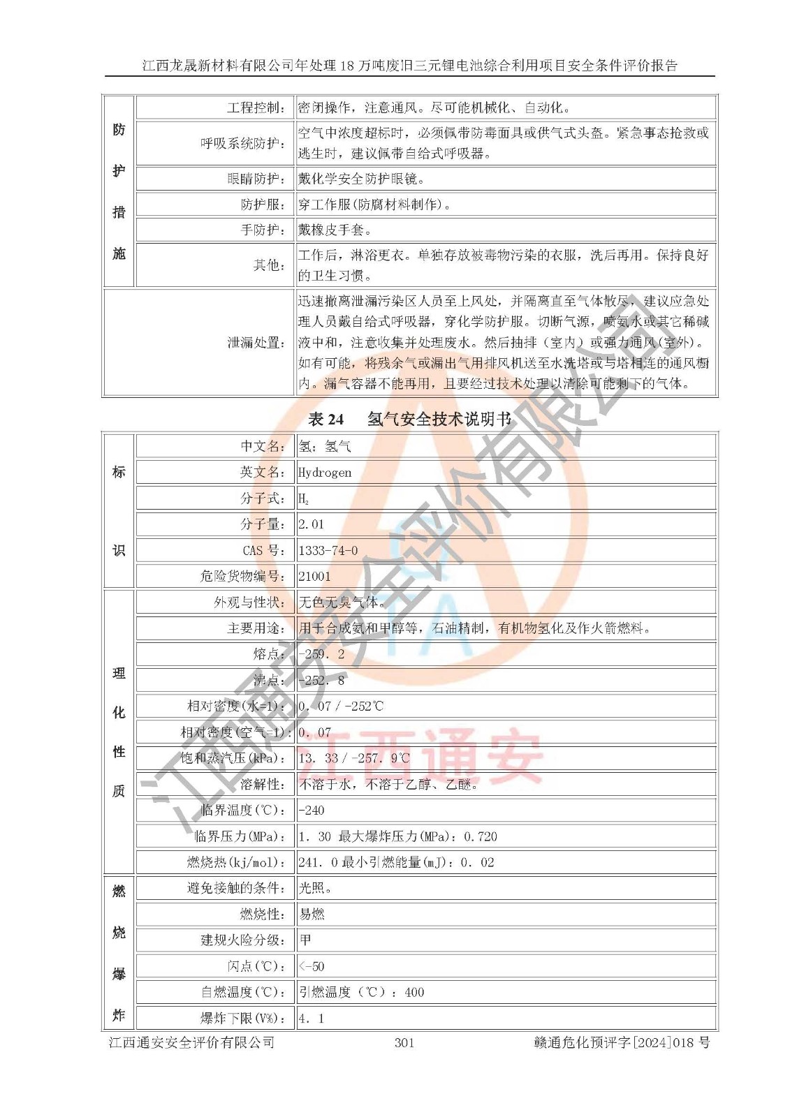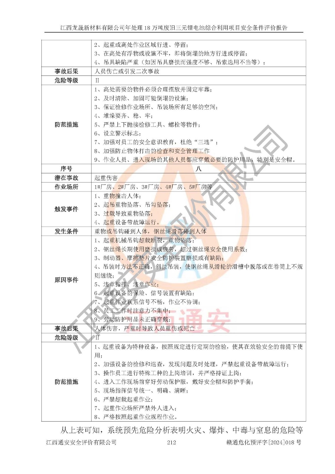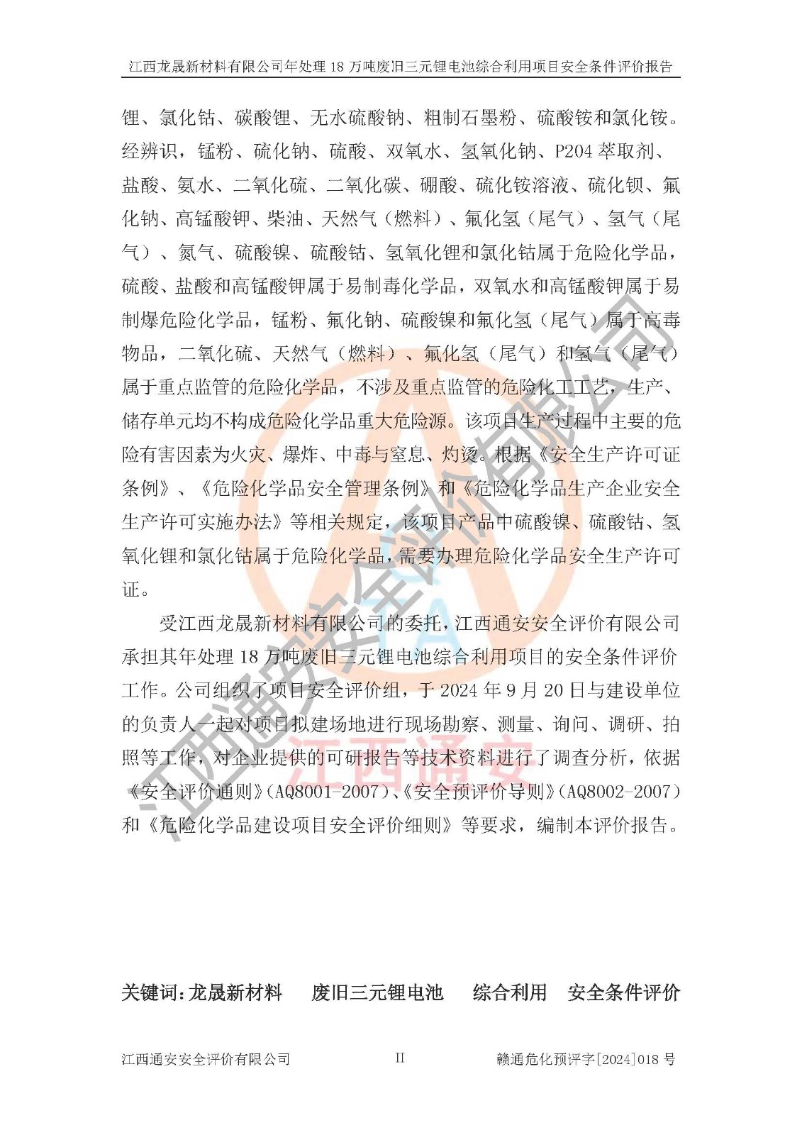 评价结论 | 江西龙晟新材料有限公司年处理18万吨废旧三元锂电池综合利用项目在以后的初步设计、施工图设计和建设施工、安装调试及生产运行中,如能严格执行**有关安全生产的法律法规、规章、标准、规范,认真落实项目可行性研究报告提出的安全对策措施,并合理采纳本报告中提出的安全对策措施及建议,真正做到安全设施与主体工程同时设计、同时施工、同时投入生产和使用,则工程潜在的危险、有害因素可得到**控制,风险在**控制和可接受范围内。 | |||
