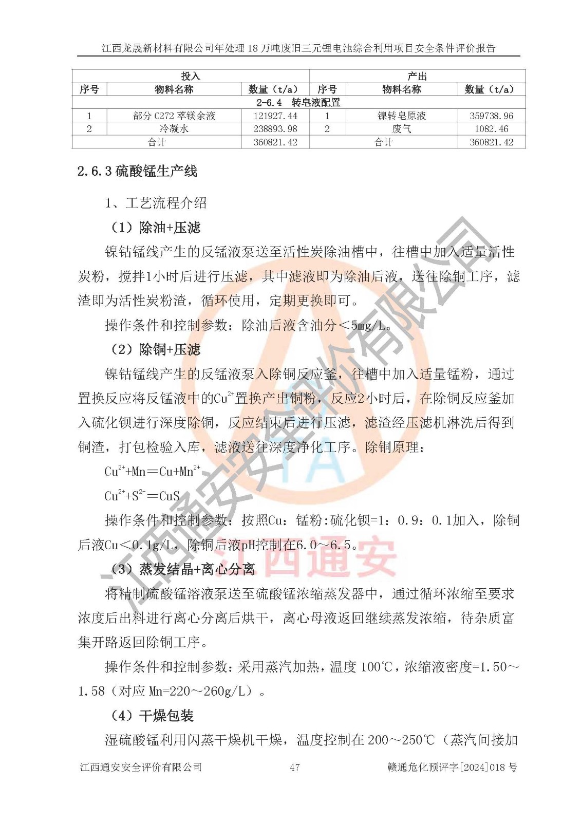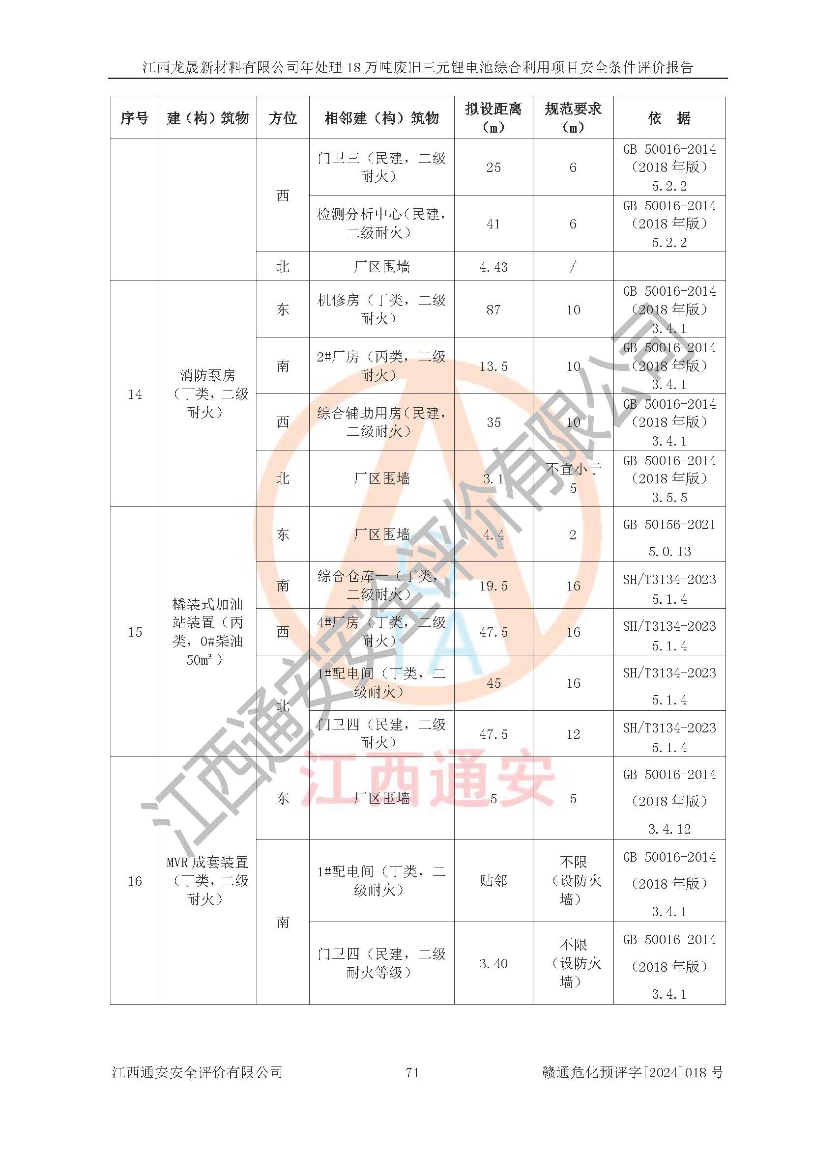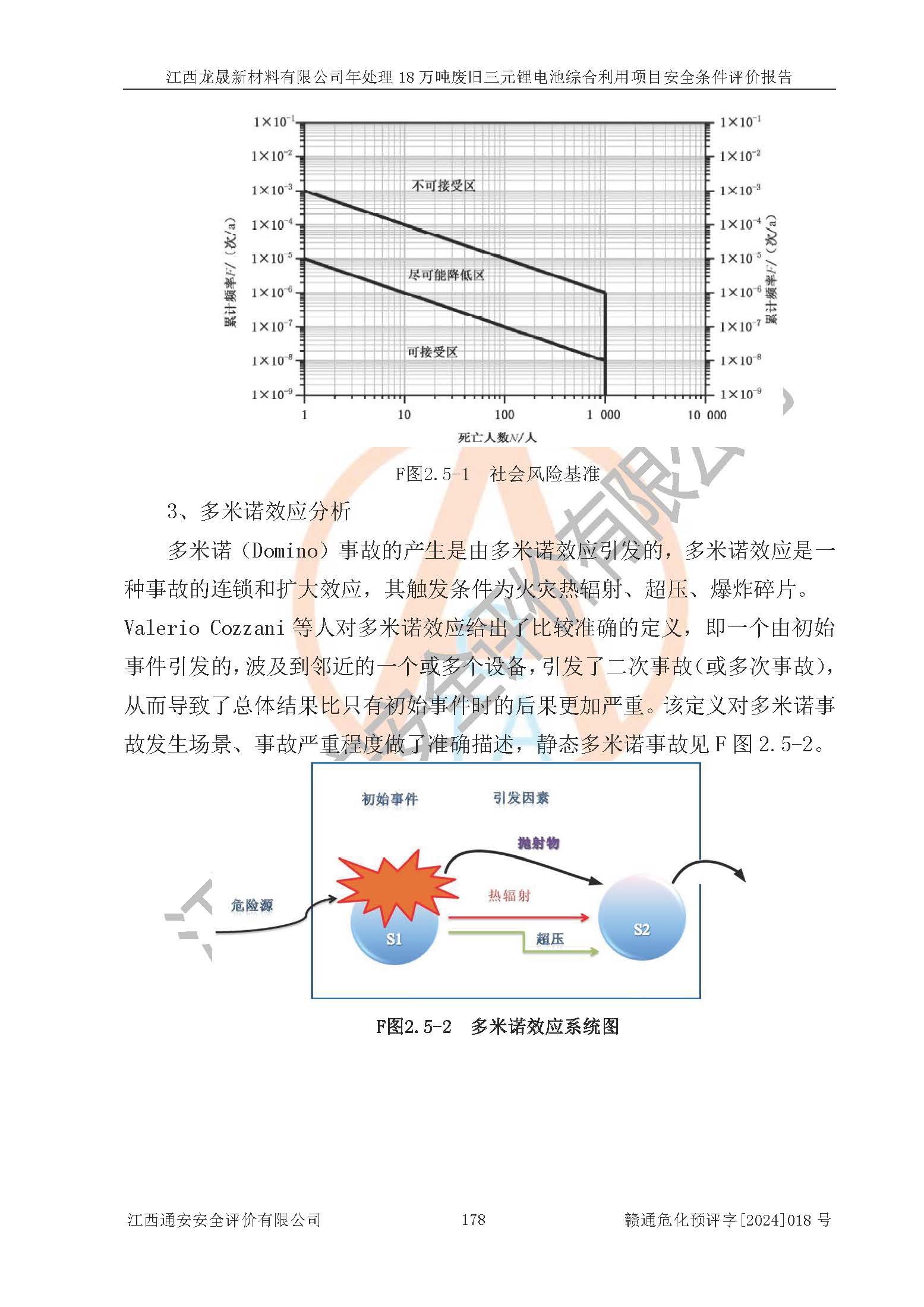 评价结论 | 江西龙晟新材料有限公司年处理18万吨废旧三元锂电池综合利用项目在以后的初步设计、施工图设计和建设施工、安装调试及生产运行中,如能严格执行**有关安全生产的法律法规、规章、标准、规范,认真落实项目可行性研究报告提出的安全对策措施,并合理采纳本报告中提出的安全对策措施及建议,真正做到安全设施与主体工程同时设计、同时施工、同时投入生产和使用,则工程潜在的危险、有害因素可得到**控制,风险在**控制和可接受范围内。 | |||