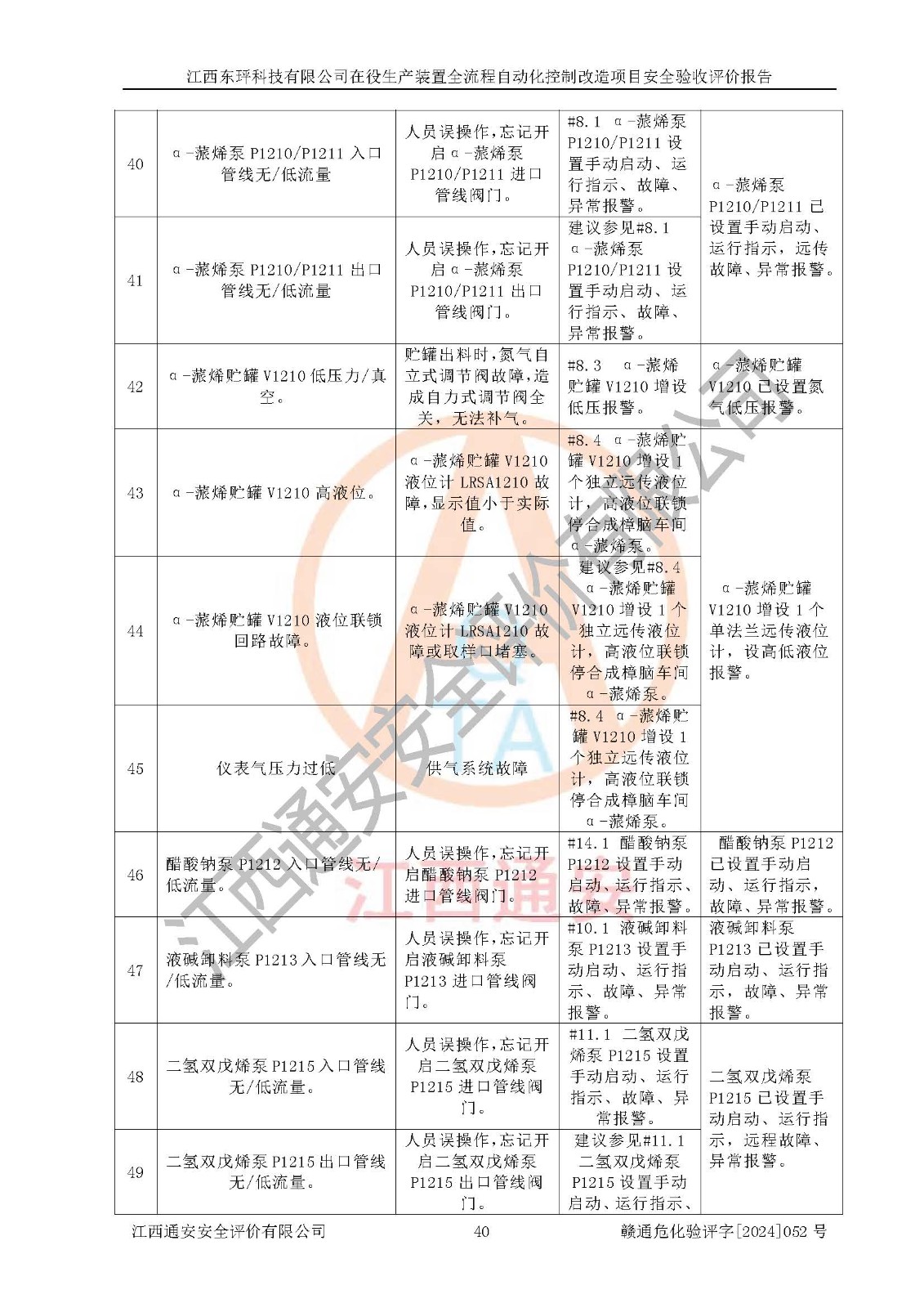 评价结论 | 江西睿达新能源科技有限公司在役生产装置自动化控制改造设计方案中提出的控制措施已得到落实,自动化控制系统设置情况与设计方案一致,满足《江西省应急管理厅关于印发<江西省化工企业自动化提升实施方案>(试行)的通知》(赣应急字〔2021〕190号)的要求,具备自动化控制改造工程竣工验收条件。 | ||||||
