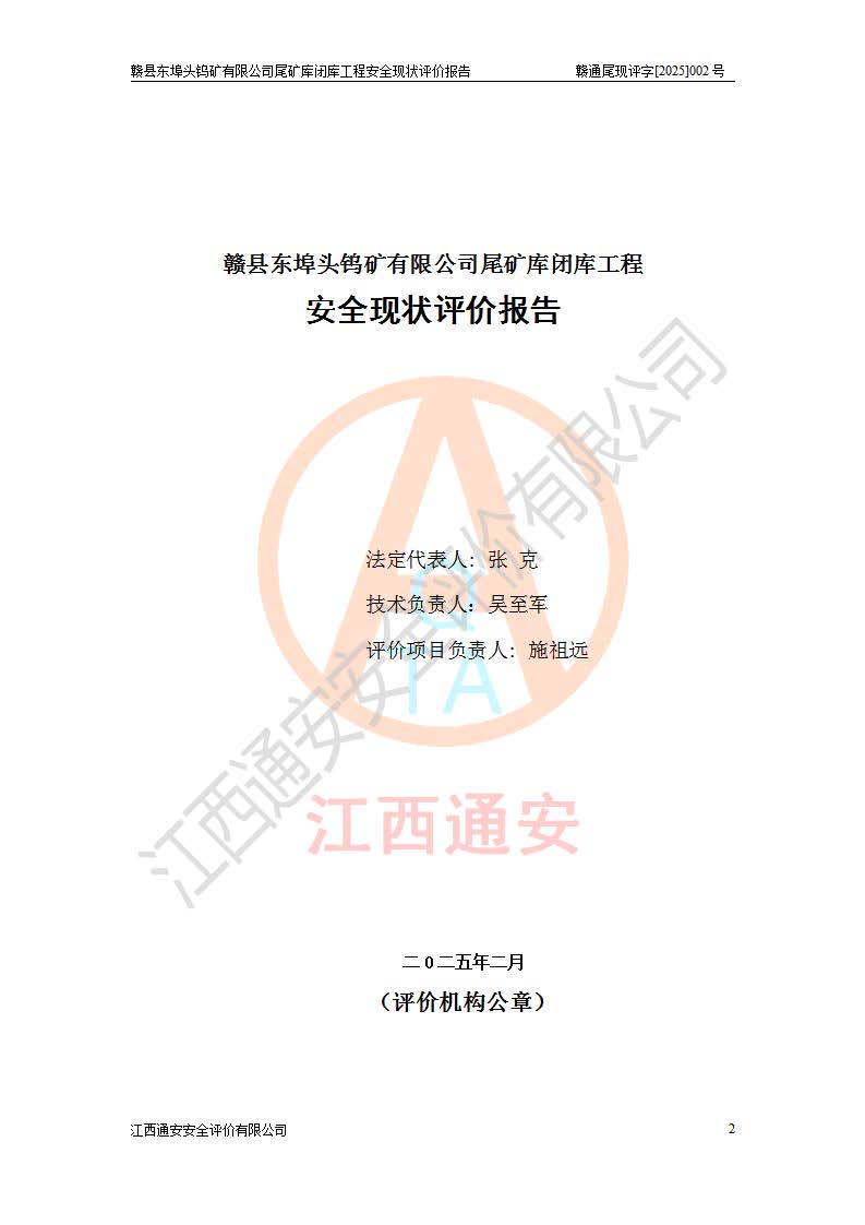 评价报告名称 | 赣县东埠头钨矿有限公司尾矿库闭库工程安全现状评价报告 | |||