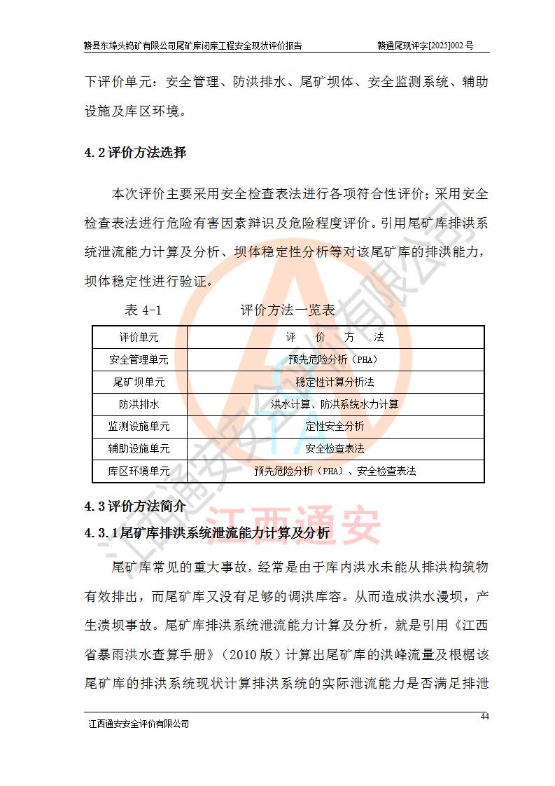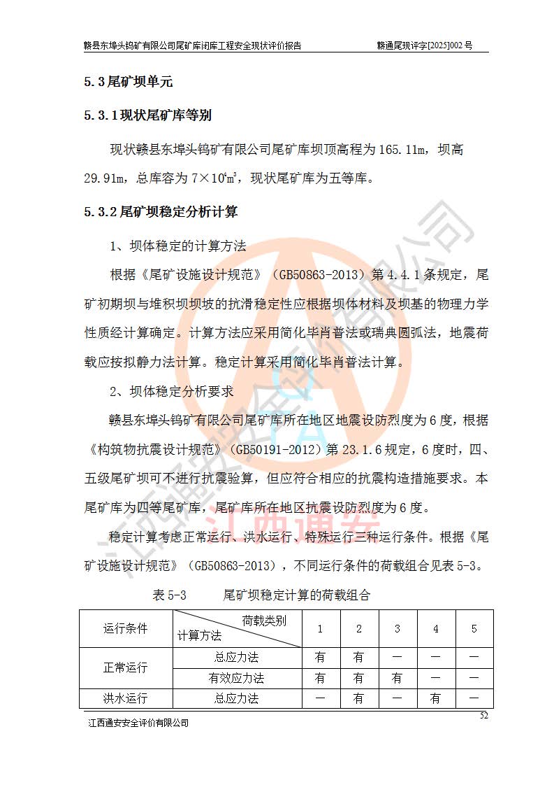 评价结论 | 赣县东埠头钨矿有限公司尾矿库未按回采设计要求进行回采;尾矿坝坝脚未设置排水棱体;尾矿坝稳定性不满足规范要求;干滩长度不满足要求;排洪设施未进行结构质量检测,未设置人工监测设施,堆积坝外坡比陡于设计坡比,尾矿库未配备专职安全生产管理人员、特种作业人员及专业技术人员等。根据**矿山安全监察局矿安〔2022〕88号文《金属非金属矿山重大事故隐患判定标准》、**矿山安全监察局矿安〔2024〕41号文《金属非金属矿山重大事故隐患判定标准补充情形》,尾矿库存在重大事故隐患。赣县东埠头钨矿有限公司尾矿库应尽快完成所有闭库程序,闭库设计应按正常运行标准进行闭库整治设计,**尾矿库防洪能力和尾矿坝稳定性满足规程要求,维持尾矿库闭库后长期安全稳定。 | |||
