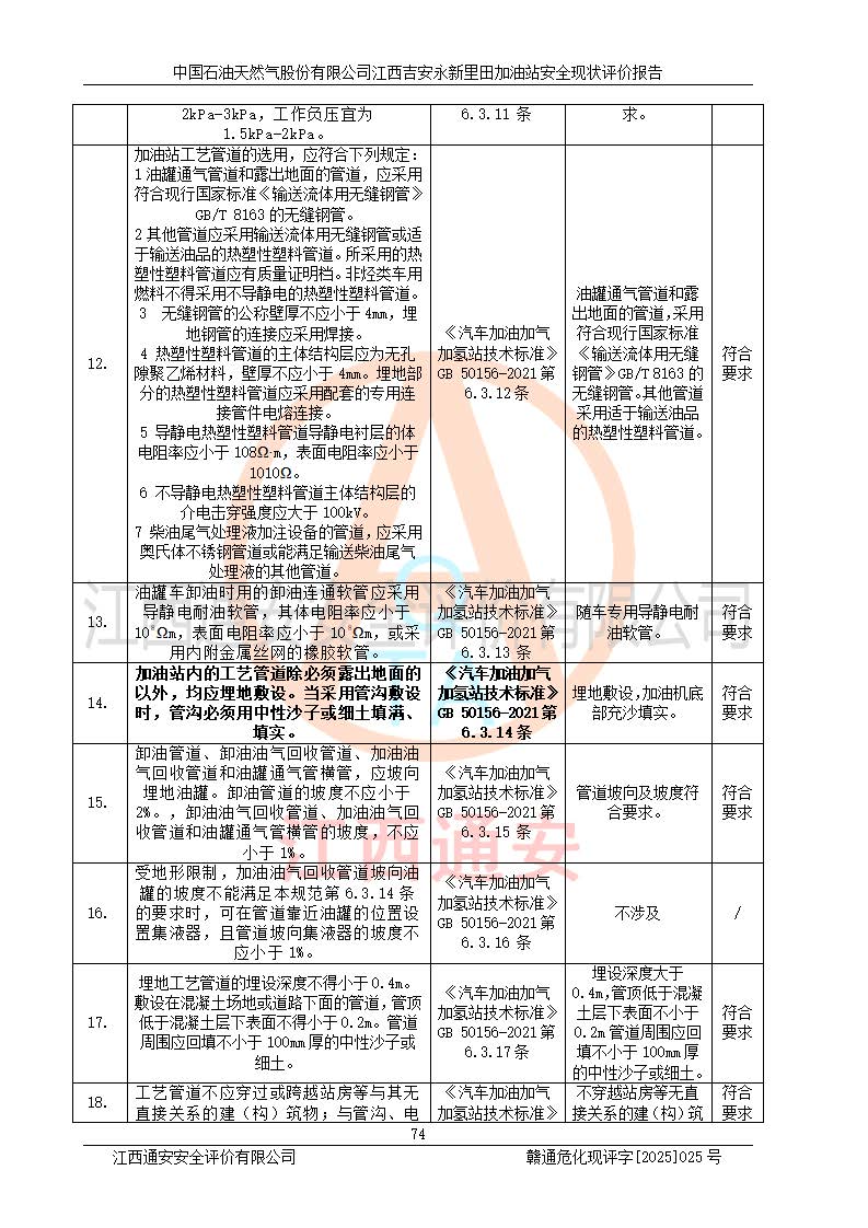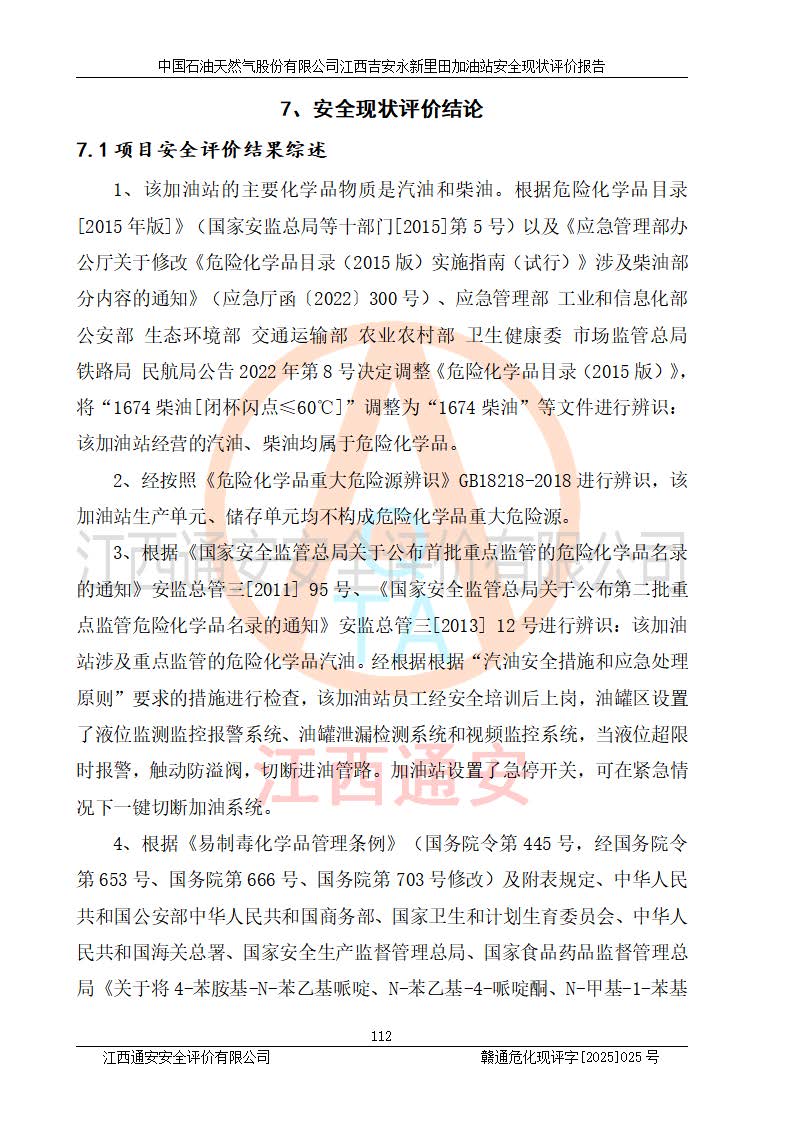 其它 | 在对该项目危险、有害因素辨识分析的基础上,运用安全检查表、预作业条件危险性分析法、危险度评价、重大事故后果分析结果等评价方法对该项目进行了分析评价,评价结果如下: 1、该项目位于江西省吉安市永新县里田镇高速路口旁,符合当地规划,与周边环境的距离符合有关标准、规范的要求。 2、总图布置分区明确,布局合理,各建构筑物的防火间距满足规范要求。 3、该项目无**明令淘汰的工艺,设备、设施与工艺条件、内部介质相适应,特种设备及设施较齐全,按规定设置防雷、防静电接地,爆炸危险环境加油机按要求采用防爆型,符合相关标准规范要求。 5、企业设置了安全生产管理机构,配备了专职安全生产管理人员,建立了安全生产责任制和安全生产管理制度,编制了岗位操作规程,编制了生产安全事故应急预案,人员经过相应的培训,企业的安全生产管理正常。 6、作业条件危险性评价结果:在选定的评价单元中,作业危险程度均为“一般危险,需要注意”,作业条件相对安全。 7、危险度评价结果:汽油储罐的危险程度为**危险。油罐采用双层罐埋地设置,按要求设置了通气管,并装设了阻火器;设置了液位监测报警系统和紧急切断系统,埋地加油管道设置双层管道及双层管道渗漏检测系统,可以满足安全生产条件要求。 评价结论: 中国石油天然气股份有限公司江西吉安永新里田加油站符合《汽车加油加气加氢站技术标准》GB50156-2021等标准规范的要求,安全风险可控,满足危险化学品经营的安全条件。 | ||||
