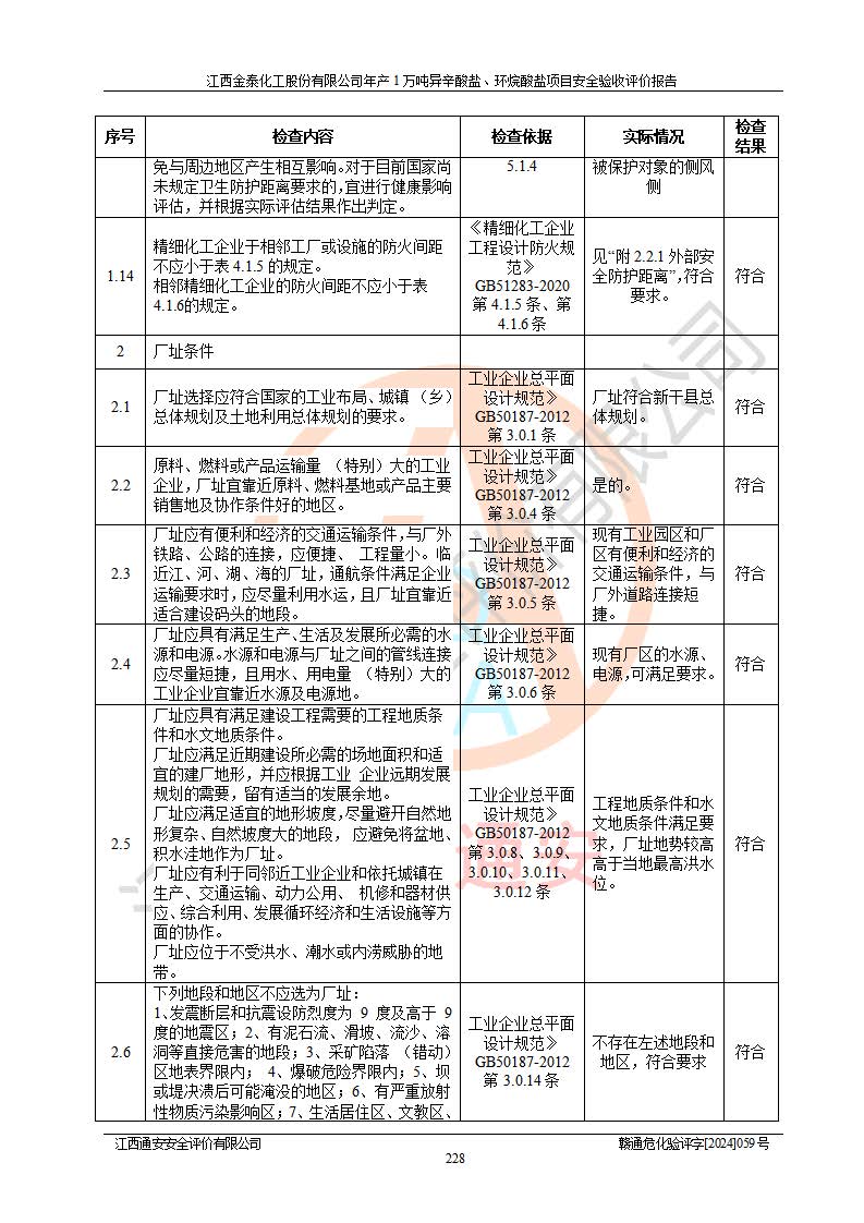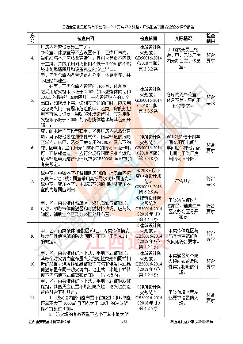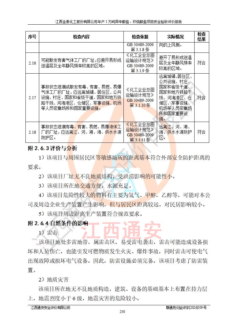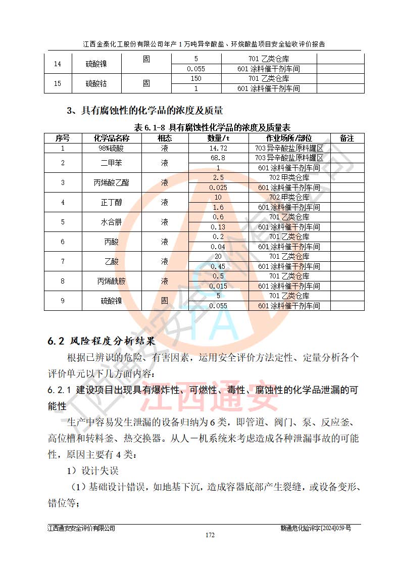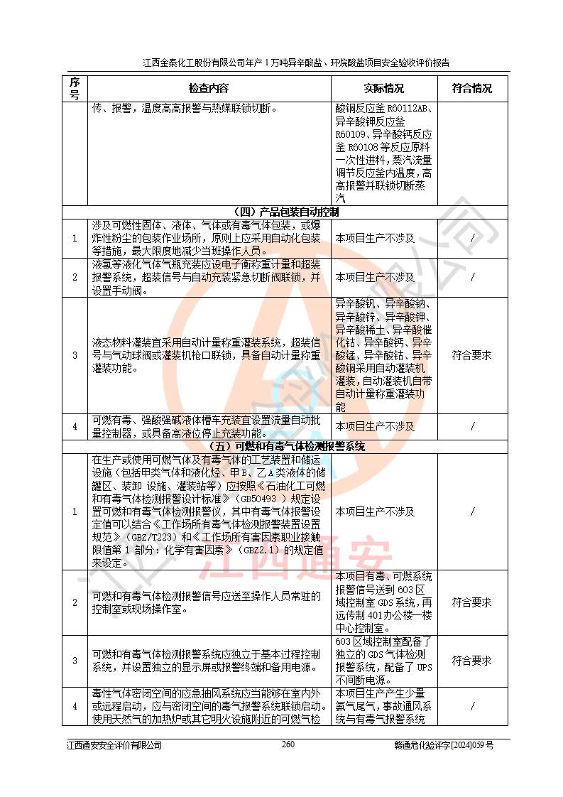 评价结论 | 江西金泰化工股份有限公司年产1万吨异辛酸盐、环烷酸盐项目的生产装置现场情况与设计图纸一致,有关从业人员资质符合《江西省危险化学品安全专项整治三年行动实施方案》要求,自动化控制满足《江西省应急管理厅关于印发<江西省化工企业自动化提升实施方案>(试行)的通知》(赣应急字〔2021年〕190号)要求,安全设施及安全管理符合**及有关部门关于安全生产法律、法规、标准的要求,安全风险是受控制的,其风险程度是可以接受的,符合安全生产条件,能够满足安全生产的要求,具备安全设施“三同时”验收条件。 | |||