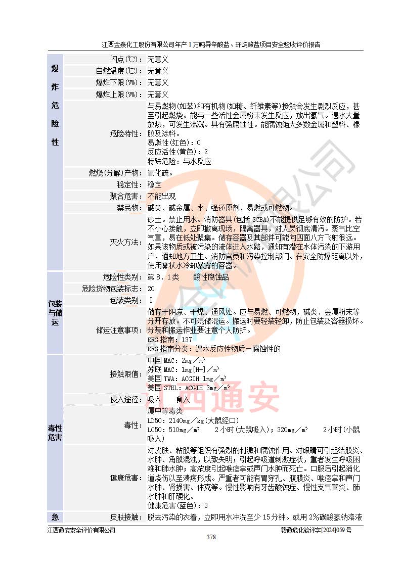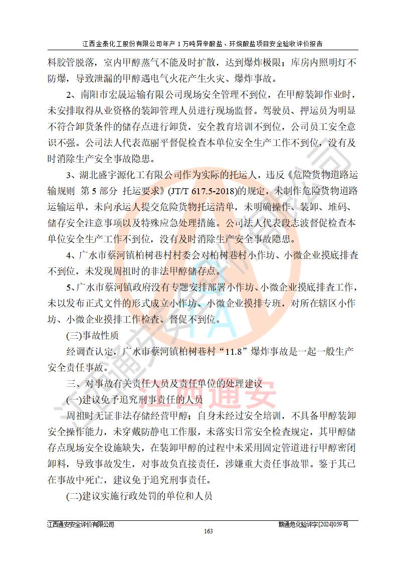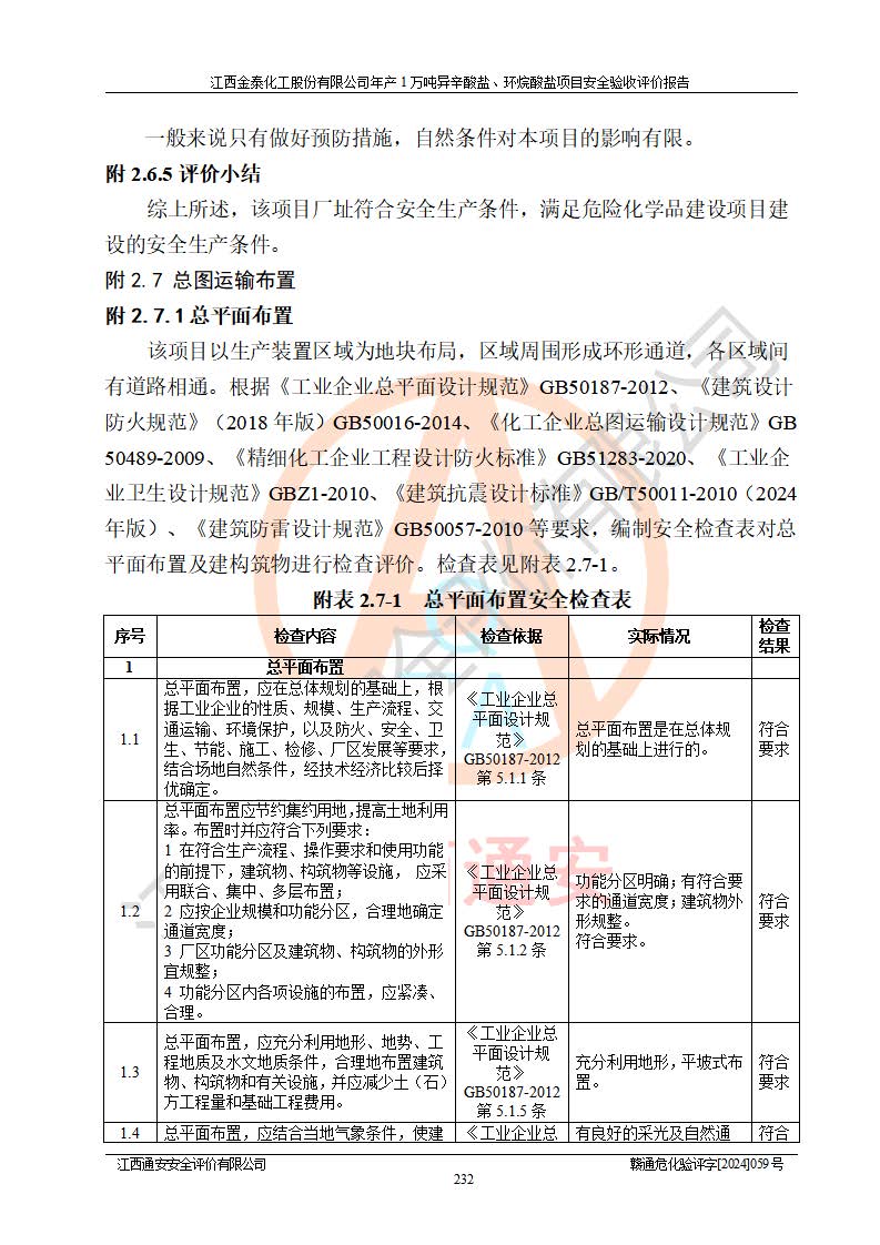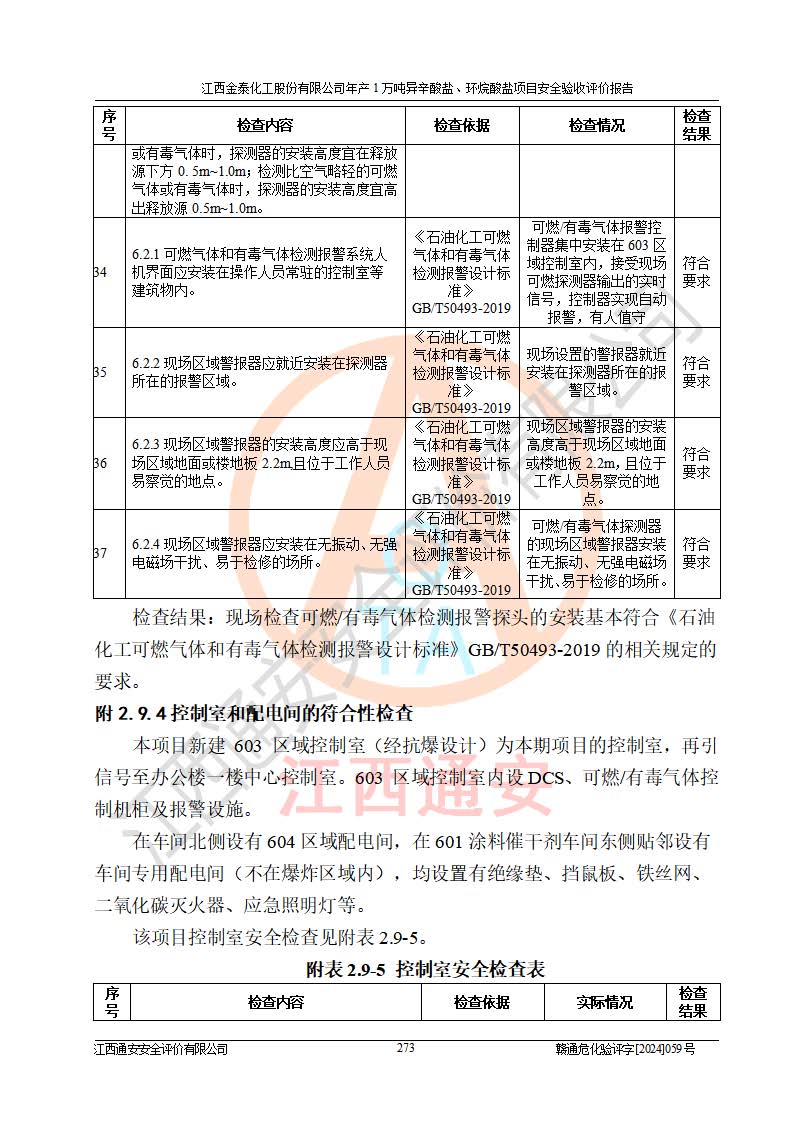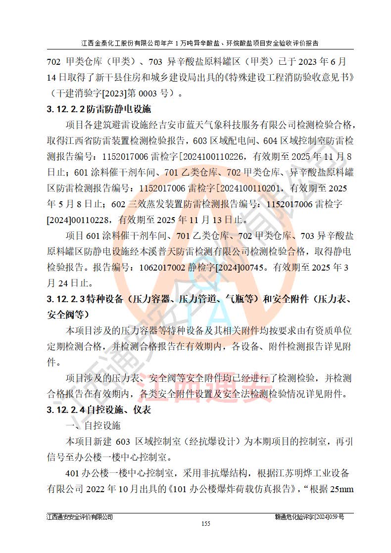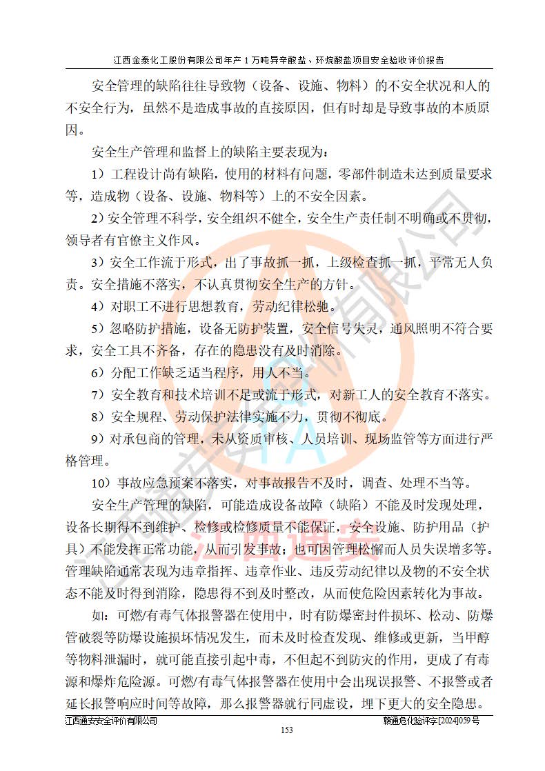评价结论 | 江西金泰化工股份有限公司年产1万吨异辛酸盐、环烷酸盐项目的生产装置现场情况与设计图纸一致,有关从业人员资质符合《江西省危险化学品安全专项整治三年行动实施方案》要求,自动化控制满足《江西省应急管理厅关于印发<江西省化工企业自动化提升实施方案>(试行)的通知》(赣应急字〔2021年〕190号)要求,安全设施及安全管理符合**及有关部门关于安全生产法律、法规、标准的要求,安全风险是受控制的,其风险程度是可以接受的,符合安全生产条件,能够满足安全生产的要求,具备安全设施“三同时”验收条件。 | |||