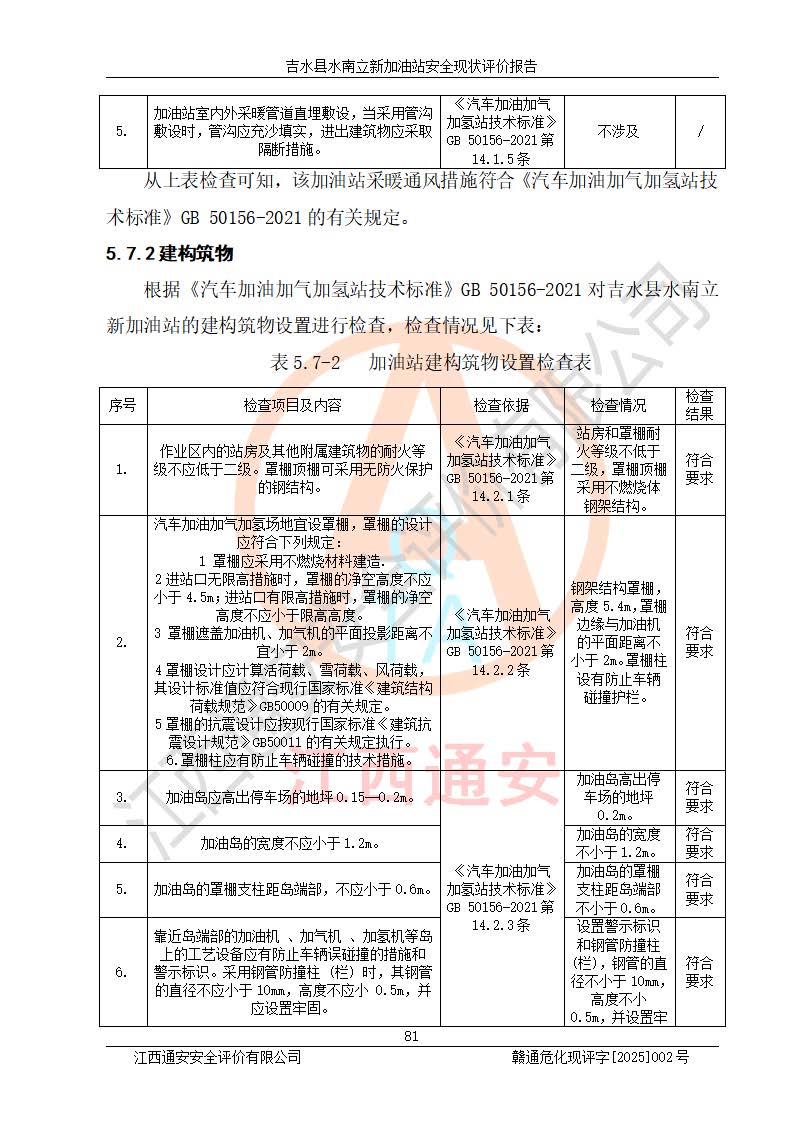 评价结论 | 吉水县水南立新加油站站址合理,周边环境良好,与敏感防护目标间距符合规范要求,站区建构筑物之间的防火间距、耐火等级符合标准要求,与总平面布置图一致,加油卸油工艺及设备设施合理,工艺布置得当,防雷设施经检测合格,采取的工艺安全设施符合规范要求;该加油站制定了安全管理制度和操作规程,人员经培训合格后上岗,安全管理人员经考核合格并取得安全合格证,主要负责人于2024年05月08日取得安全生产知识和管理能力考核合格证,能按照法律法规要求开展安全生产管理工作。 吉水县水南立新加油站符合《汽车加油加气加氢站技术标准》GB50156-2021等标准规范的要求,安全风险可控,满足危险化学品经营的安全条件。 | |||