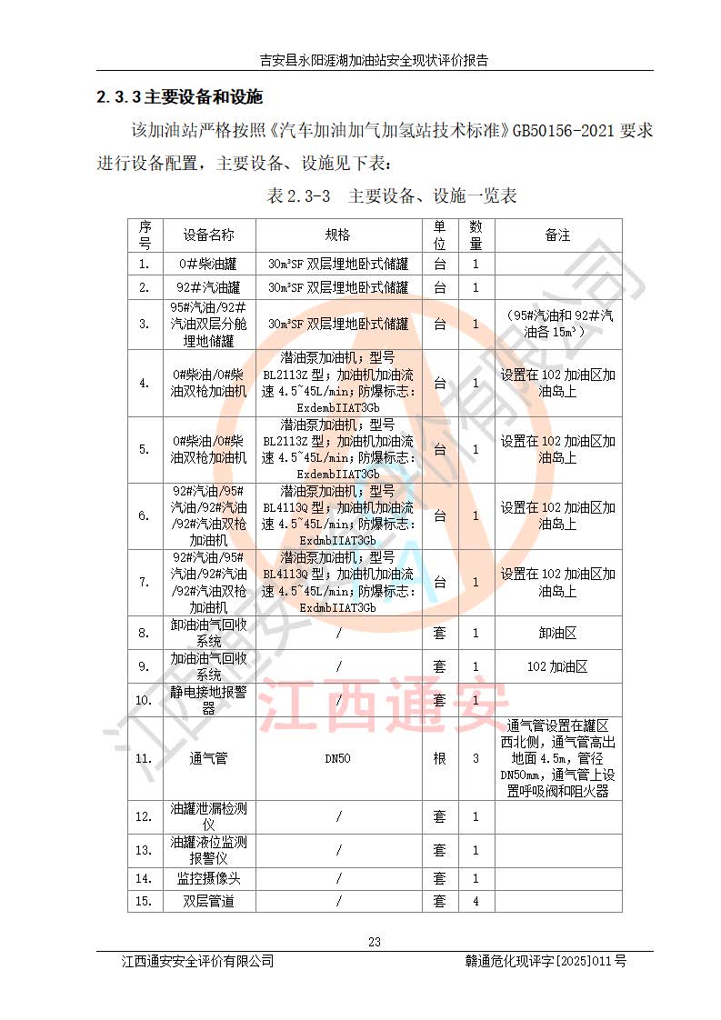 项目简介 | 吉安县永阳涯湖加油站于2019年8月16日经吉安县市场监督管理局核准注册成立,营业场所位于江西省吉安市吉安县永阳镇涯湖村。类型:个人独资企业,投资人:张爱芳,营业执照统一社会信用代码为:91360821MA38RQ3152。营业执照核准经营范围:成品油零售(依法须经批准的项目,经相关部门批准后方可开展经营活动)。 吉安县永阳涯湖加油站占地面积8648.6㎡,加油站中设有1台0#柴油/0#柴油双枪加油机、1台0#柴油/0#柴油双枪加油机、1台92#汽油/95#汽油/92#汽油/92#汽油4枪加油机、1台92#汽油/95#汽油/92#汽油/92#汽油4枪加油机布置;1台30m³0#柴油双层埋地储罐、1台30m³92#汽油双层埋地储罐、1台30m³95#汽油/92#汽油双层分舱埋地储罐(95#汽油和92#汽油各15m³),油品*大储存能力为75m³(柴油罐容积折半计入油罐总容积),属三级加油站,汽油卸油、加油设置了油气回收系统。 吉安县永阳涯湖加油站于2022年4月1日经吉安市应急管理局核准,换发了新的《危险化学品经营许可证》,证书编号:赣吉危化经字[2022]360800000016号,许可范围:成品油。**期2022年5月23日至2025年5月22日。 吉安县永阳涯湖加油站2020年9月7日经吉安市商务局核准,换取了新的《成品油零售经营批准证书》,证书编号:油零售证书第吉0004号,批准从事成品油(汽油、柴油)零售业务。证书**期至2020年9月7日至2025年9月6日。 | ||||