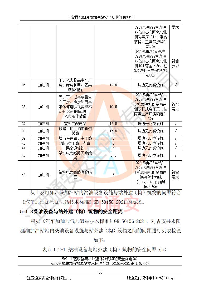 其它 | 在对该项目危险、有害因素辨识分析的基础上,运用安全检查表、预作业条件危险性分析法、危险度评价、重大事故后果分析结果等评价方法对该项目进行了分析评价,评价结果如下: 1、该项目位于江西省吉安市吉安县永阳镇涯湖村,符合当地规划,与周边环境的距离符合有关标准、规范的要求。 2、总图布置分区明确,布局合理,各建构筑物的防火间距满足规范要求。 3、该项目无**明令淘汰的工艺,设备、设施与工艺条件、内部介质相适应,特种设备及设施较齐全,按规定设置防雷、防静电接地,爆炸危险环境加油机按要求采用防爆型,符合相关标准规范要求。 5、企业设置了安全生产管理机构,配备了专职安全生产管理人员,建立了安全生产责任制和安全生产管理制度,编制了岗位操作规程,编制了生产安全事故应急预案,人员经过相应的培训,企业的安全生产管理正常。 6、作业条件危险性评价结果:在选定的评价单元中,作业危险程度均为“一般危险,需要注意”,作业条件相对安全。 7、危险度评价结果:汽油储罐的危险程度为中度危险。油罐采用双层罐埋地设置,按要求设置了通气管,并装设了阻火器;设置了液位监测报警系统和紧急切断系统,埋地加油管道设置双层管道,可以满足安全生产条件要求。 评价结论: 吉安县永阳涯湖加油站符合《汽车加油加气加氢站技术标准》GB50156-2021等标准规范的要求,安全风险可控,满足危险化学品经营的安全条件。 | ||||
