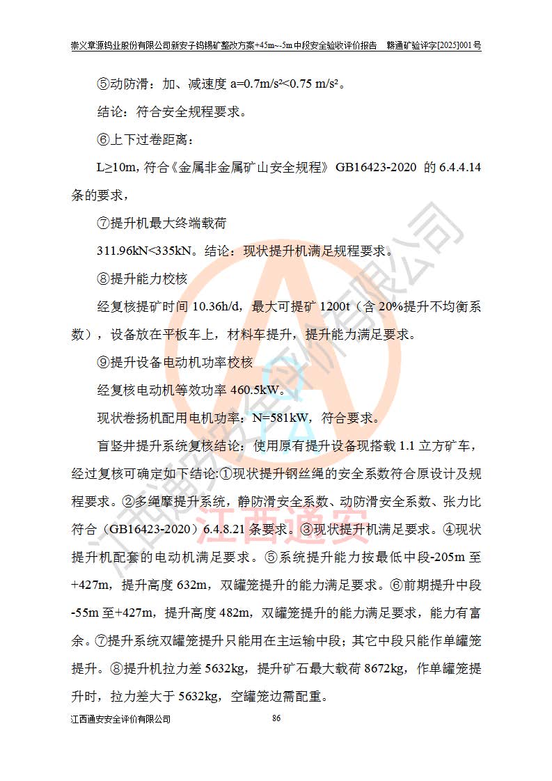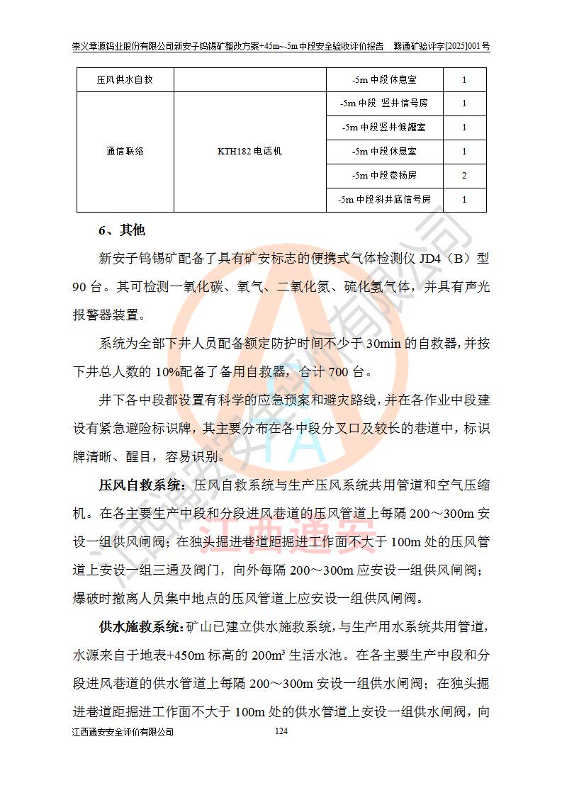 其它 | 崇义章源钨业股份有限公司新安子钨锡矿地下开采整改方案深部+45m~-5m中段一期工程建设项目由具有资质的施工、监理单位施工建设及监理,矿山进行建设、施工以来,能够按照地下矿山安全设施“三同时”的要求开展各项工作,对建设过程中存在的安全管理问题,安全技术问题进行整改,符合安全设施与主体工程同时设计、同时施工、同时投入生产和使用的要求;其安全设施检测检验结果合格,已建项目的安全设施总体运行**、技术措施得当;安全生产管理体系、组织机构健全,制订的各项安全生产管理制度和安全技术规程,能在生产过程中得到**遵守和实施。目前,其安全设施运行正常,对照《金属非金属地下矿山建设项目安全设施竣工验收表》进行查找崇义章源钨业股份有限公司新安子钨锡矿地下开采整改方案安全设施设计深部+45m~-5m中段一期工程竣工验收项目中,否决项的检查结论均为“符合”,检查项共195项,否决项53项,一般项142项,一般项不合格4项,验收检查项总数中检查结论为“不符合”项为2.82%,不符合在验收检查项总数中占比<5%。 综上所述,崇义章源钨业股份有限公司新安子钨锡矿地下开采整改方案深部+45m~-5m中段一期工程建设项目安全设施符合《崇义章源钨业股份有限公司新安子钨锡矿地下开采整改方案安全设施设计》、《崇义章源钨业股份有限公司新安子钨锡矿地下开采工程安全设施变更设计》及**有关法律法规、标准、规章、规范的规定要求,具备安全设施验收的条件。 | ||||